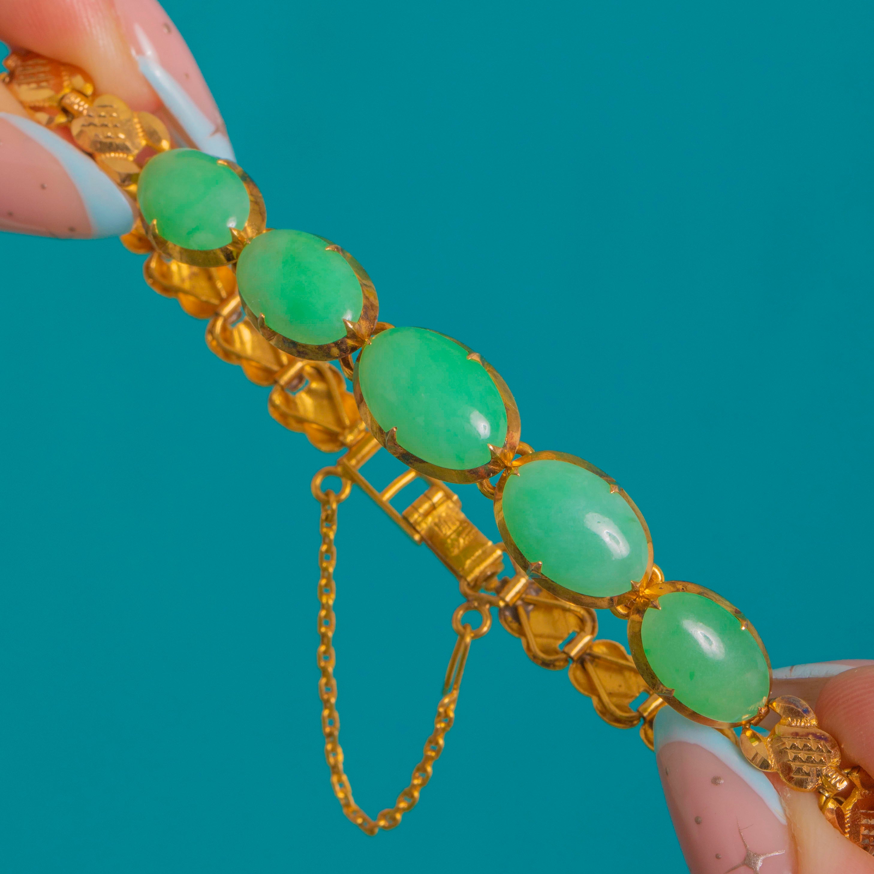 EXCELLENT: Jade cabochons are bright and glossy with no obvious chips or abrasions visible, showing only the lightest natural surface wear. The 18ct Gold mounts, articulation and clasp are crisp and secure, with minimal wear and well-preserved engraving; claws are even and intact. The box clasp fastens securely and the safety chain is present and in good order, indicating careful past wear.