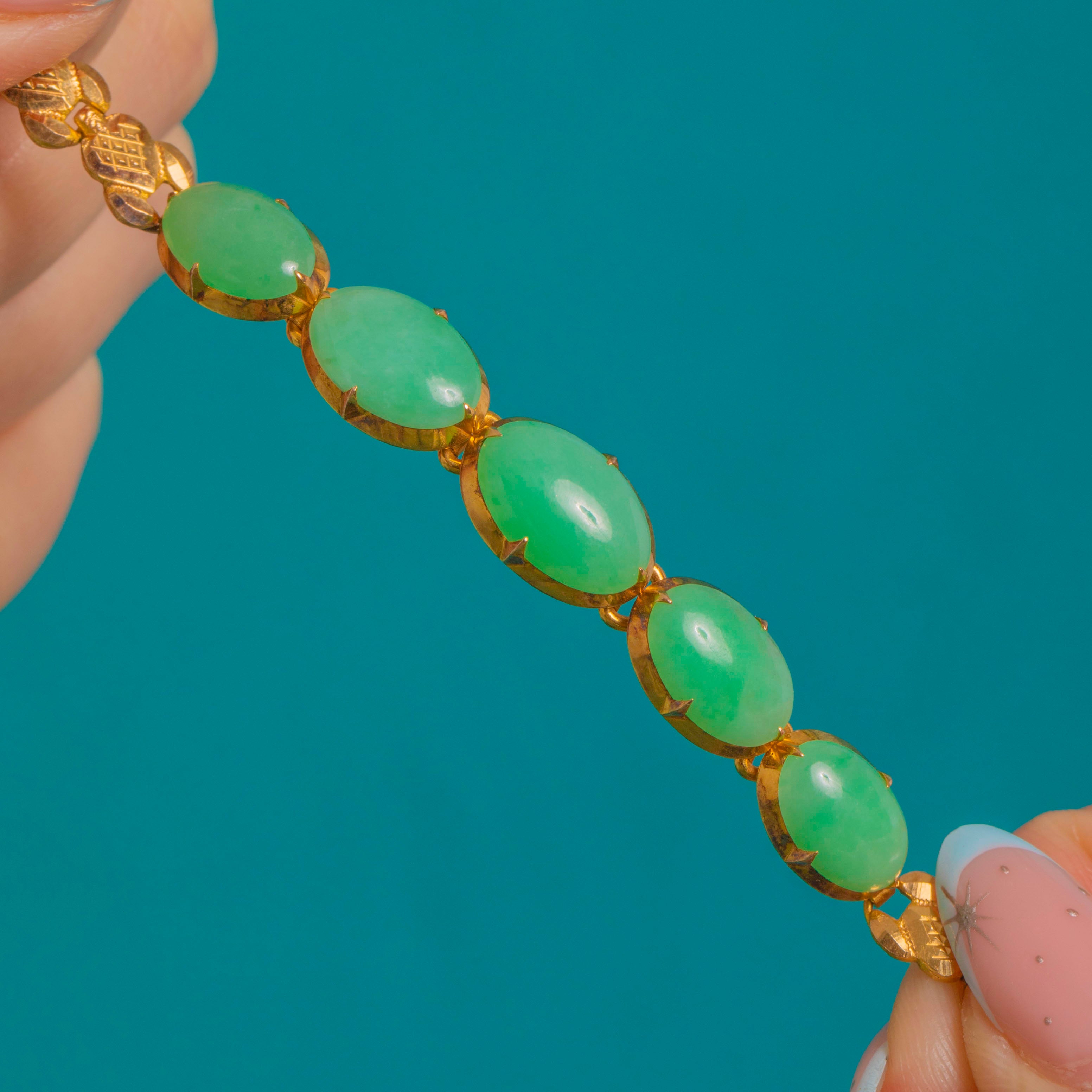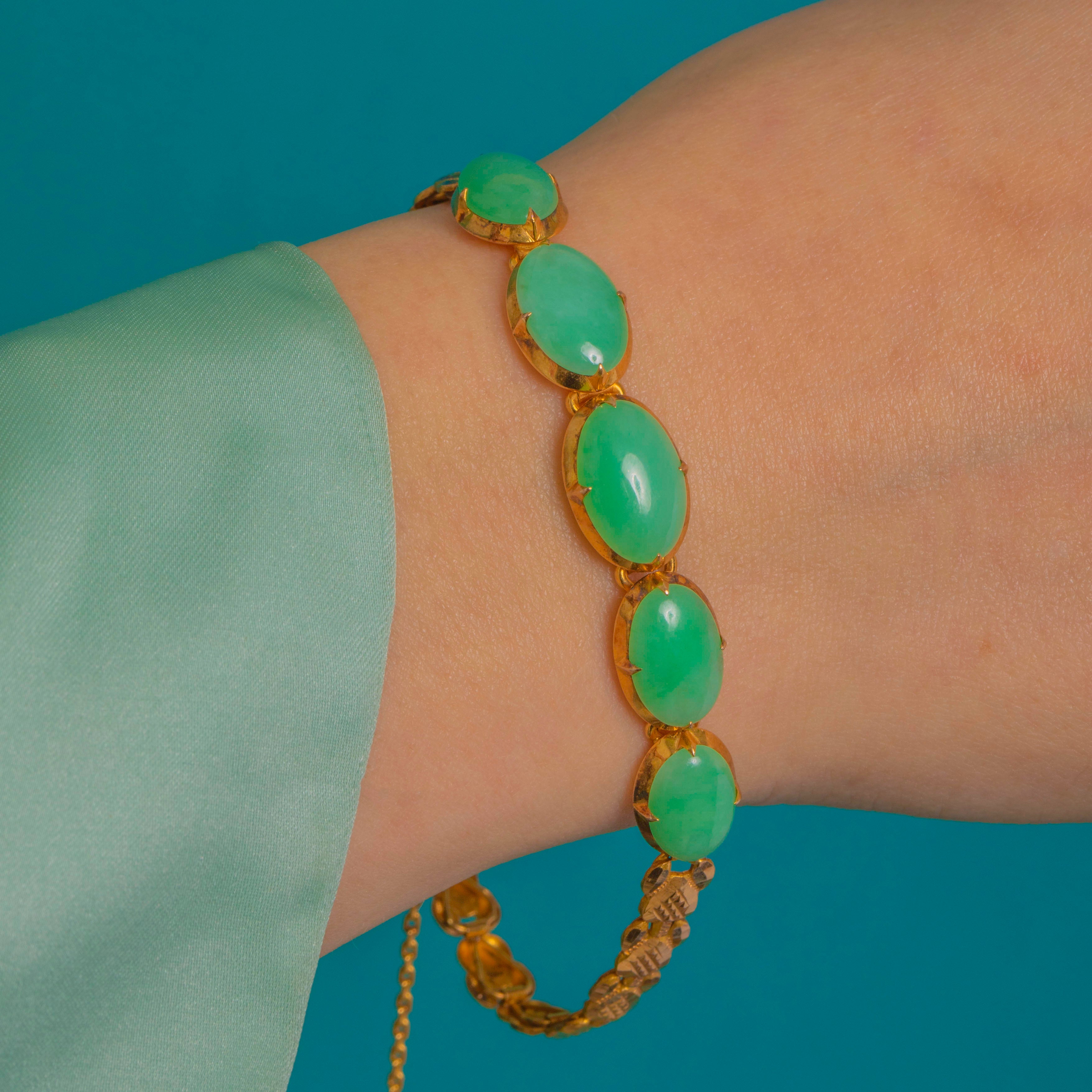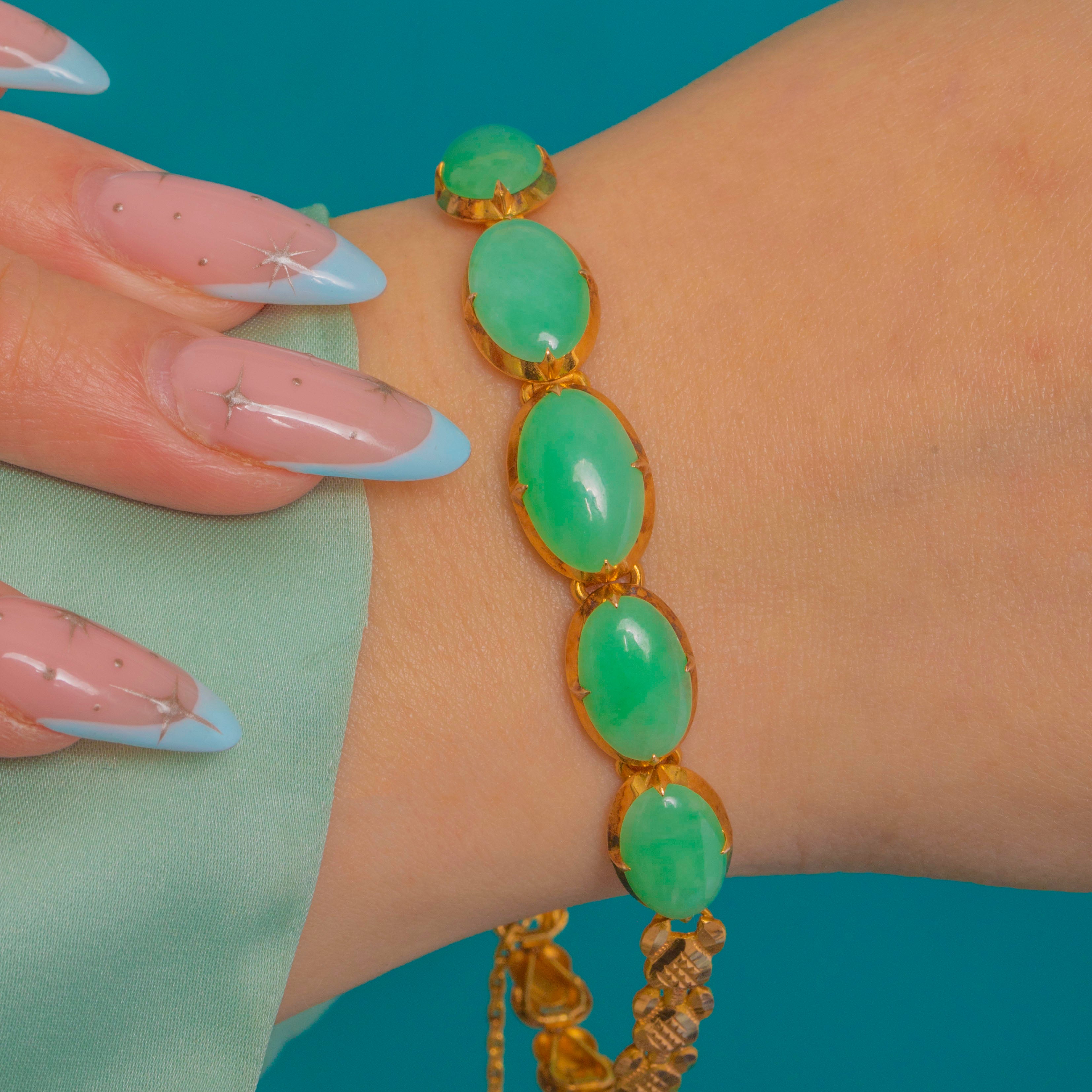 A serene run of soft apple-to-mint green Jade cabochons glows against rich 18ct Gold in this elegant line bracelet. Each oval cabochon is set in slim collet mounts with fine claws and open sides, allowing light to play across the glossy, lightly mottled stones as the articulated links move fluidly on the wrist.