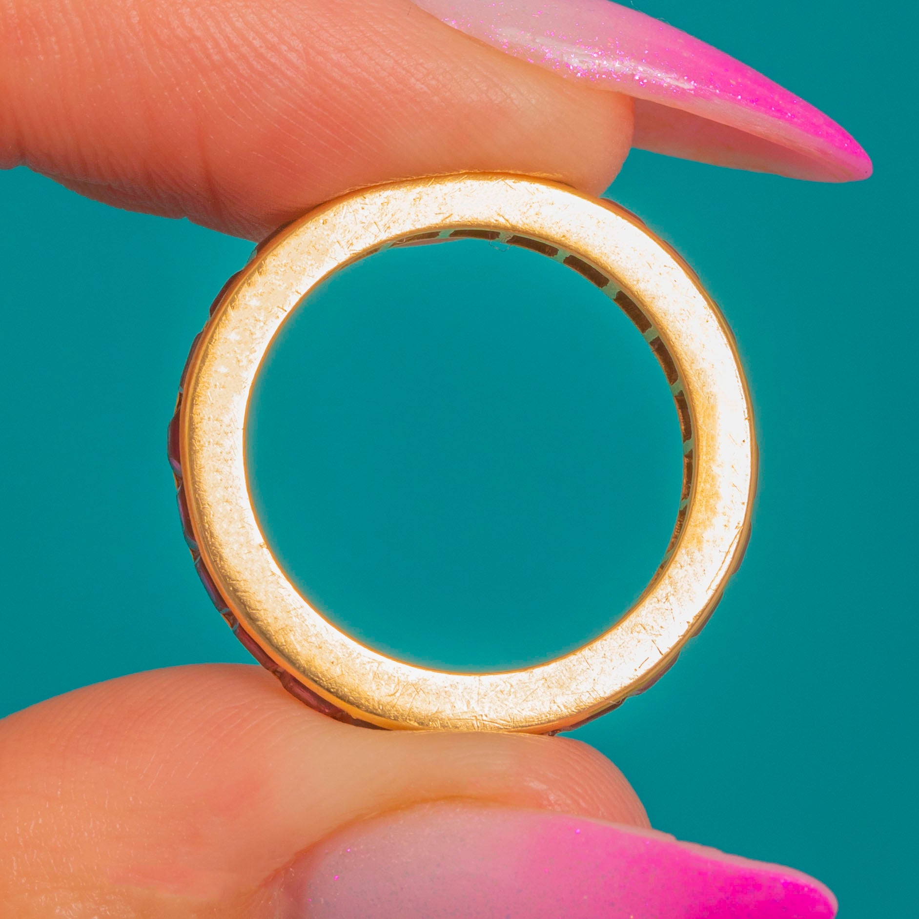 A sleek Art Deco treasure, this full-eternity ring is crafted in rich 18ct Gold and set with a seamless ribbon of Natural Rubies. The channel-set, geometric line of Ruby squares creates a vivid pink-red glow all the way around the finger, delivering that coveted Deco poise with a fresh, modern feel.