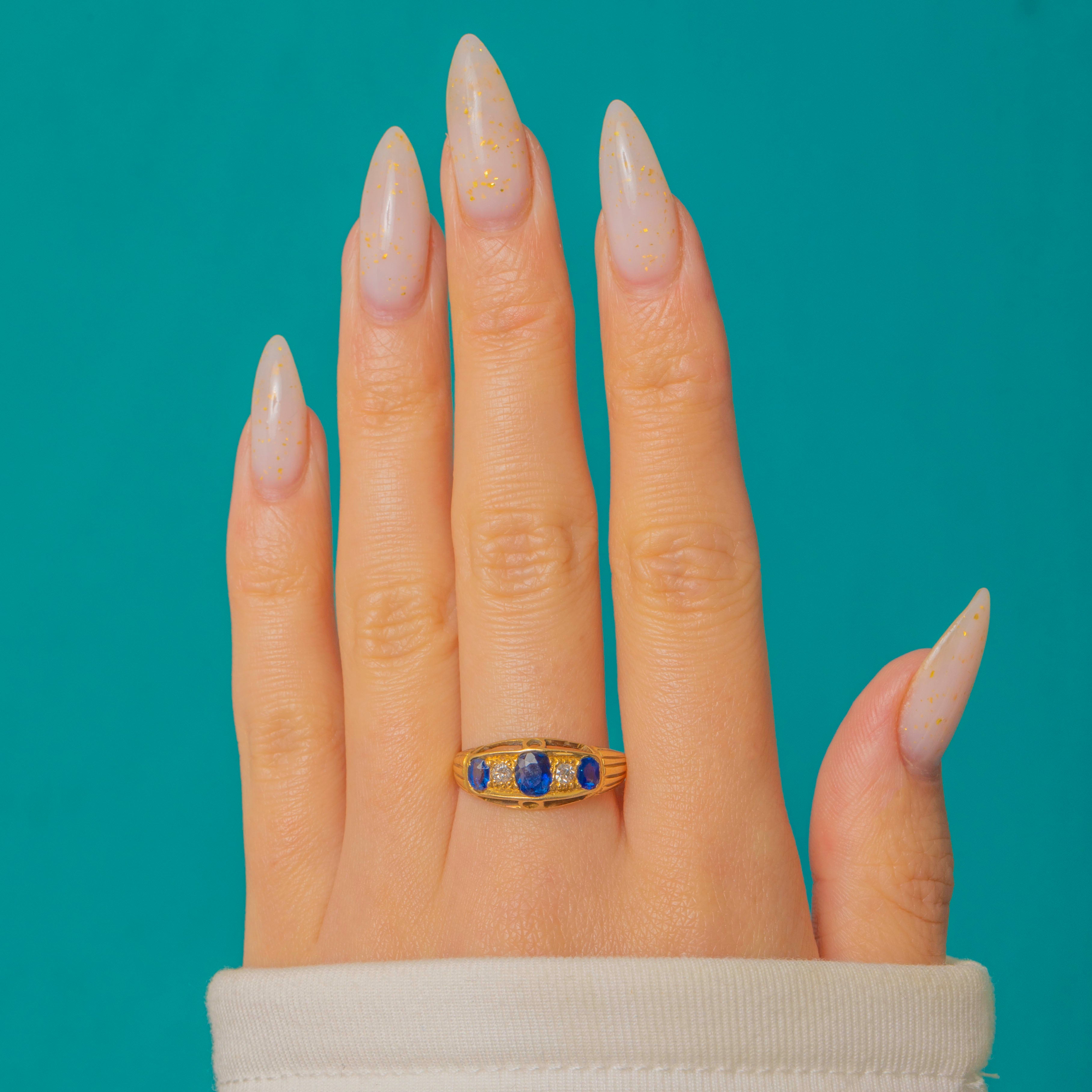 EXCELLENT: The Sapphires and Diamonds are bright and well-matched, with only light surface wear visible under magnification. The 18ct Gold band and settings are crisp and secure, showing minimal age-related wear. Beautifully preserved and ready to wear.