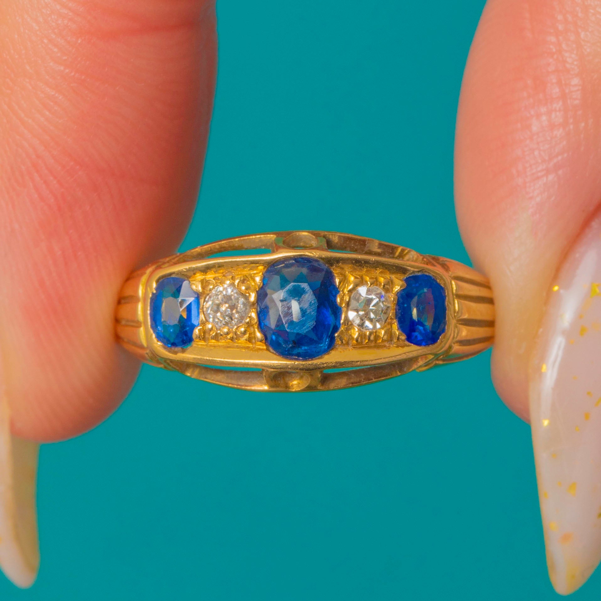 Antique 18ct Gold Natural Sapphire & Diamond Five Stone Boat Ring