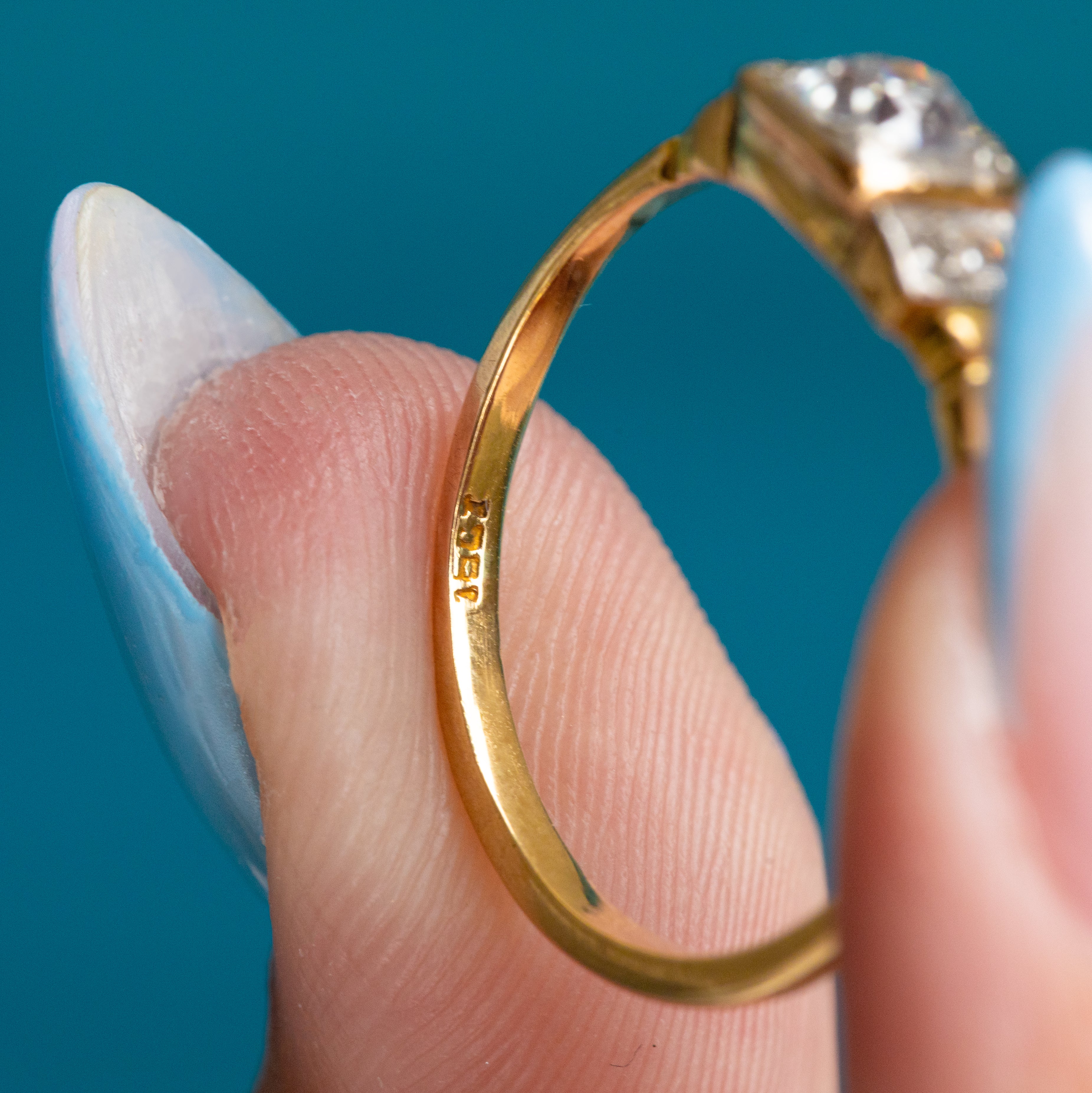 The Diamonds are displayed within geometric Platinum settings, giving the ring a classic Art Deco look, with the smooth 18ct Gold band providing a comfortable fit. Perfect for everyday wear, this antique Diamond ring was created to stand the test of time and will delight for years to come!