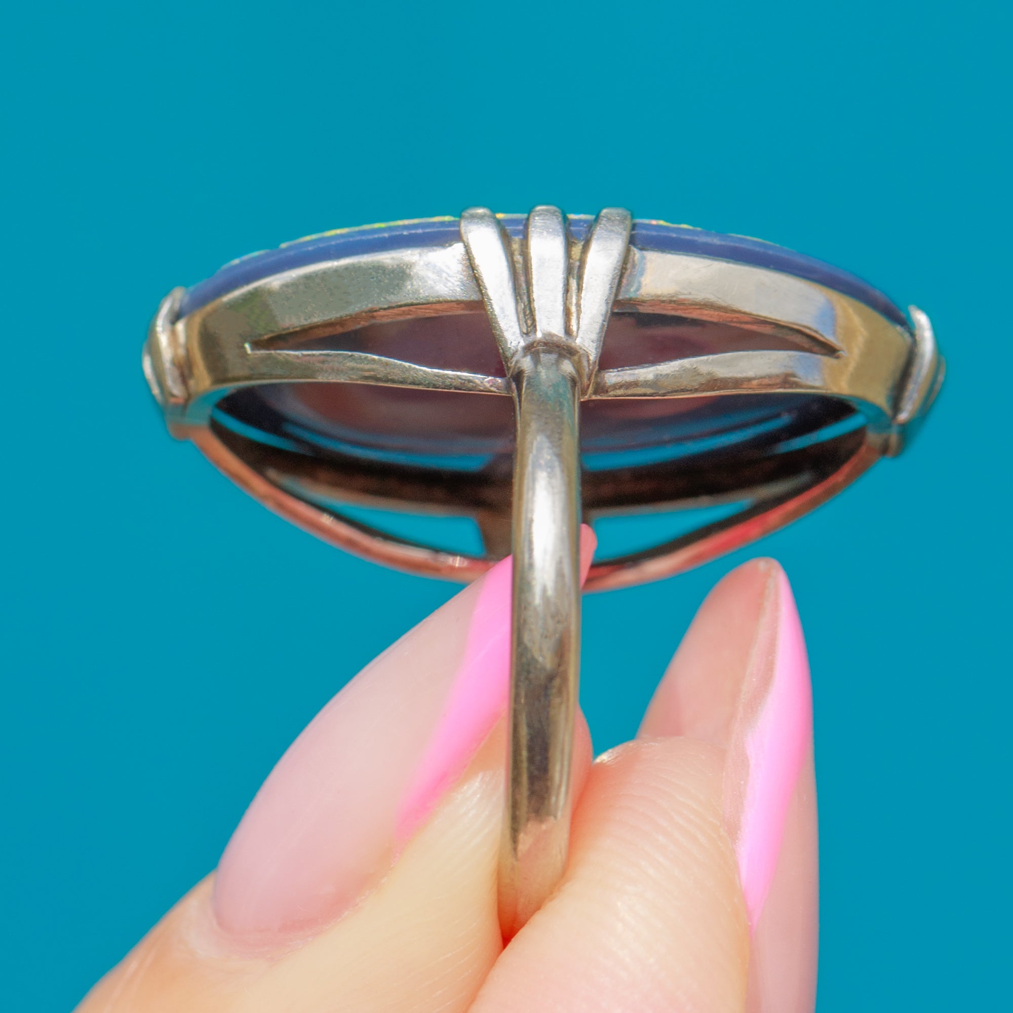 This Art Deco 18ct Gold Opal Doublet dress ring is the treat your jewellery box is looking for! Poised at the centre is a lovely Opal doublet, with vibrant violet, pink and blue play-of-colour - as deep and dark as a galactic midnight sky.