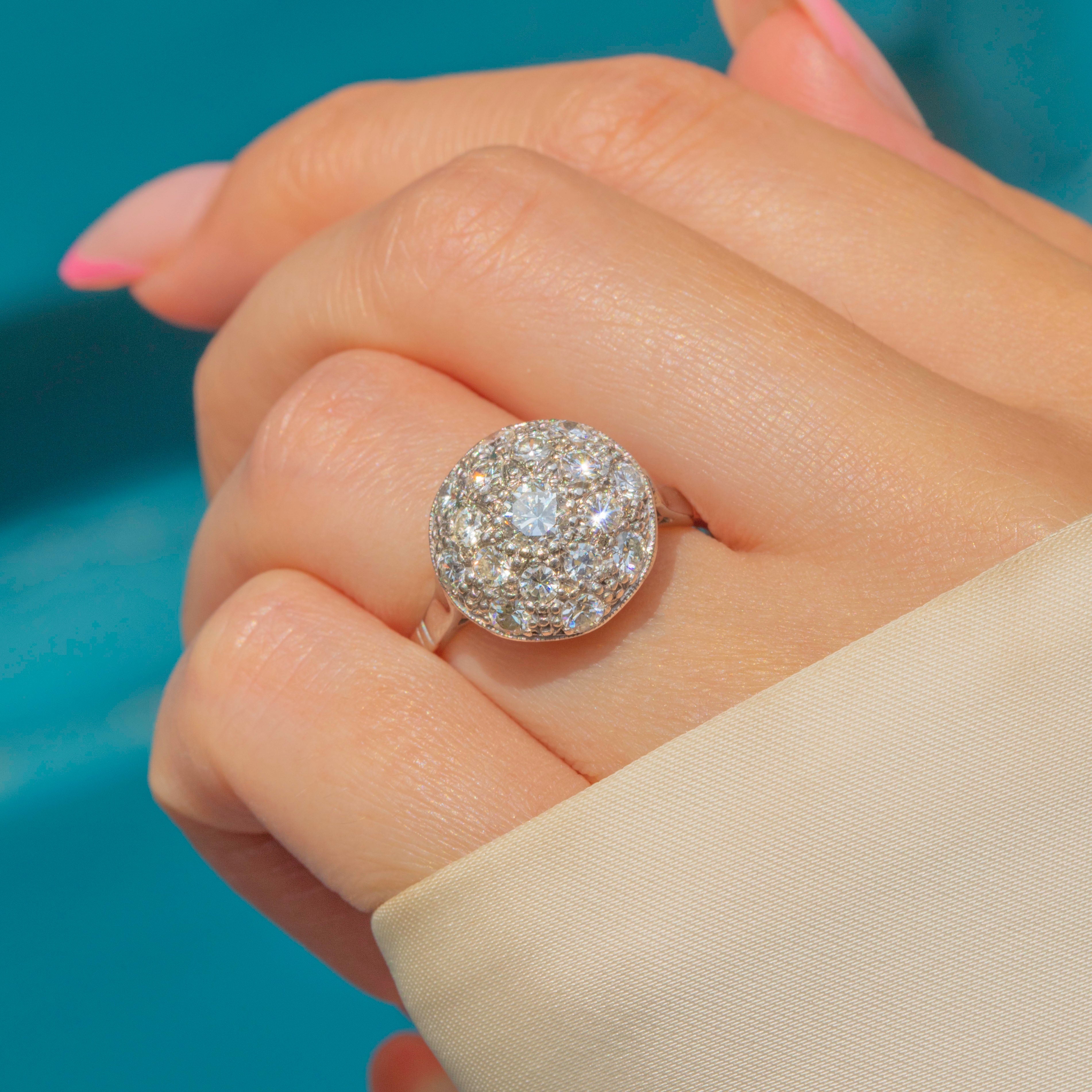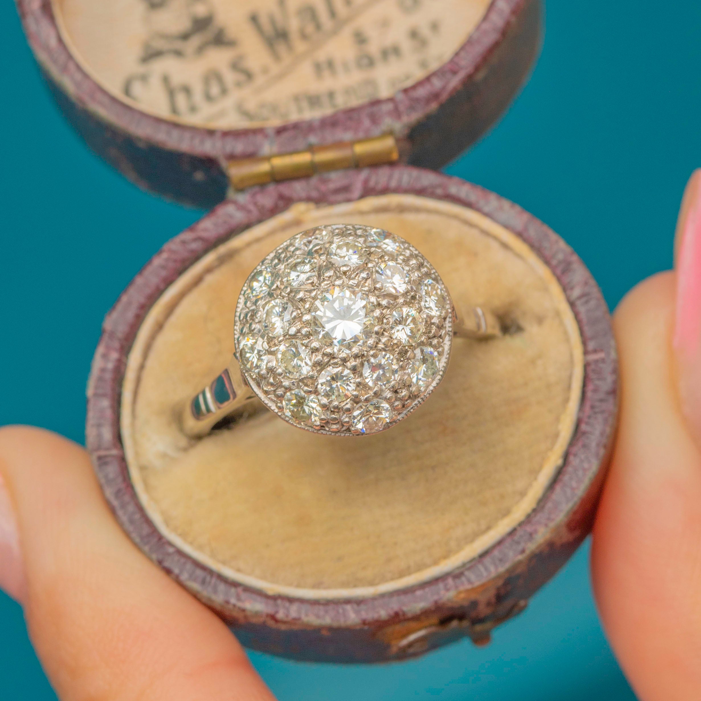 This Art Deco 18ct Gold & Platinum Diamond bombe cluster ring will bring the wow factor to any ensemble! Inlaid with a generous sprinkling of Diamonds, with a combined weight of 1.16ct, set in Platinum illusion settings, this antique ring is a sensational piece.
