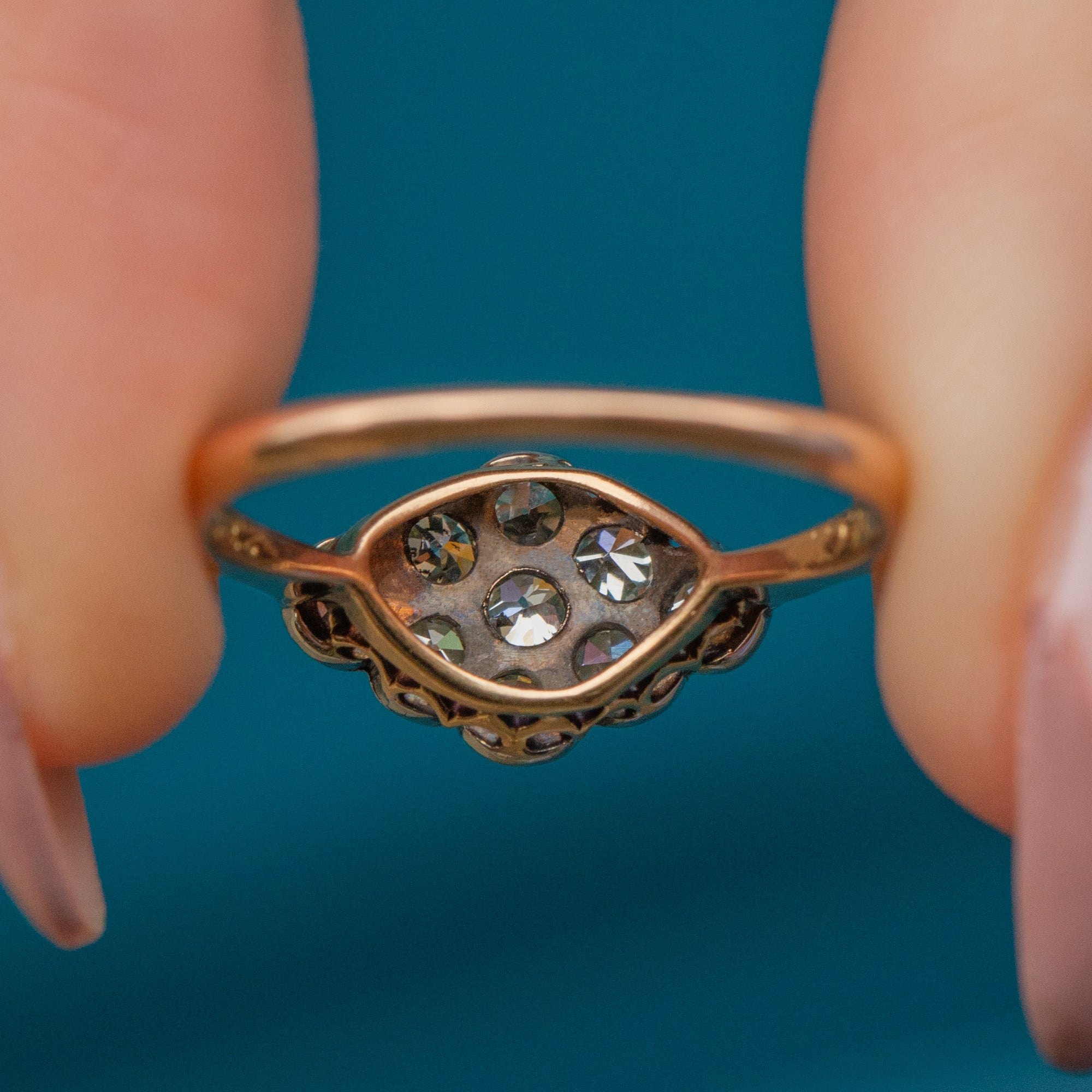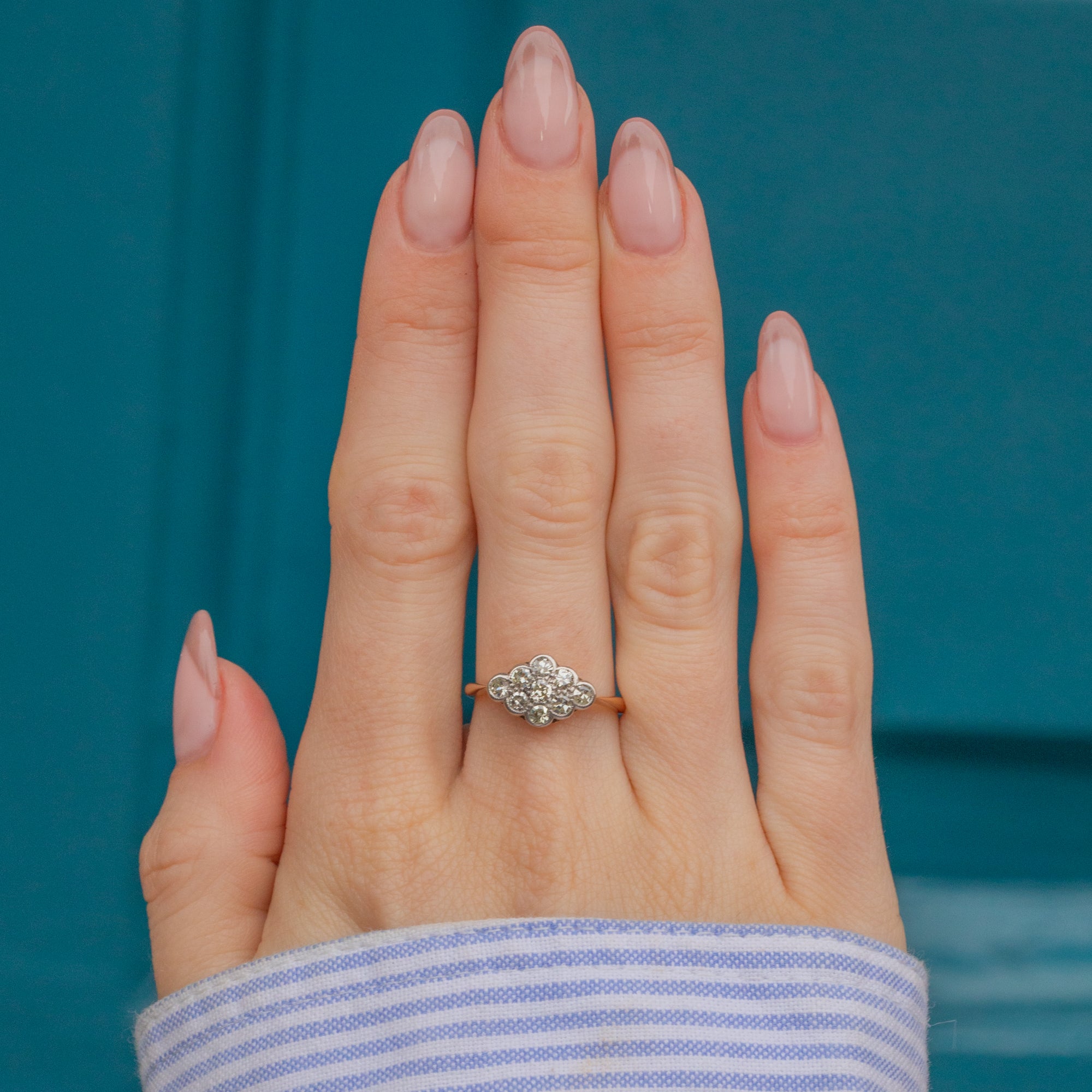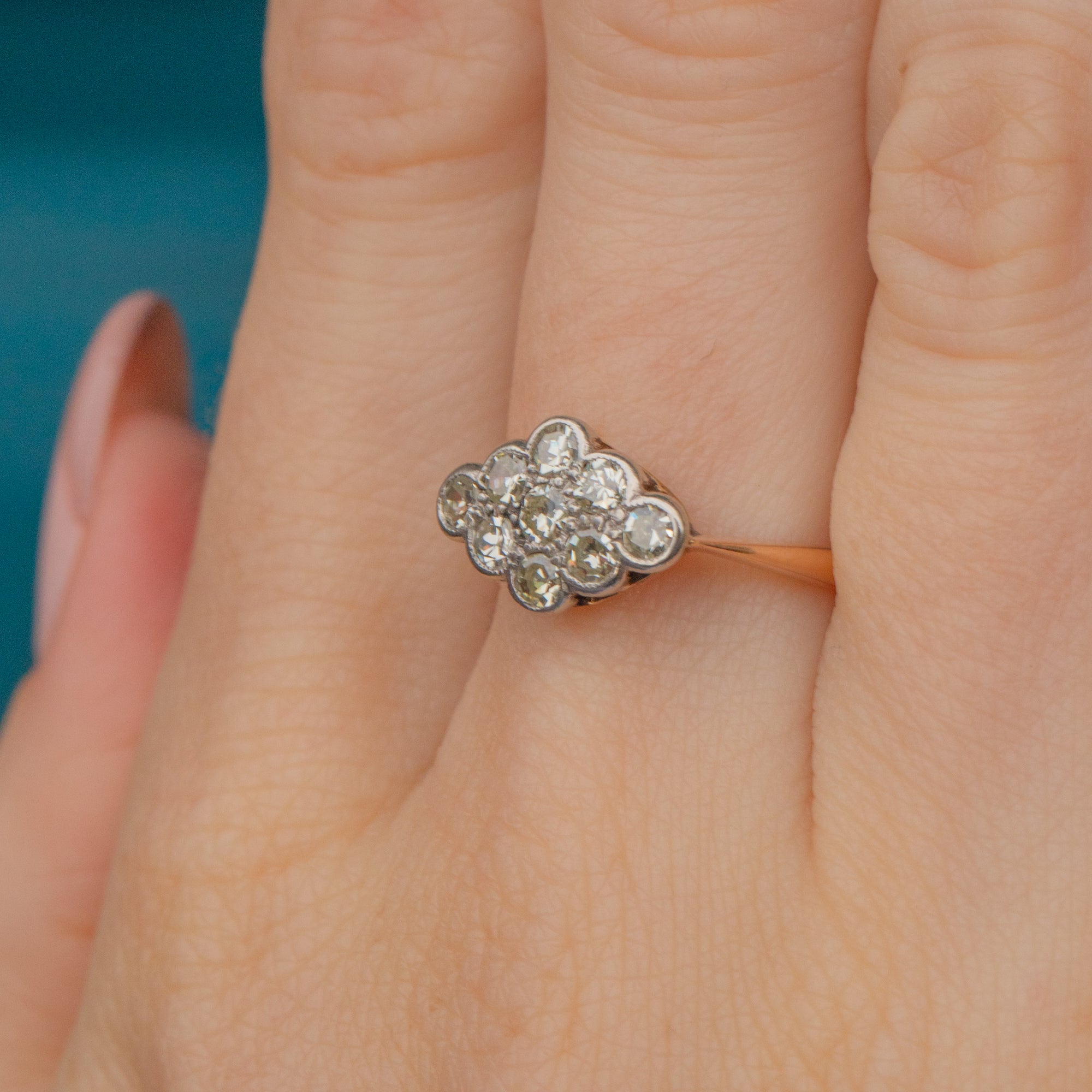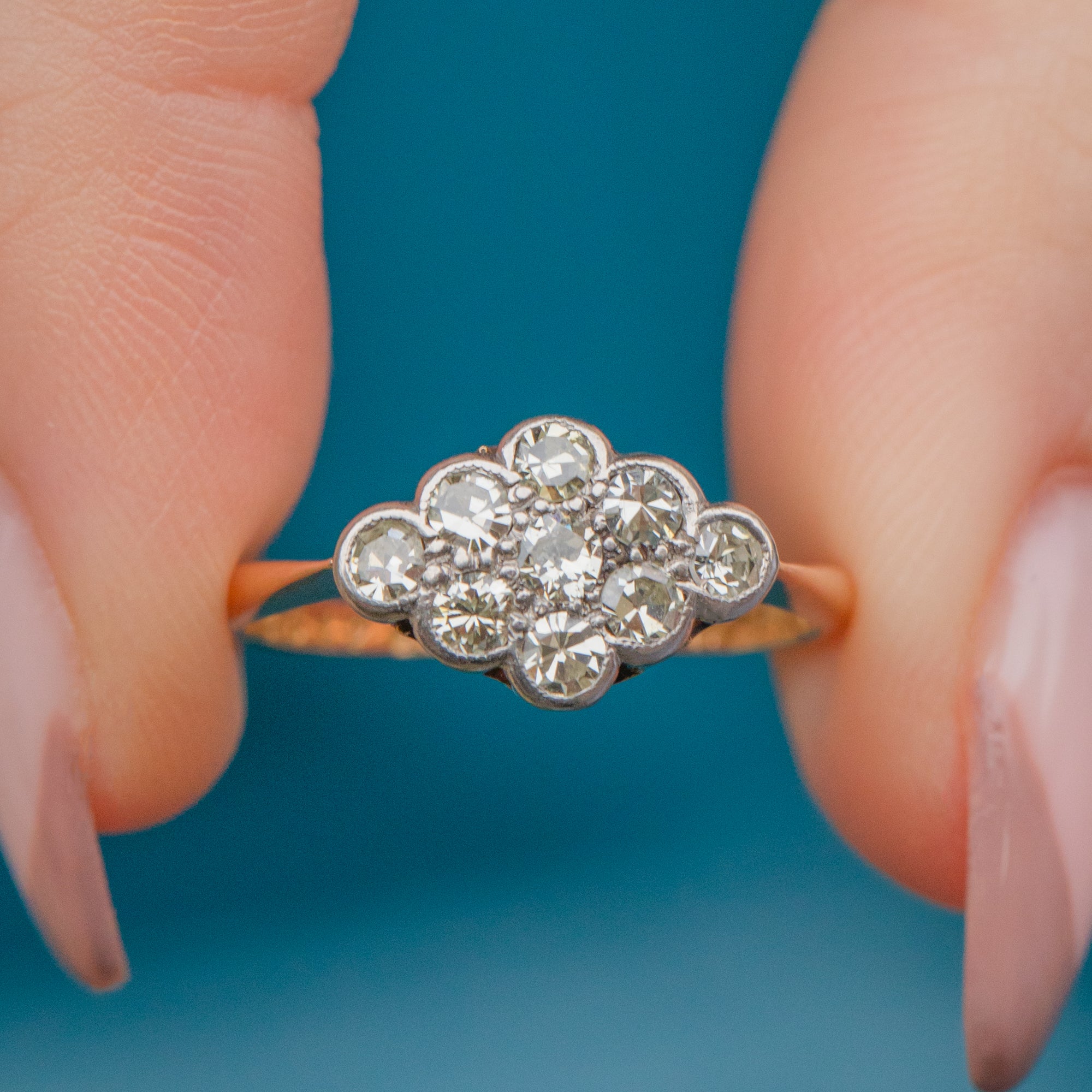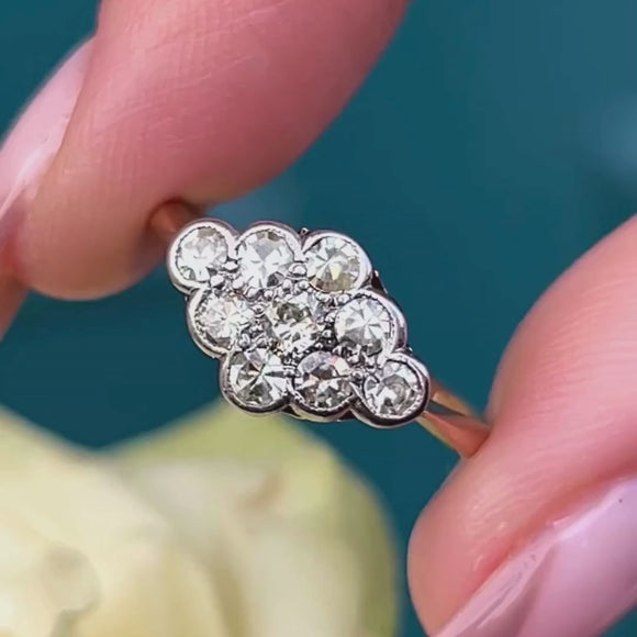 VERY GOOD-EXCELLENT. This Art Deco 18ct Gold & Platinum Diamond cluster ring is in wonderful condition. The Diamonds are all present and securely set in Platinum, with no fleabites or abrasions visible. The only thing to note is that three of the claws on the gallery don't meet the stone settings, but the ring is still robust enough for daily wear. The 18ct Gold band is saturated and smooth with lovely, chunky Art Deco stamps inside.