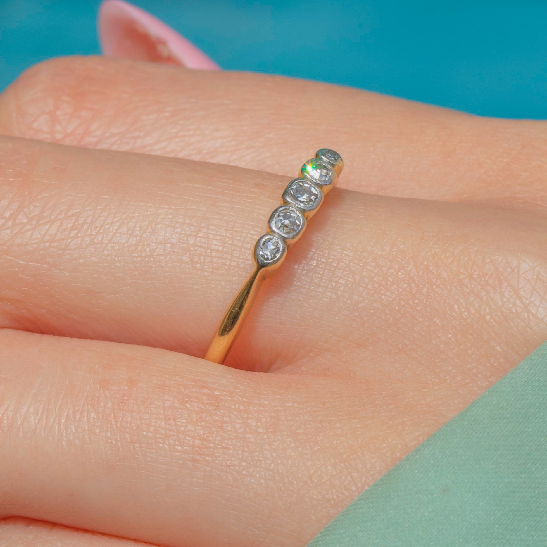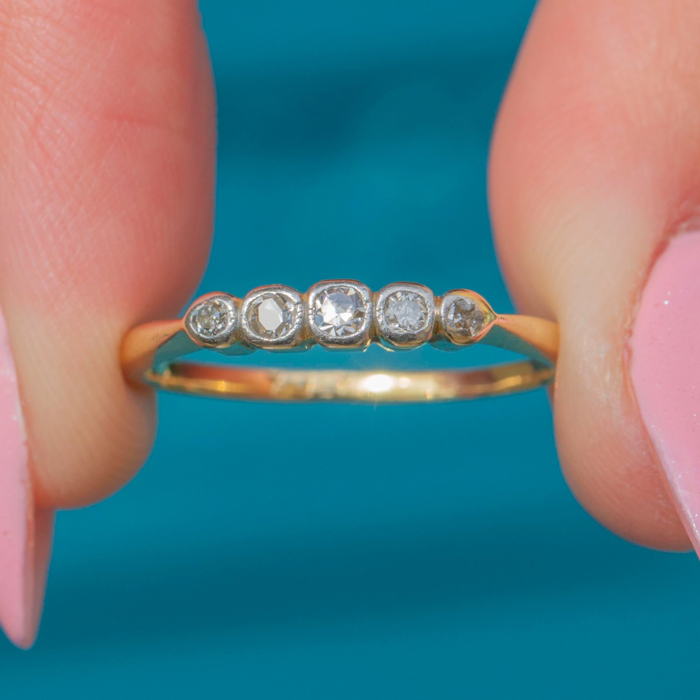 VERY GOOD-EXCELLENT: This Art Deco 18ct Gold and Platinum five stone ring is in very good to excellent condition. Each of the Diamonds are radiant and securely set within their White Gold settings. There is some minor surface wear commensurate with age but with little else to note, she is a must-have!