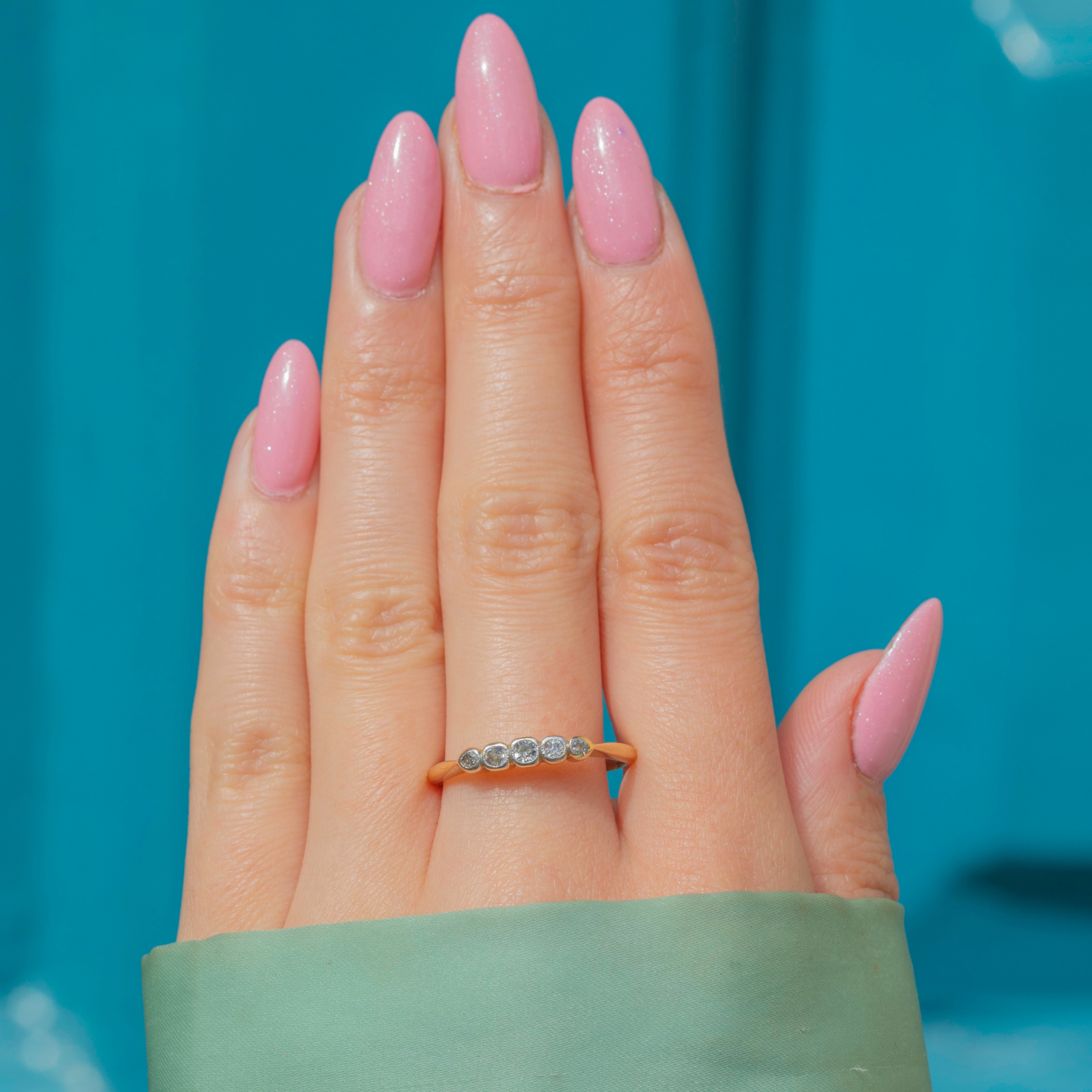 Featuring five graduating glittering Diamonds, this antique ring stuns from every angle! Each Diamond is set within glossy White Gold settings and sit on a buttery 18ct Gold band.
