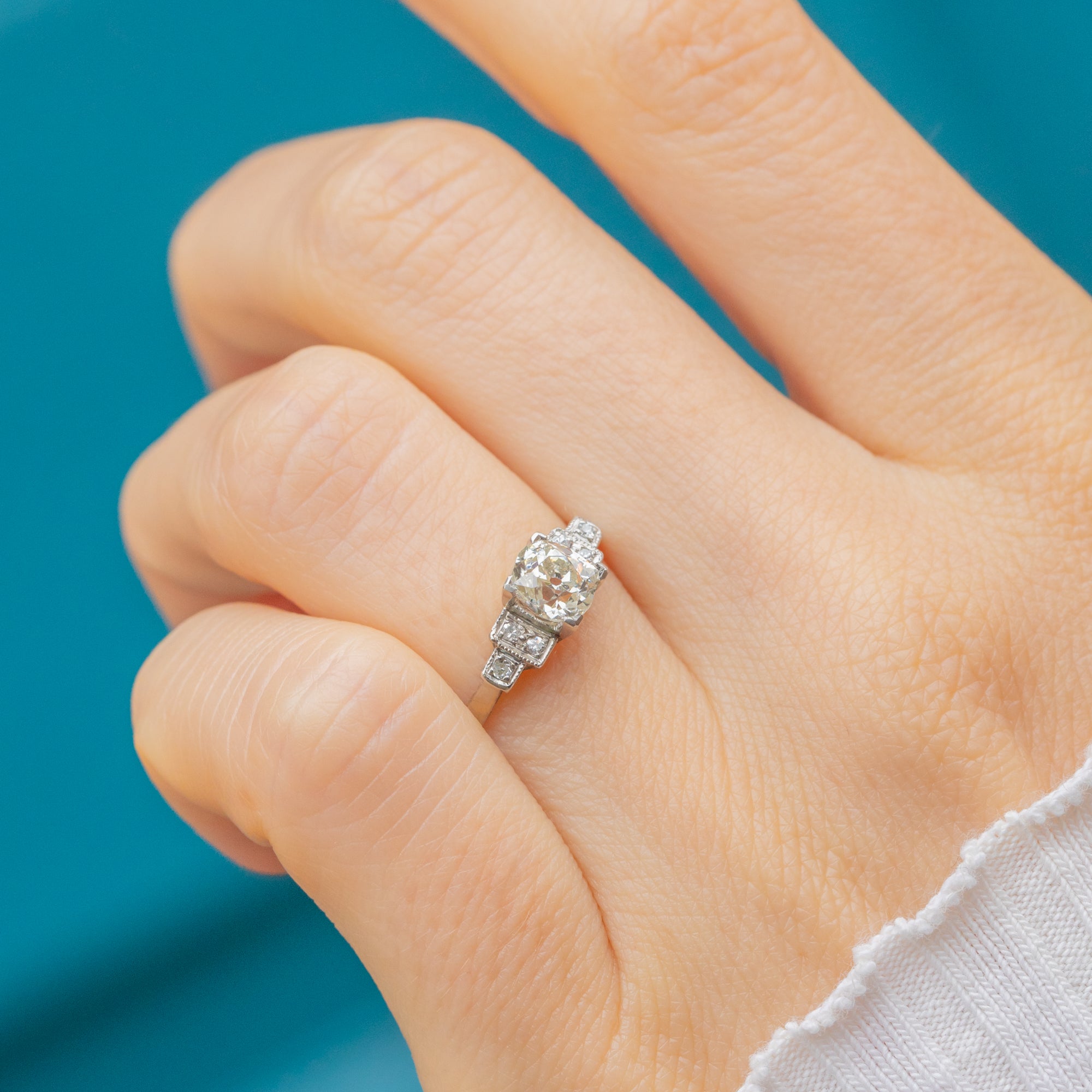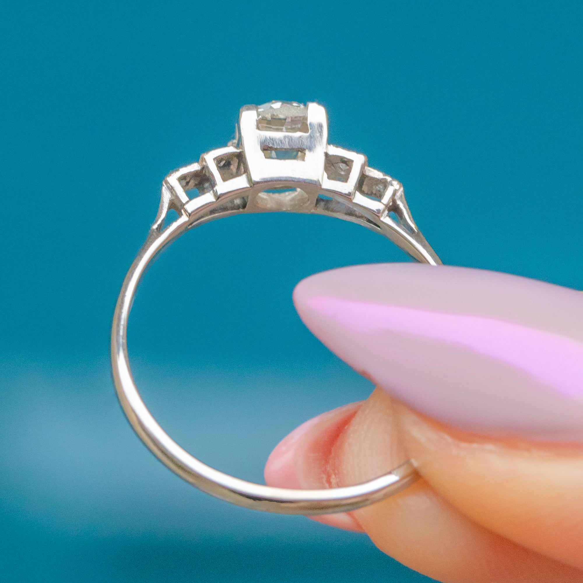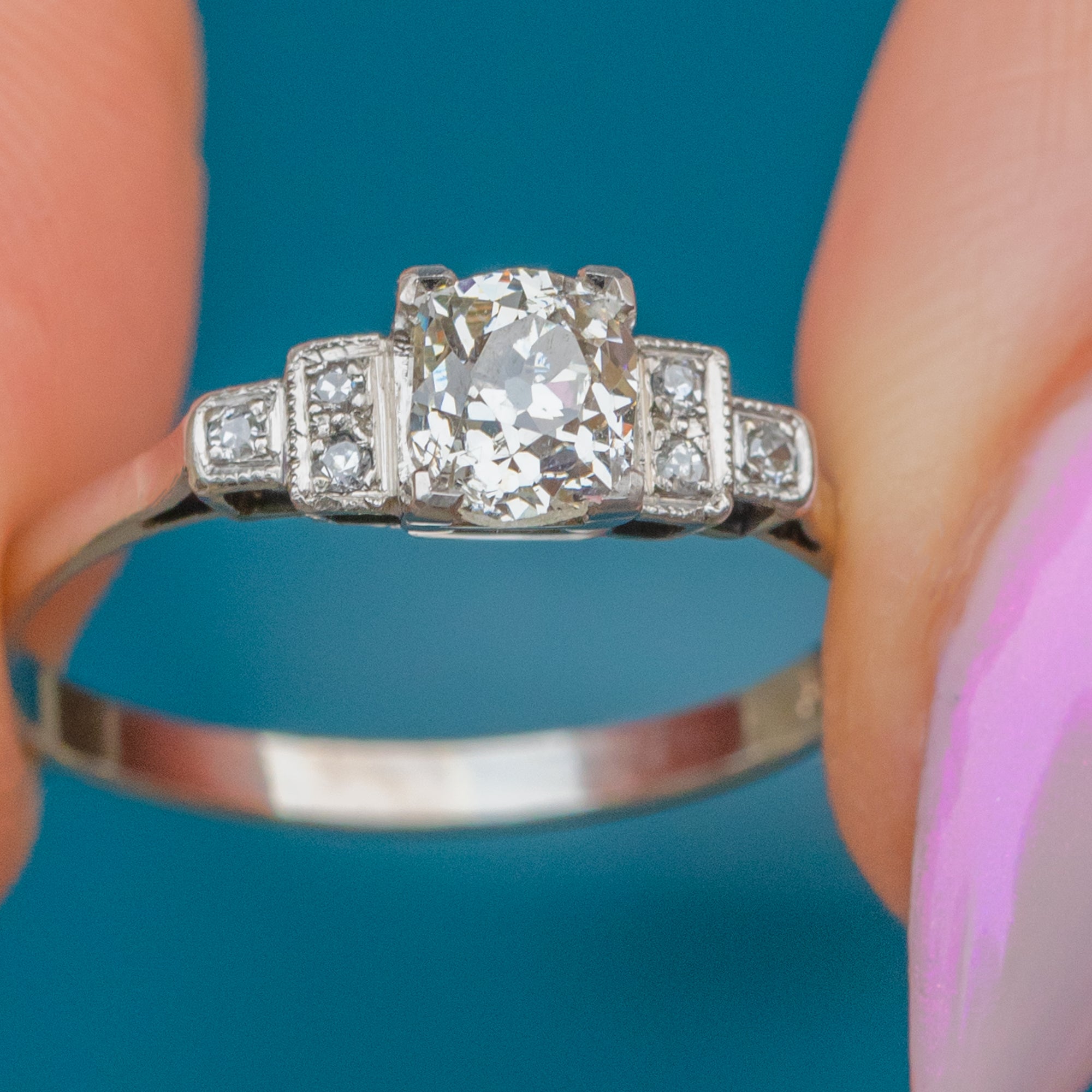 A breathtaking Art Deco engagement ring featuring a bright and fiery 0.70ct Old Mine-cut Diamond, framed by six pretty accent Diamonds in an elegant stepped Platinum design. The central stone displays the beautiful facets and crisp antique cushion shape typical of early old-mine cuts, with exceptional F/G colour and VS clarity.