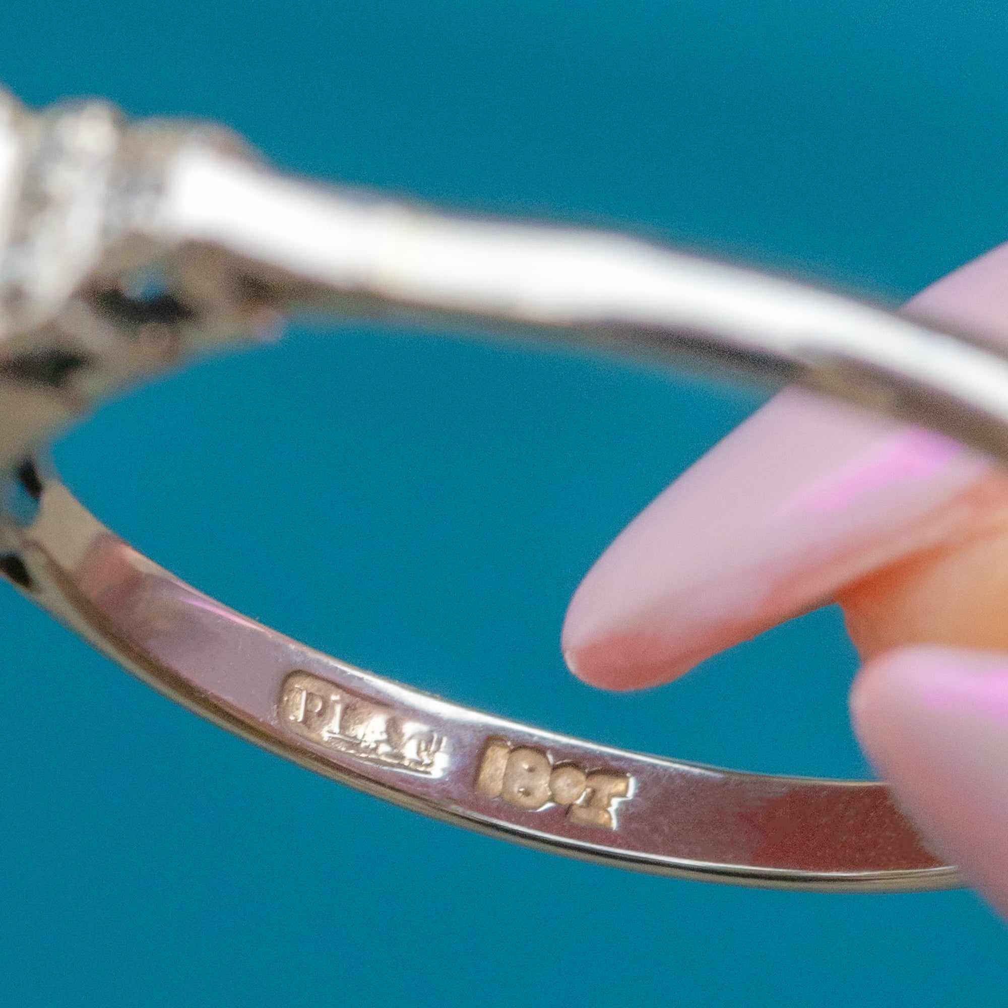 EXCELLENT: The Diamonds are bright, lively and securely set, free from fleabites or abrasions. The Platinum settings are crisp with intact millegrain detail, and the band shows minimal wear. A superb example of Art Deco elegance and craftsmanship.