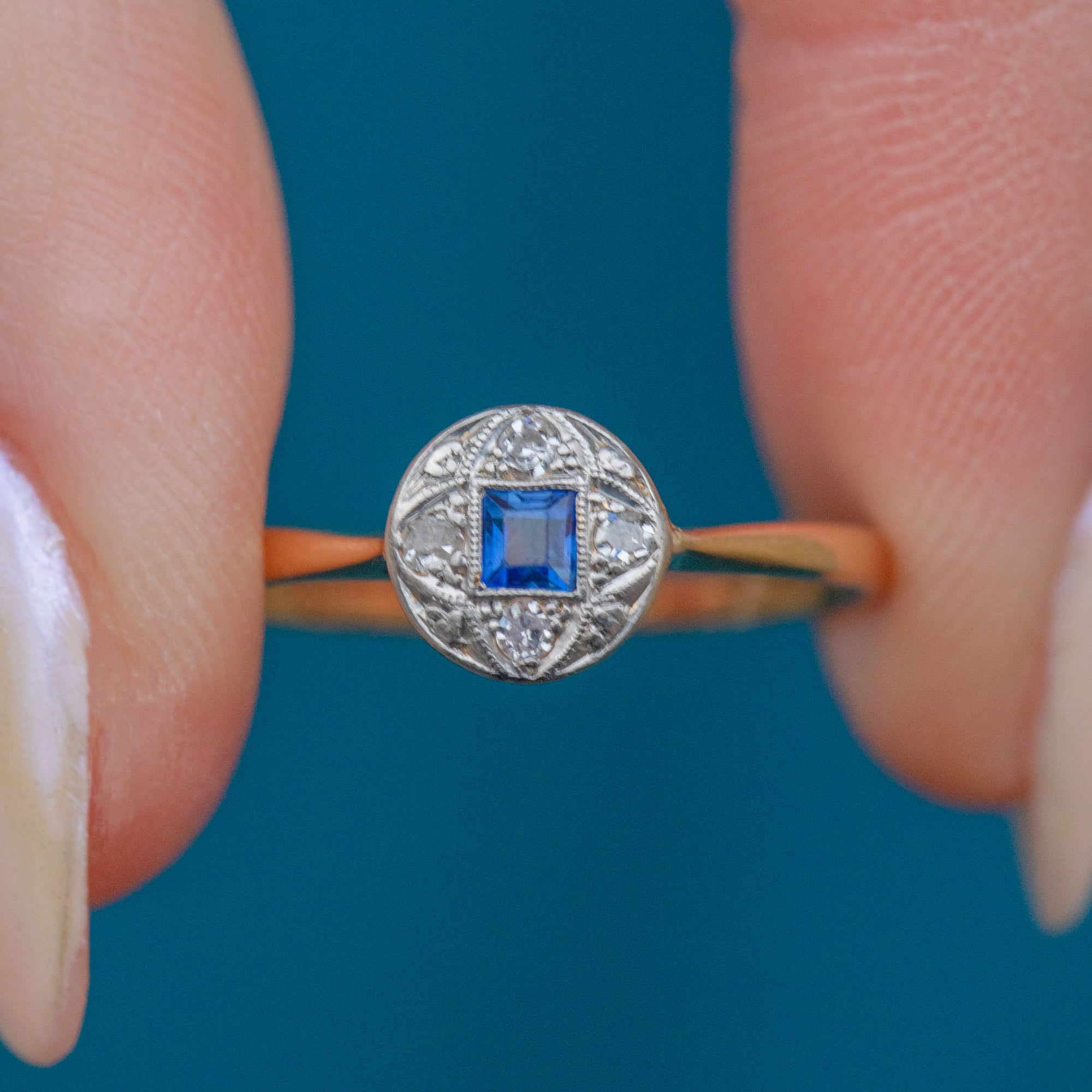 This Art Deco 18ct Gold & Platinum Sapphire Diamond cluster ring will make a timeless addition to your collection!