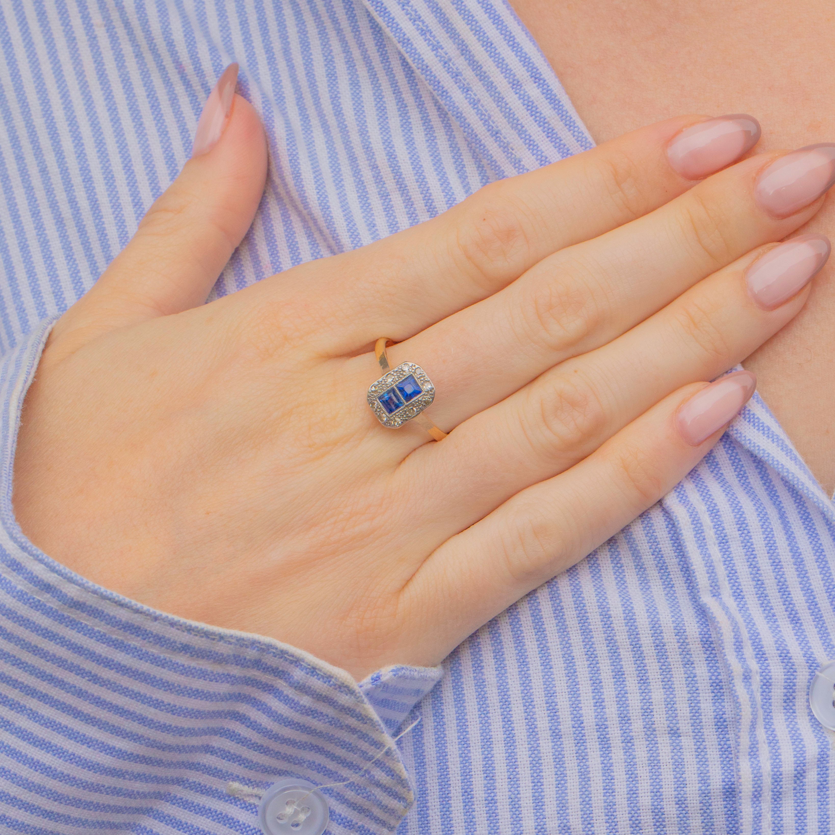 EXCELLENT. We are pleased to present this Art Deco 18ct Gold and Platinum Sapphire Diamond panel ring in excellent condition. Her Diamonds and Sapphires are radiant, catching the light beautifully and free from scuffs or scratches. Her 18ct Gold and Platinum band is also in wonderful condition, making this ring a must-have!