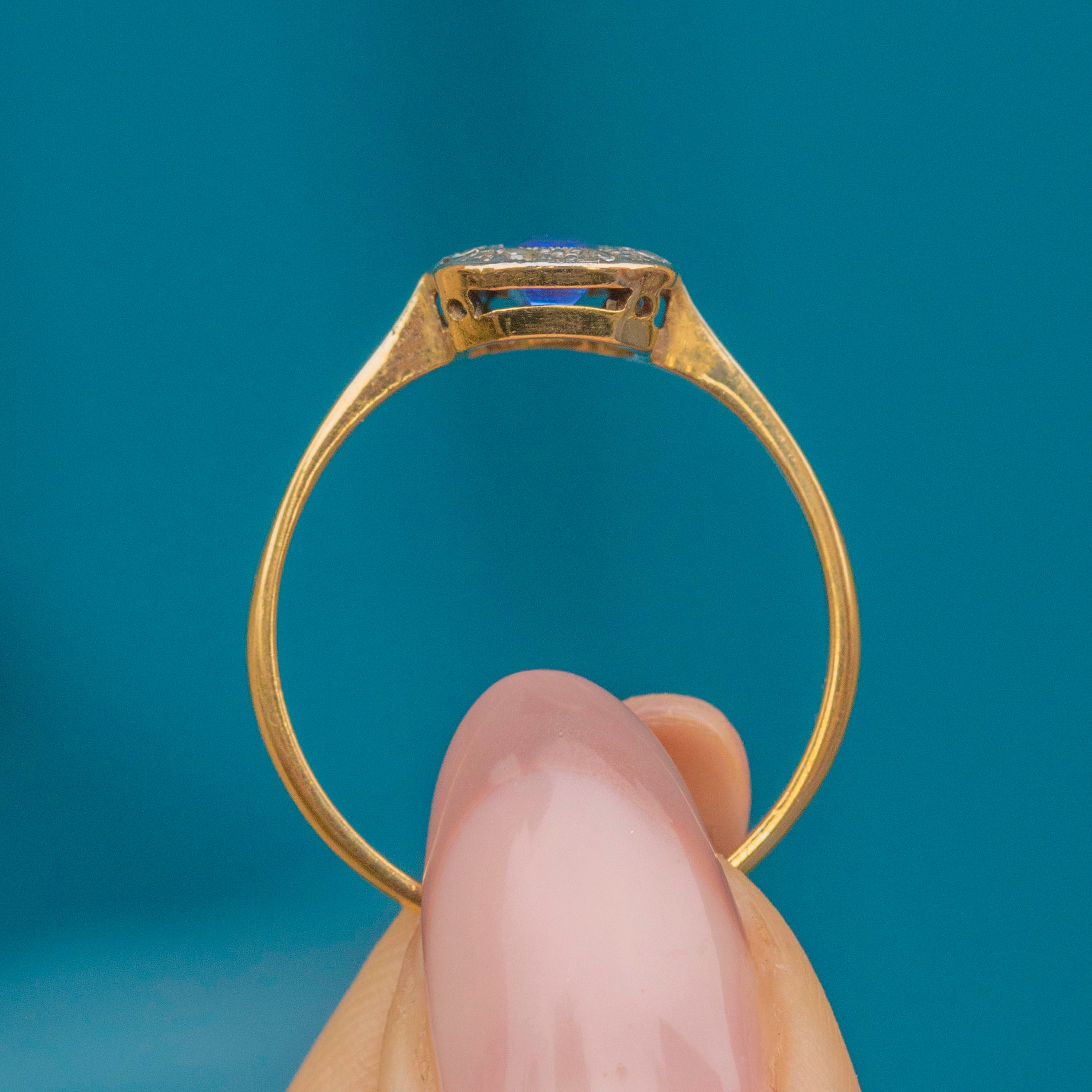 With a sophisticated panel design crafted from 18ct Gold and Platinum, this Diamond and Sapphire ring is an exemplar of 1920s elegance and glamour. At her centre sits two vibrant Sapphires, radiating deep cerulean hues, effortlessly complimented by a halo of delicate twinkling Diamonds.