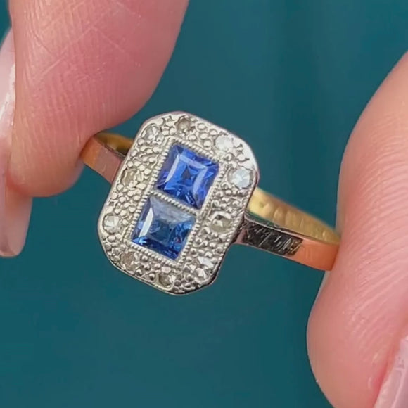 Art Deco 18ct Gold & Platinum Sapphire Diamond Panel Ring
