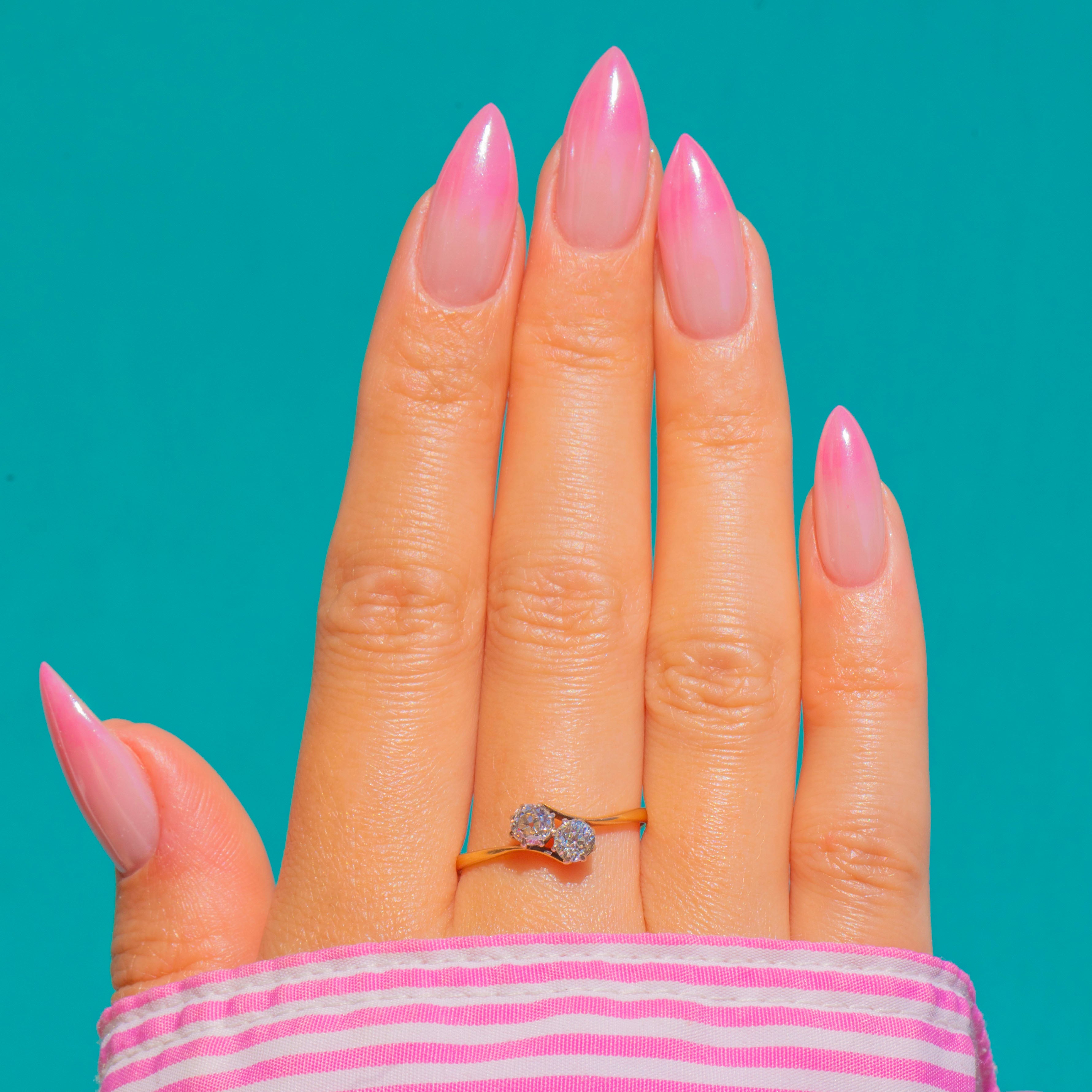 A lyrical Art Deco toi-et-moi Diamond ring, the timeless symbol of “you and me” united as one. Two charming Old Mine Cut Diamonds nestle side by side in Platinum claw heads, poised above an elegant 18ct Gold shank with delicately curved shoulders. The mixed-metal palette lends a refined glow: cool Platinum to amplify the Diamonds’ sparkle, warmed by the buttery sheen of Gold.