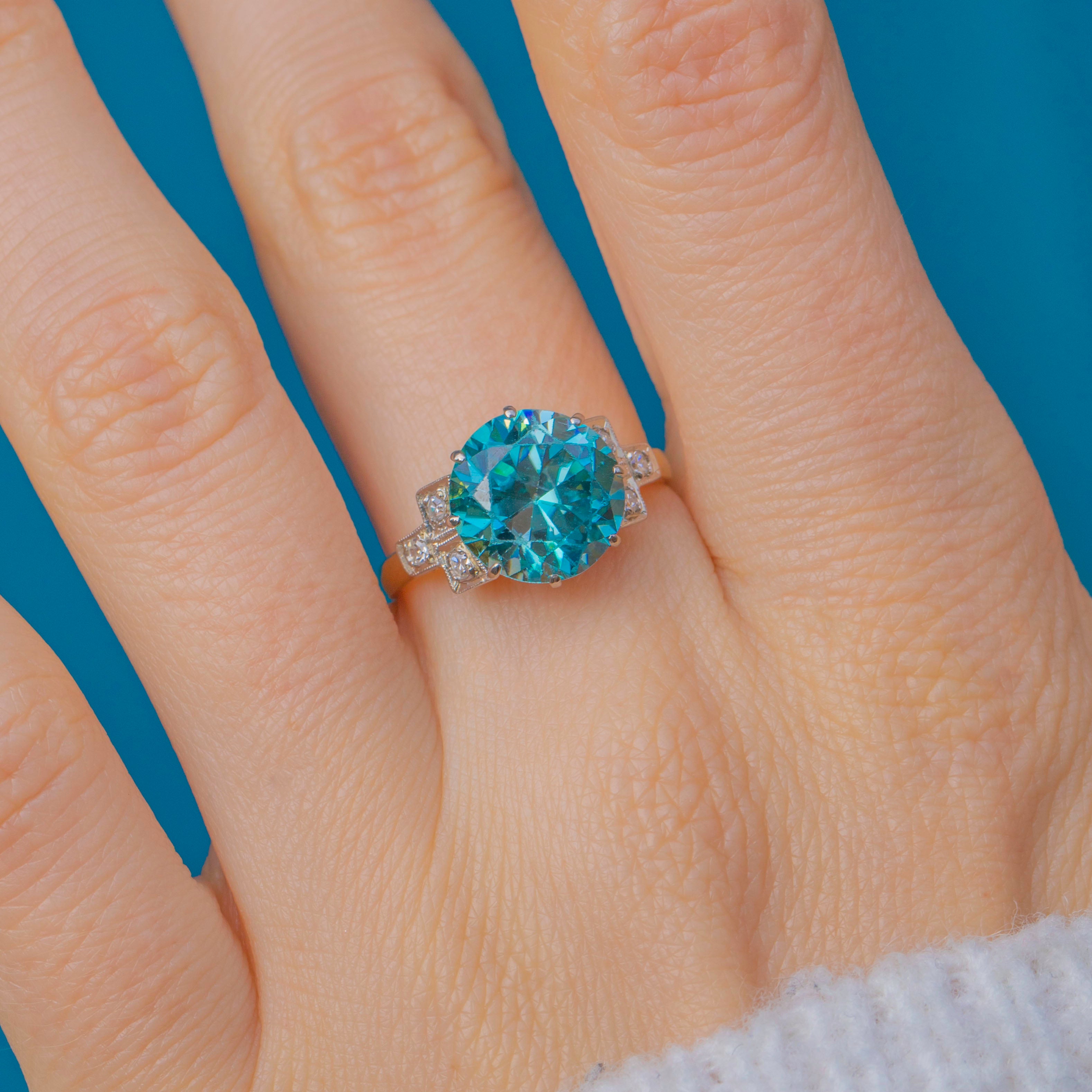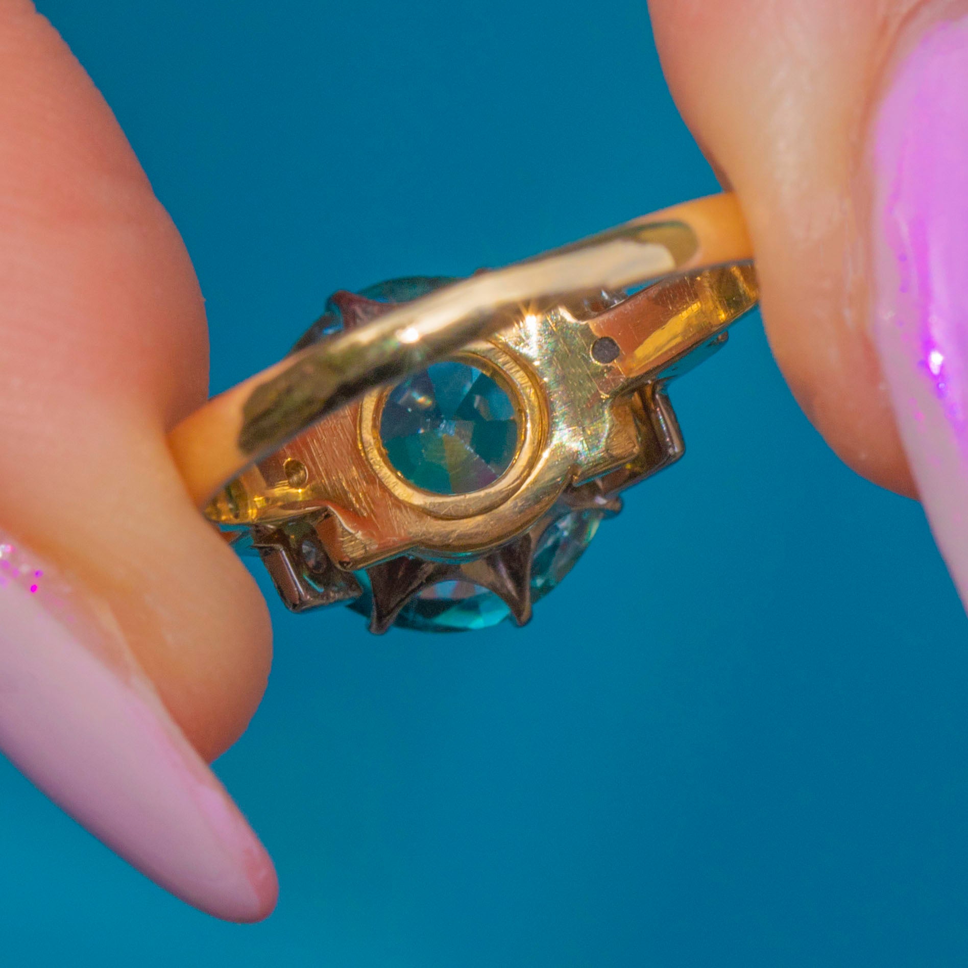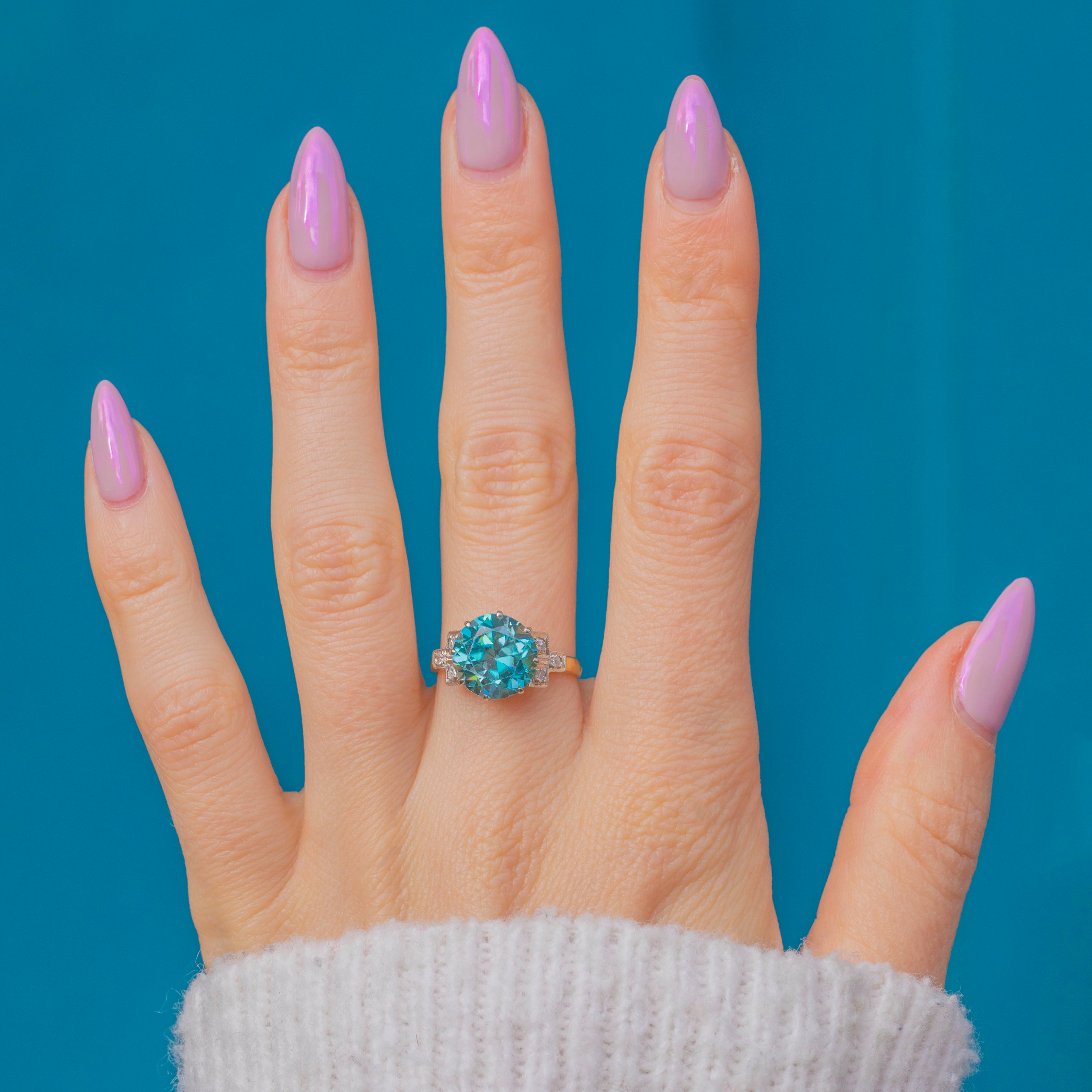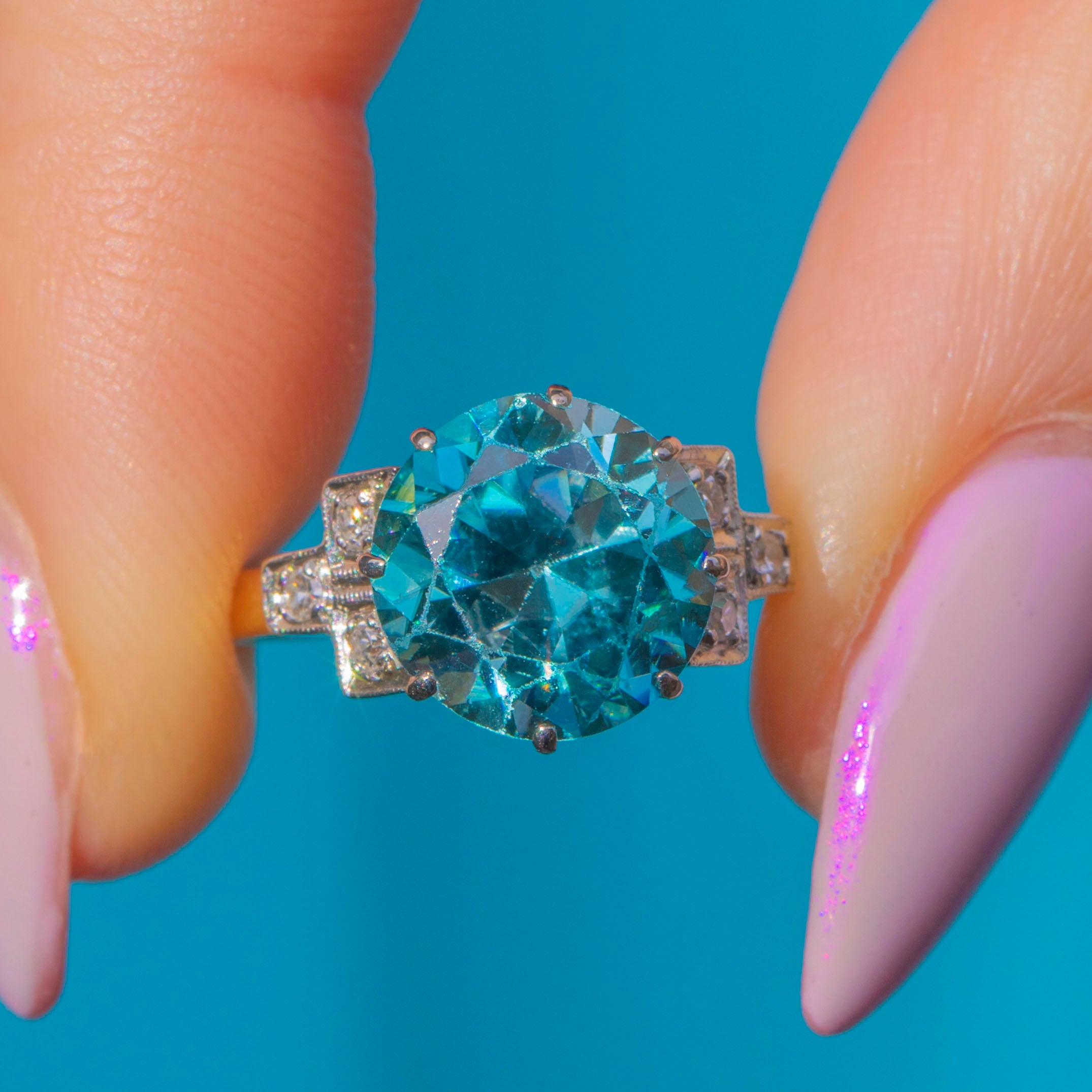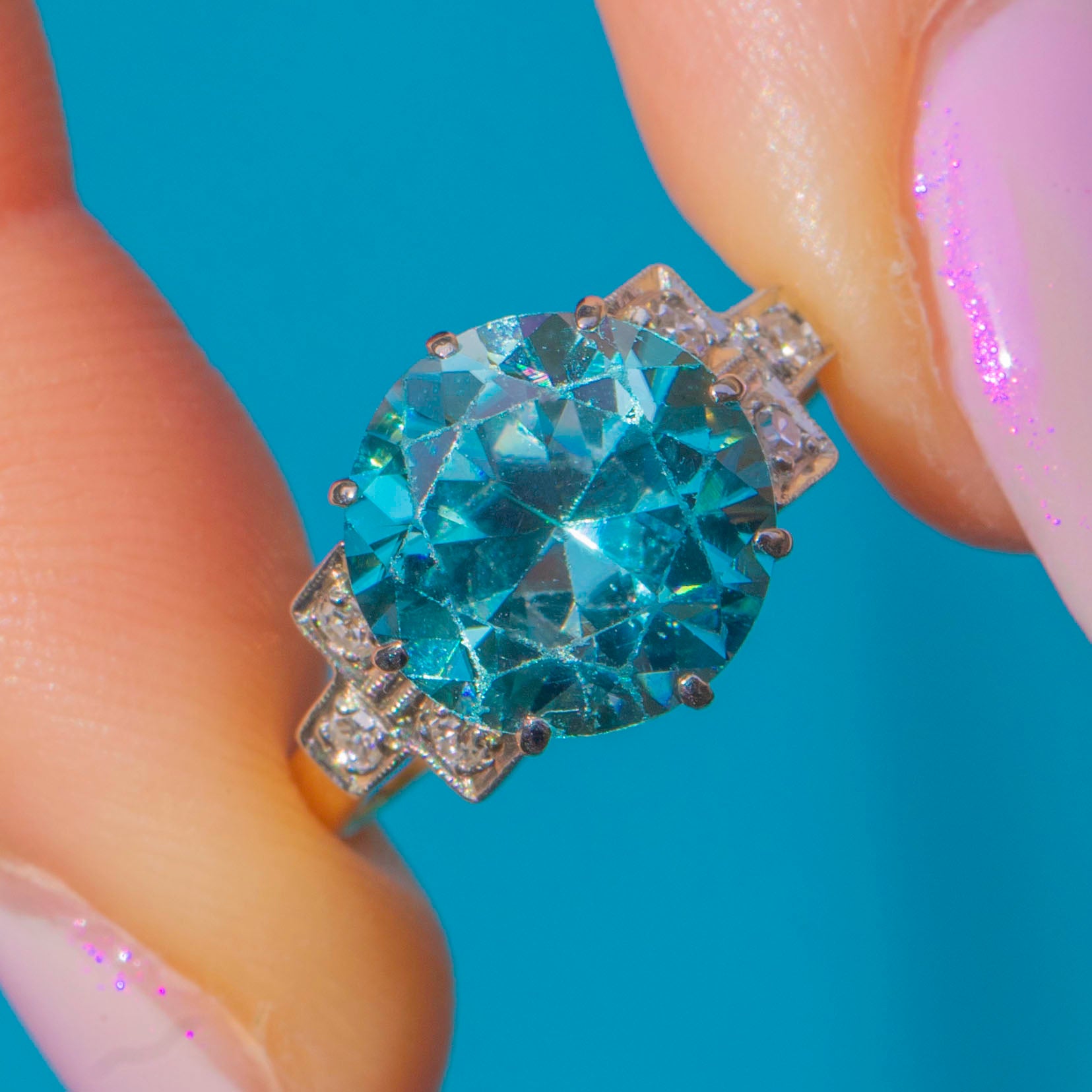 An impressive Art Deco cocktail ring showcasing a vibrant natural 5.00ct Zircon of exceptional colour and brilliance. The striking “Starlite” blue Zircon displays the vivid fire and sparkle that make this gemstone so prized. It’s beautifully framed by structured step shoulders set with three tiny Diamonds on each side, a hallmark of 1920s design.