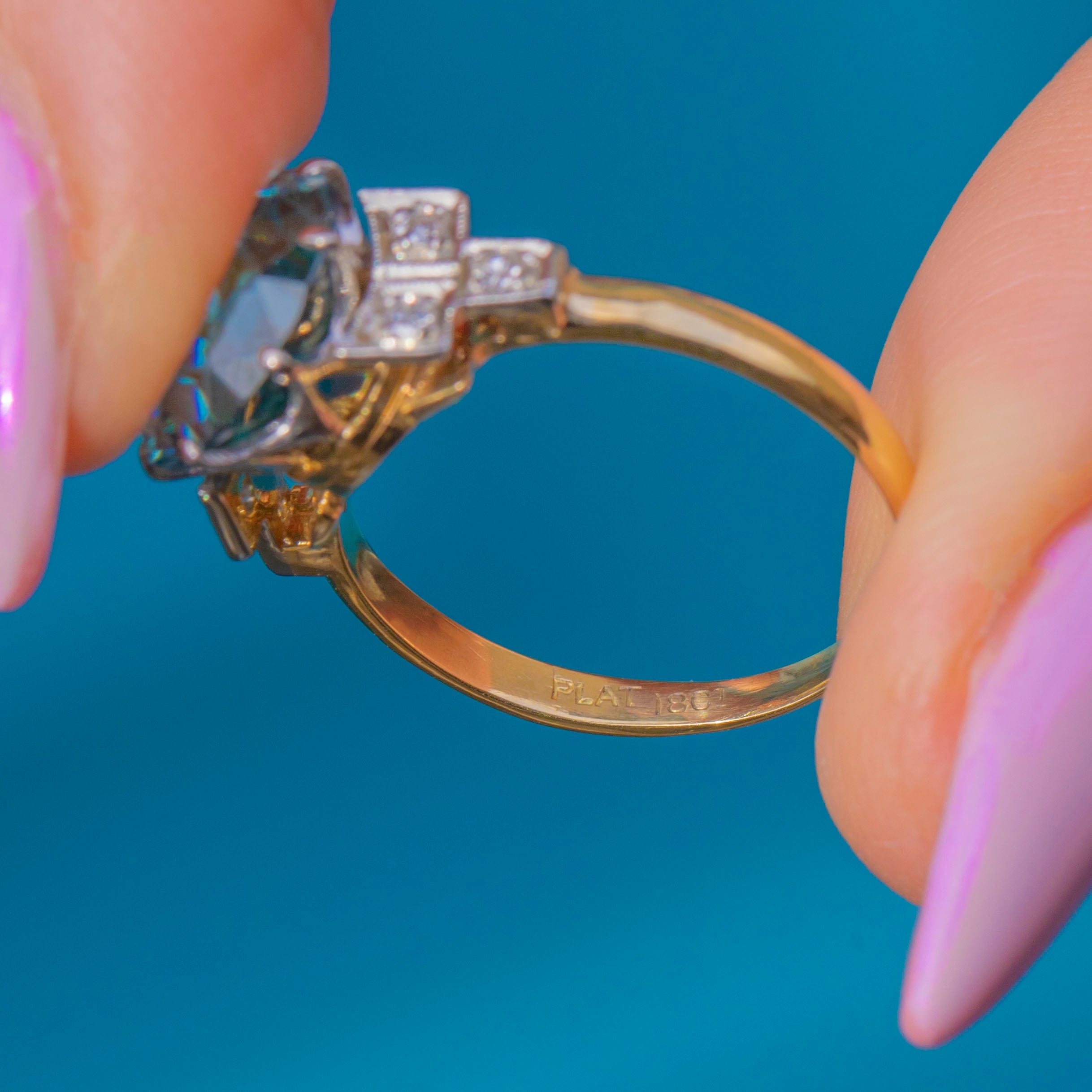The ring combines rich 18ct Yellow Gold with 18ct White Gold claws and Platinum settings for the Diamonds, creating a crisp contrast of tones typical of the period. Elegant, bold, and full of Deco glamour, it’s a true statement piece of antique sophistication.