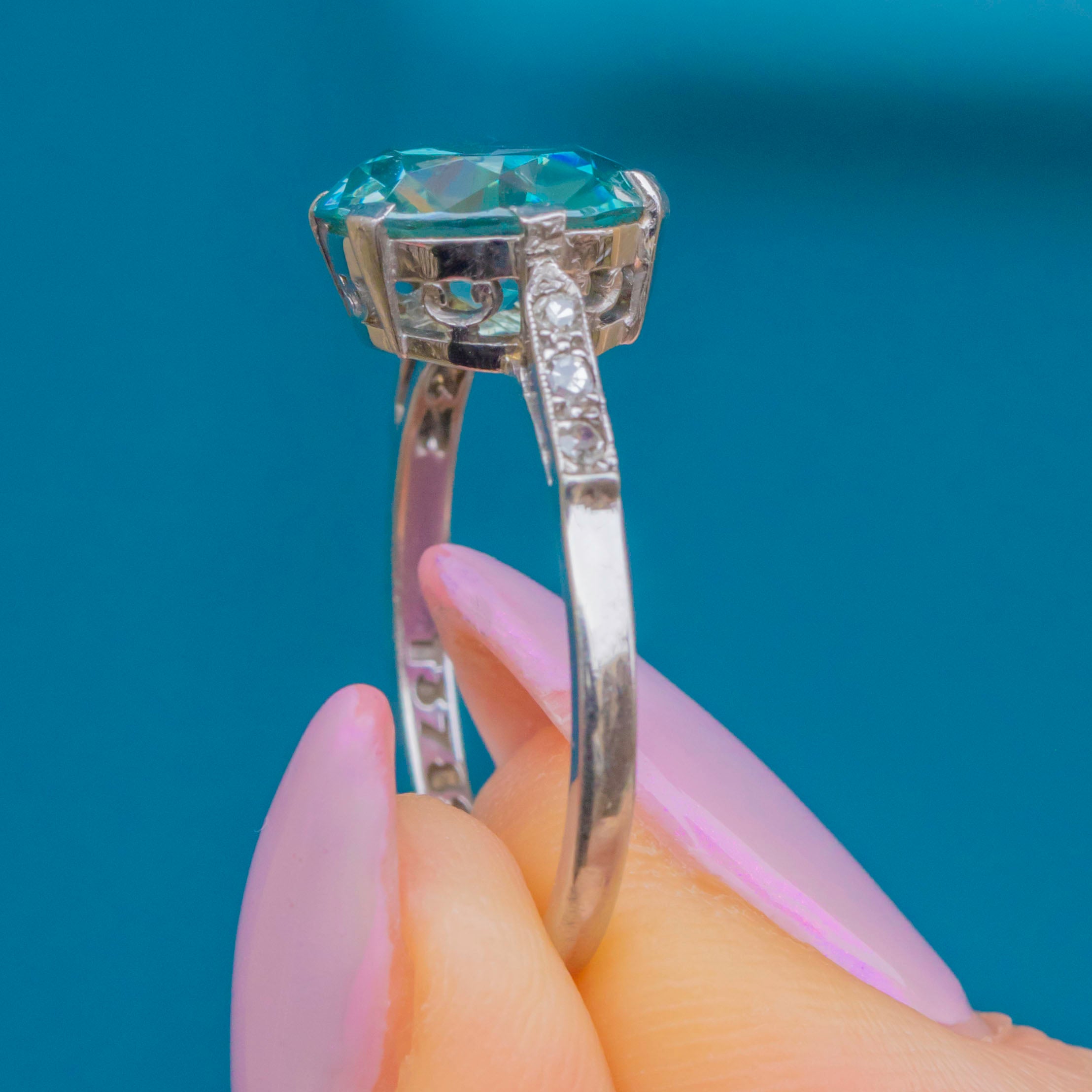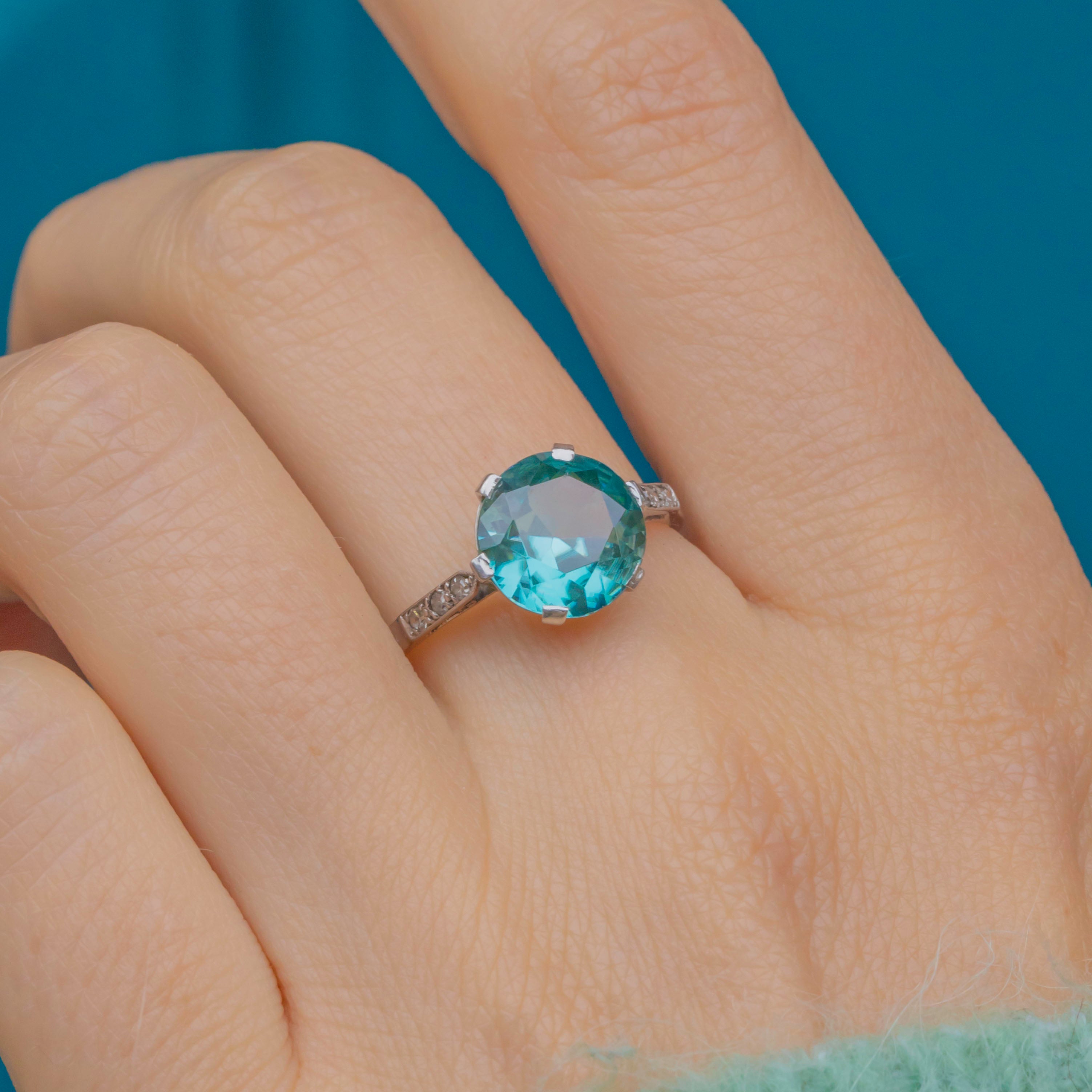 This elegant Art Deco ring is centred with a vivid 2.70ct blue Zircon, full of brilliance and fire, flanked by six twinkling old-cut Diamonds set into Platinum shoulders. The cool, lustrous Platinum contrasts beautifully with the rich 18ct Gold band, a quintessentially Deco colour pairing.