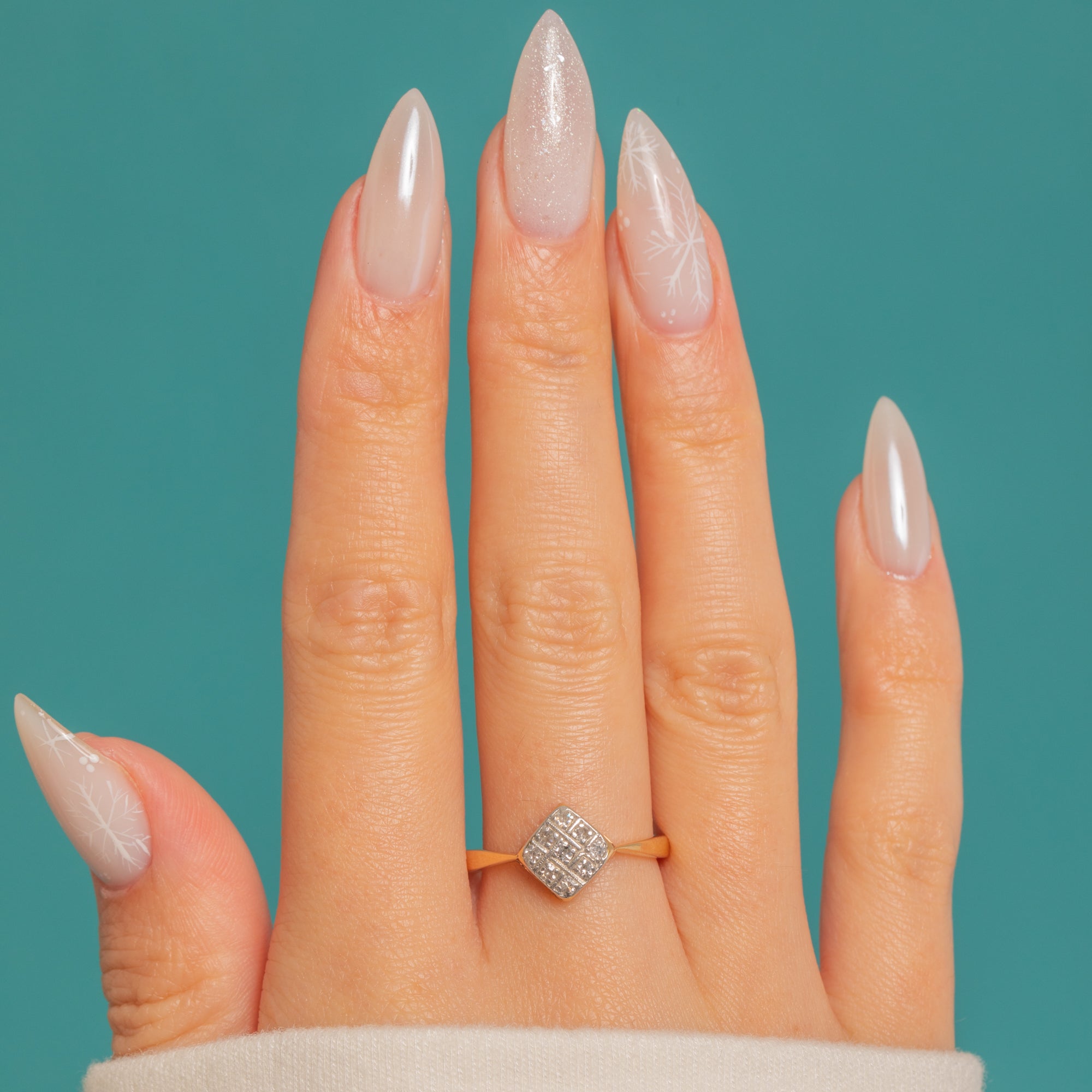 A delicate Art Deco treasure, this rhombus-shaped Diamond cluster ring pairs crisp geometry with exquisite finesse. A petite lozenge plaque is grain-set with bright, white Diamonds arranged in a tidy grid, framed by fine milgrain for a refined, velvety edge.