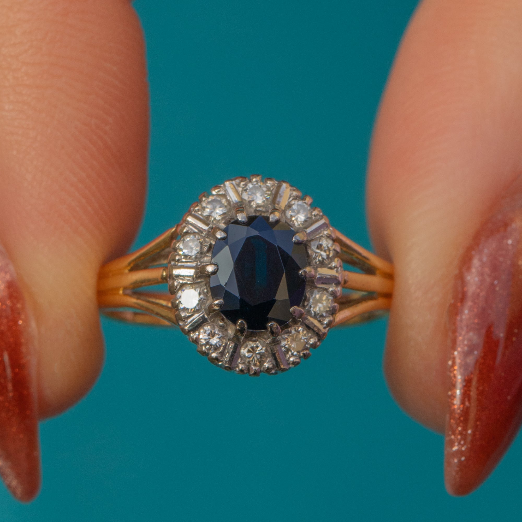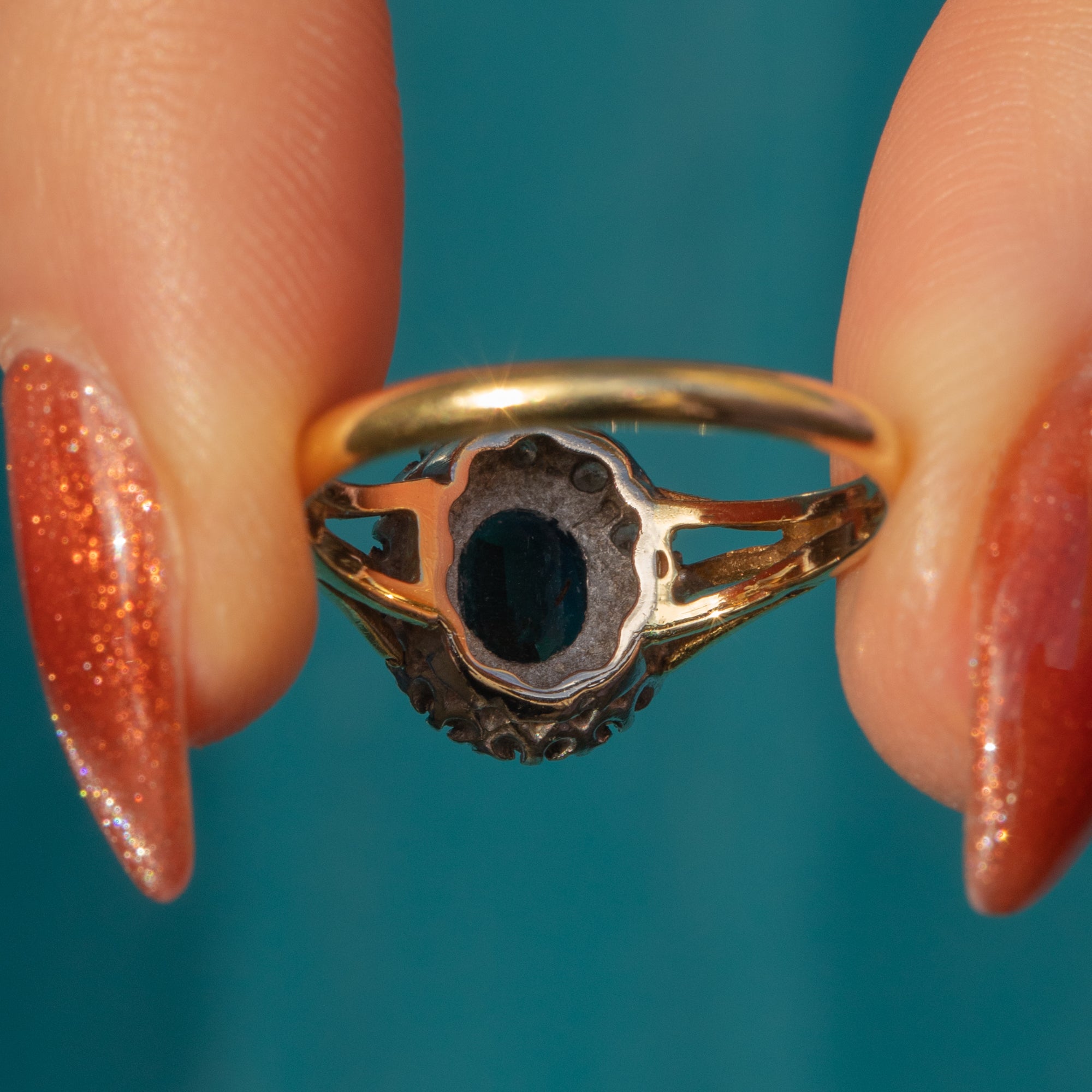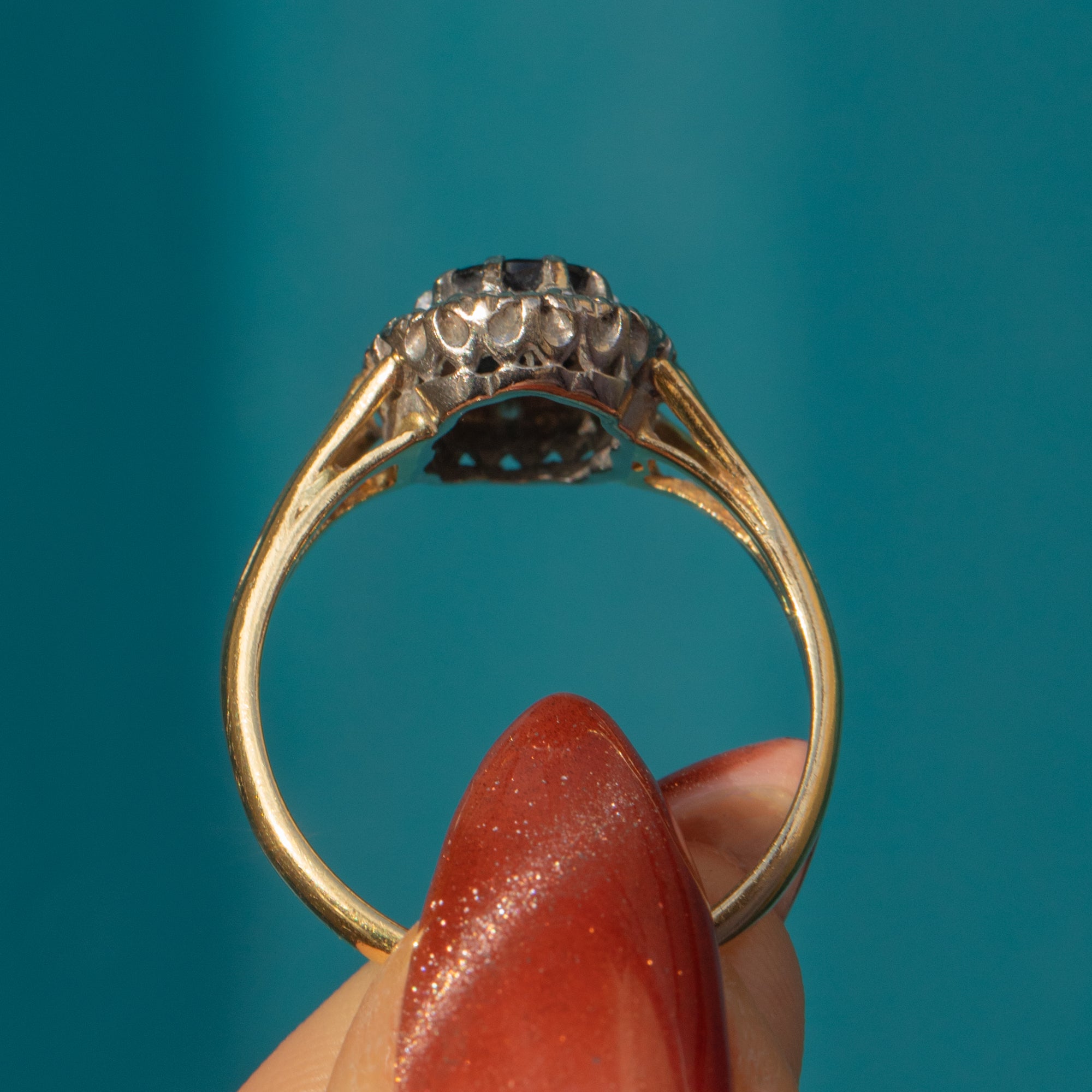 This Art Deco 18ct Gold Sapphire Diamond cluster ring is an antique delight!