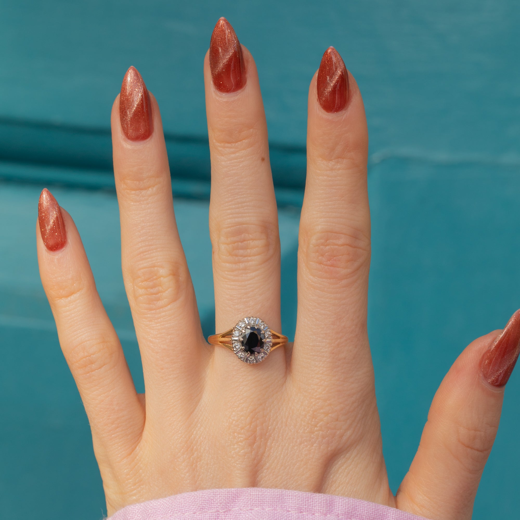 Crafted from sumptuous 18ct Gold, this Art Deco ring features a radiant natural 0.65ct Sapphire in her centre, faceted beautifully to reveal deep midnight blue hues. She is adorned by a celestial halo of scintillating Diamonds, their bright sparkle complementing the richly saturated Sapphire.