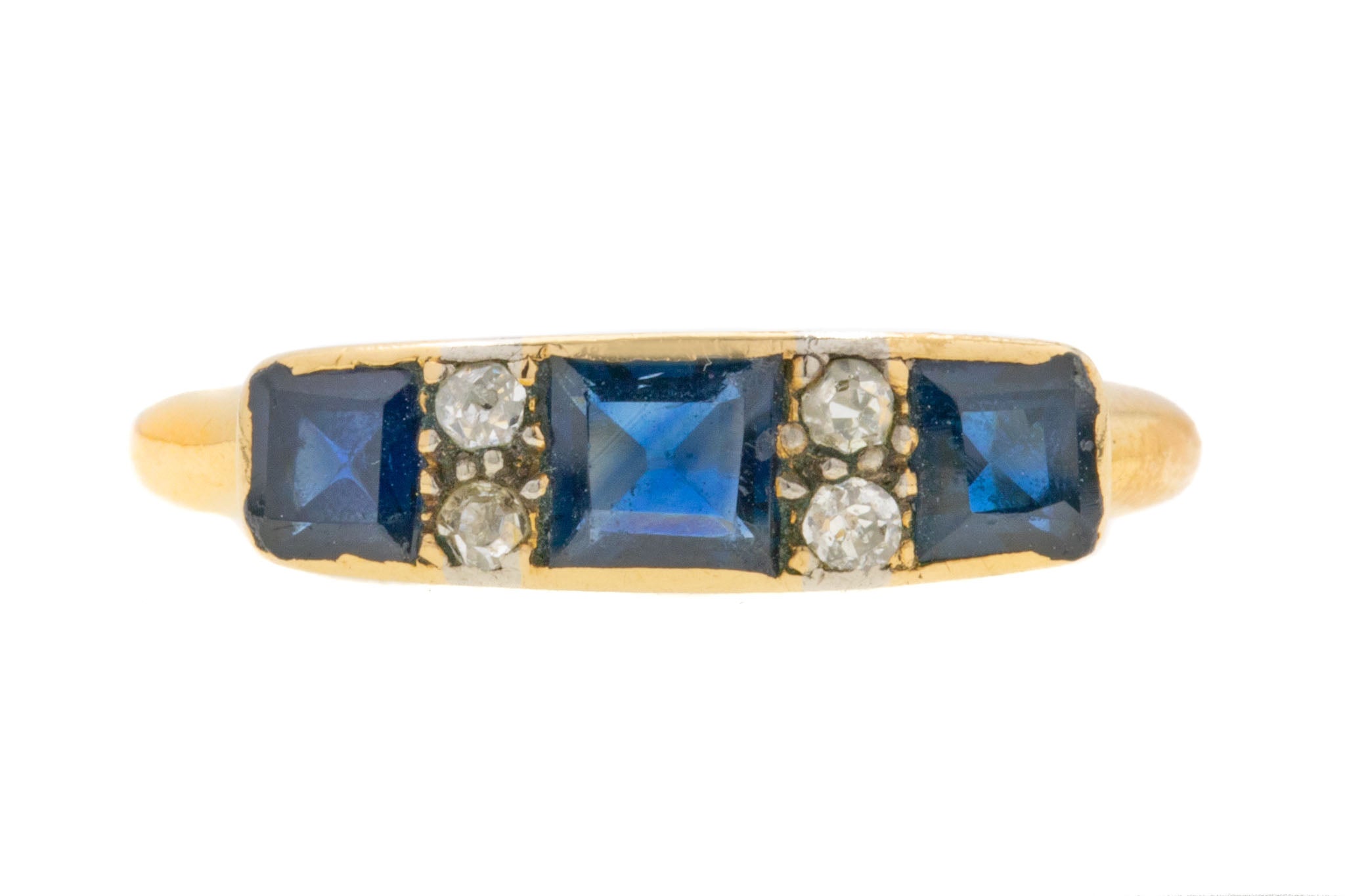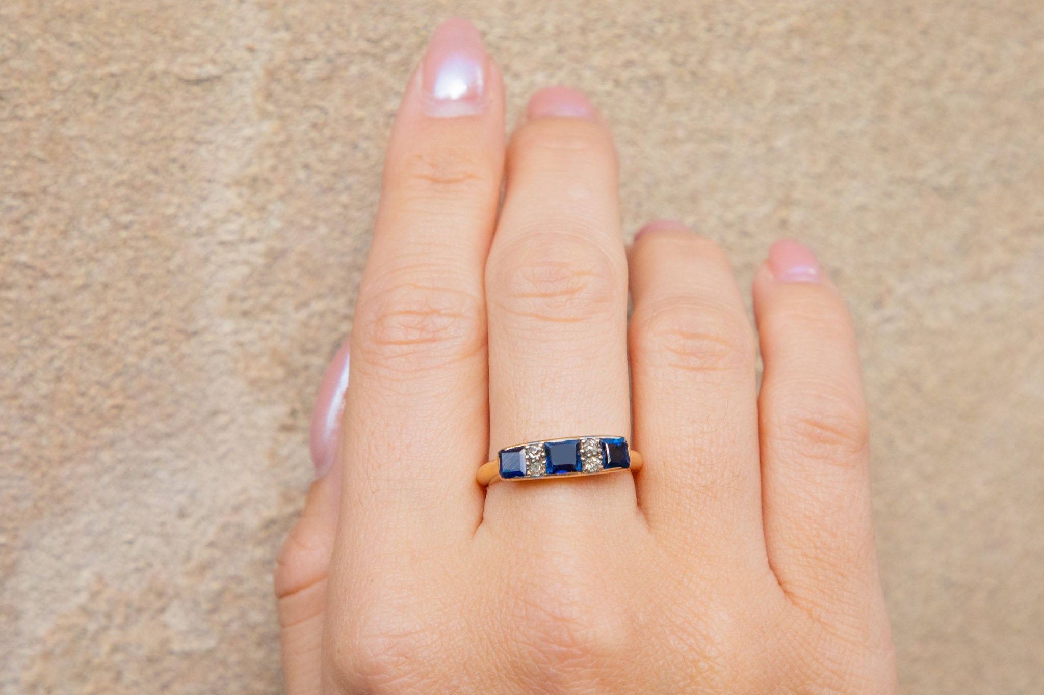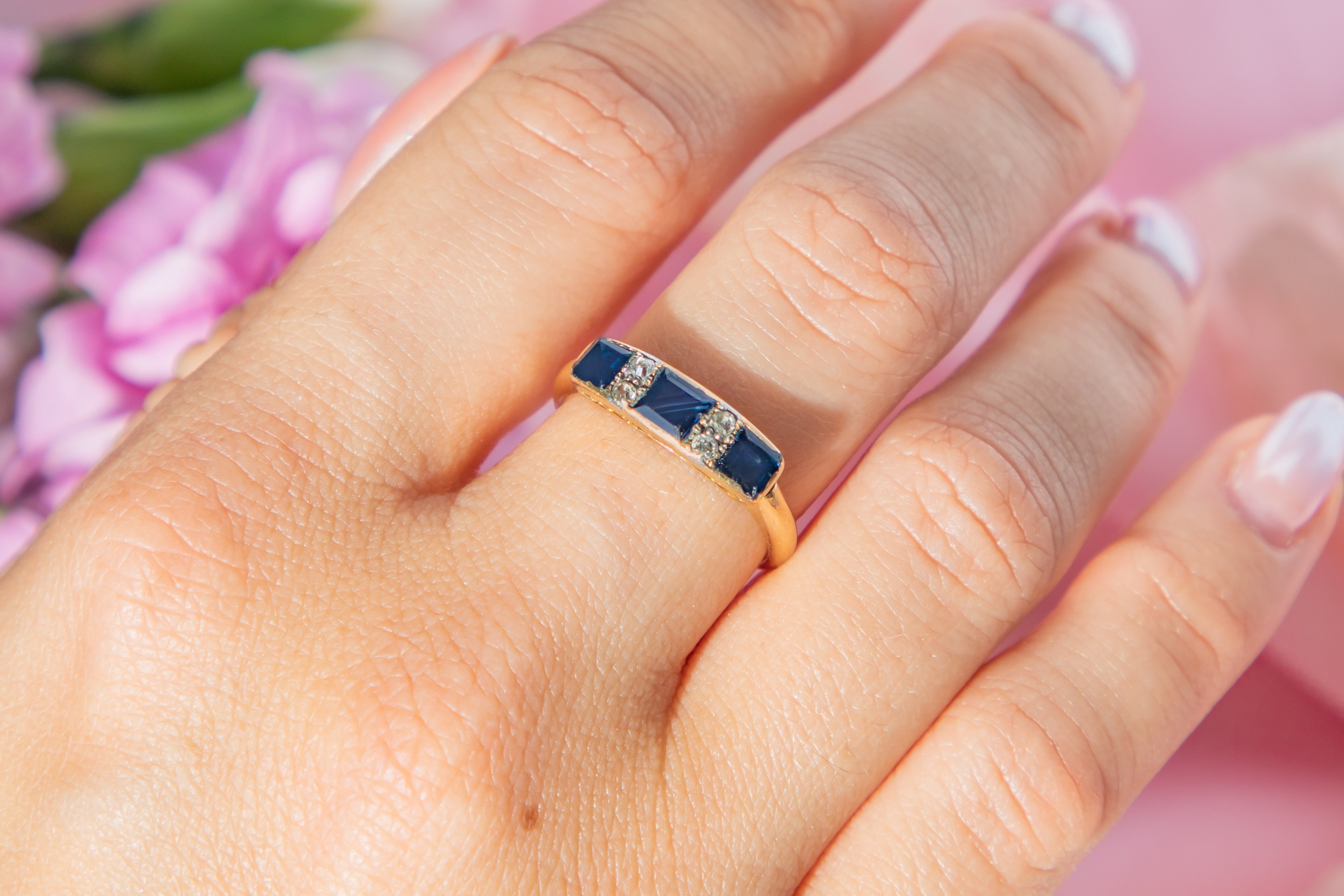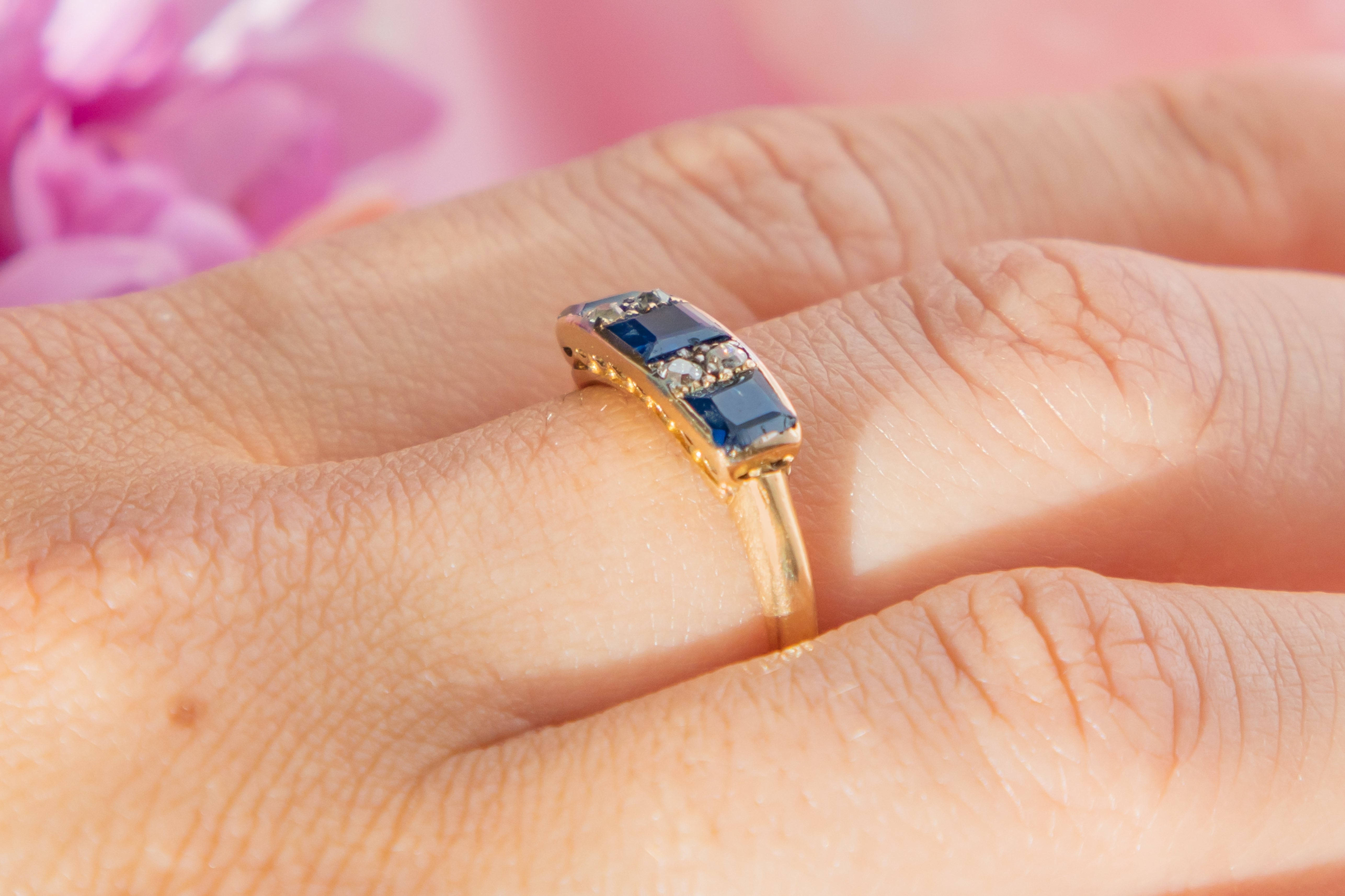This Art Deco 18ct Gold Sapphire Diamond ring is a fine example of craftsmanship during the early 1900s! Boasting three square Sapphires, flaunting moody deep blue hues, with four mesmerising Diamonds nestled between - she looks as though she has been plucked from the night sky!