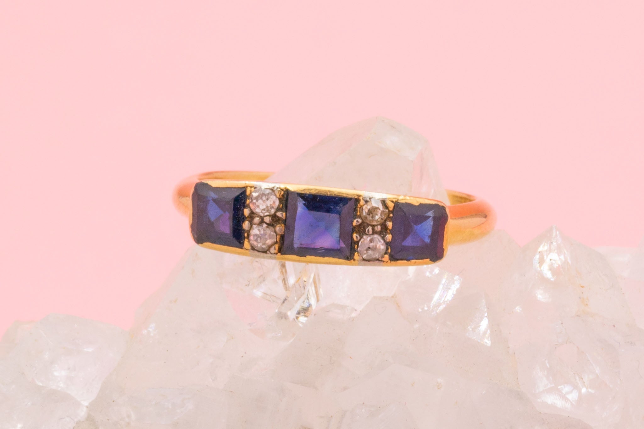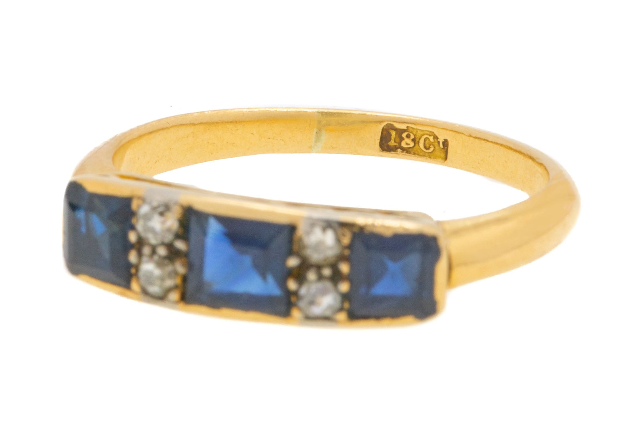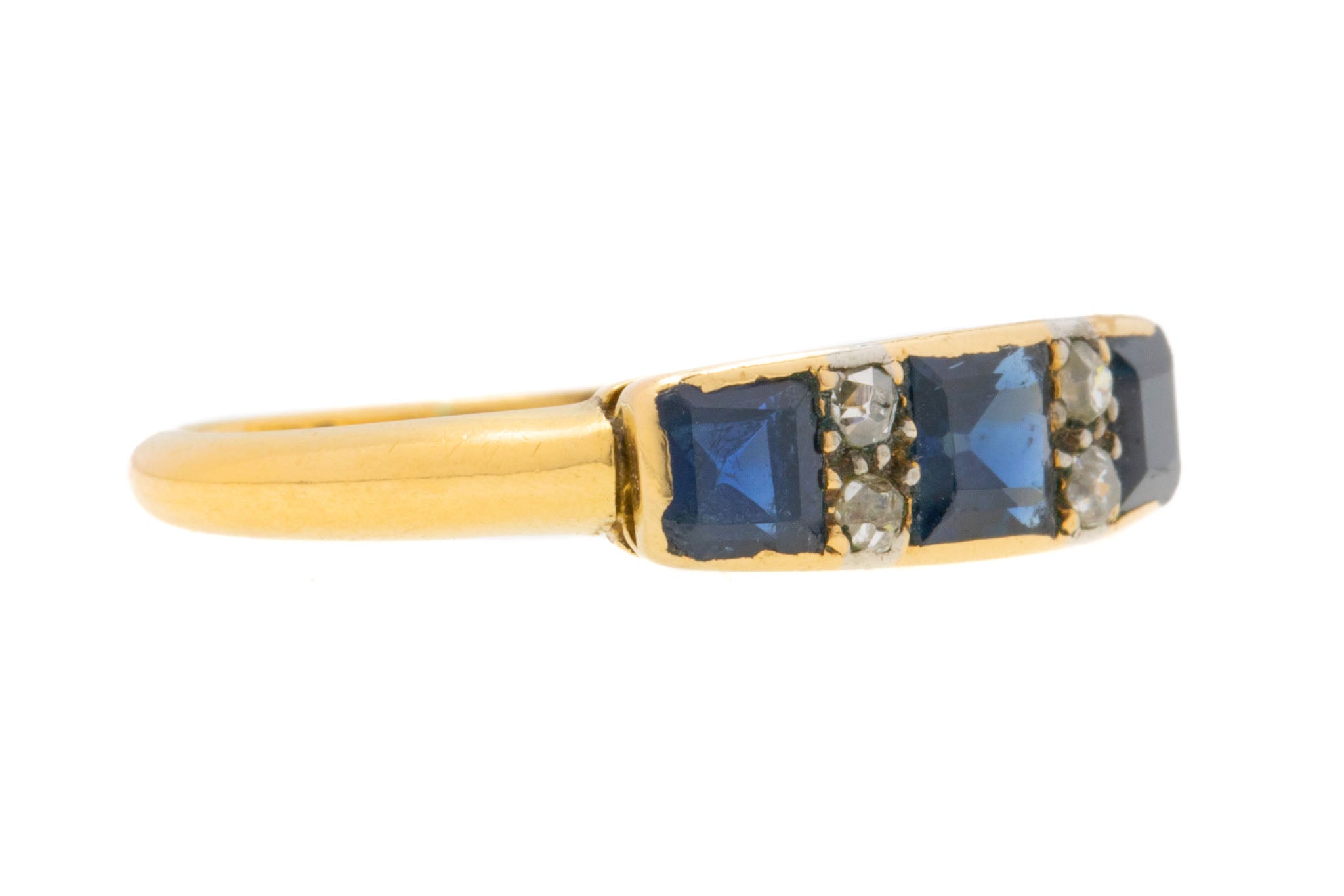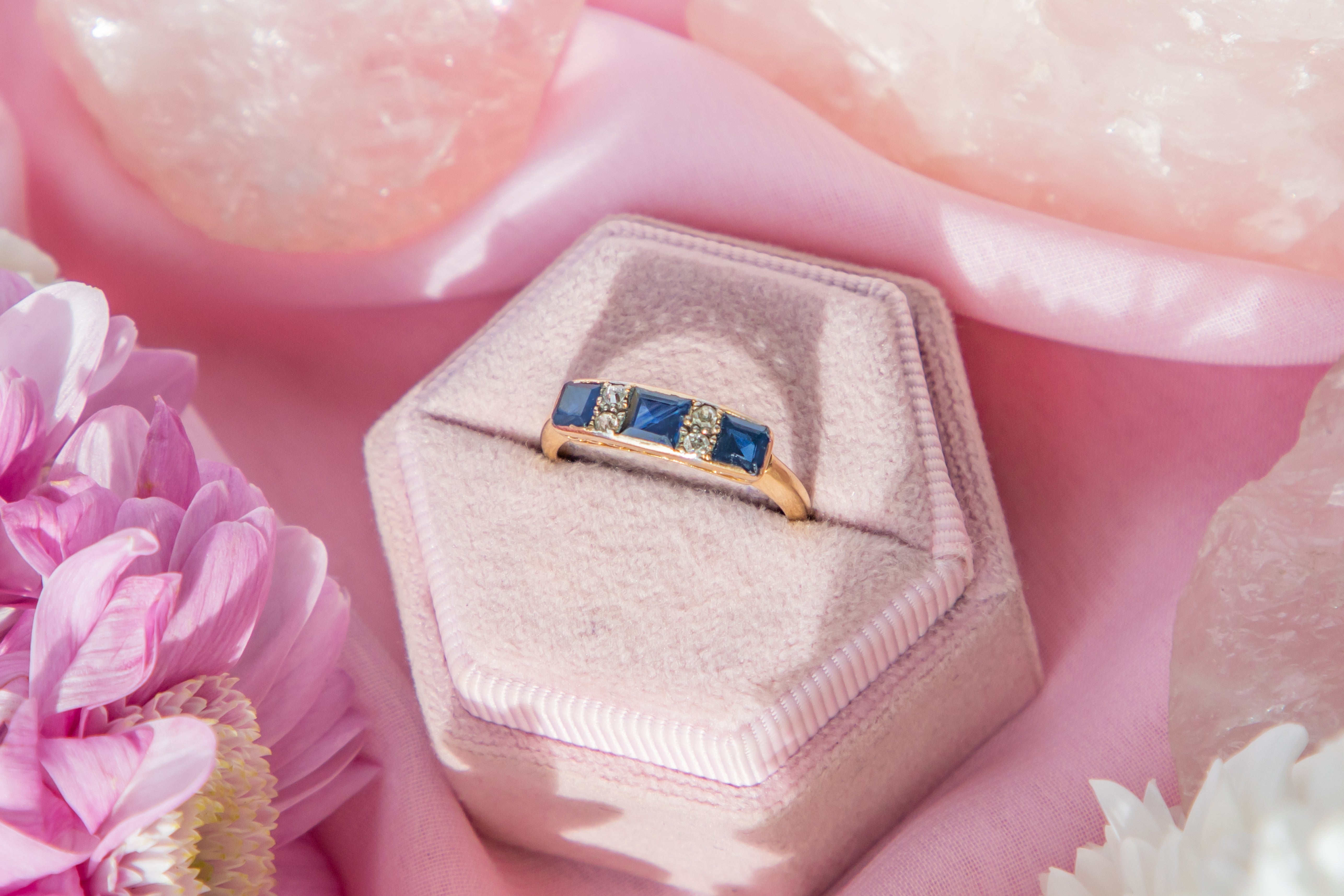 This Art Deco 18ct Gold Sapphire Diamond ring is a fine example of craftsmanship during the early 1900s! Boasting three square Sapphires, flaunting moody deep blue hues, with four mesmerising Diamonds nestled between - she looks as though she has been plucked from the night sky!