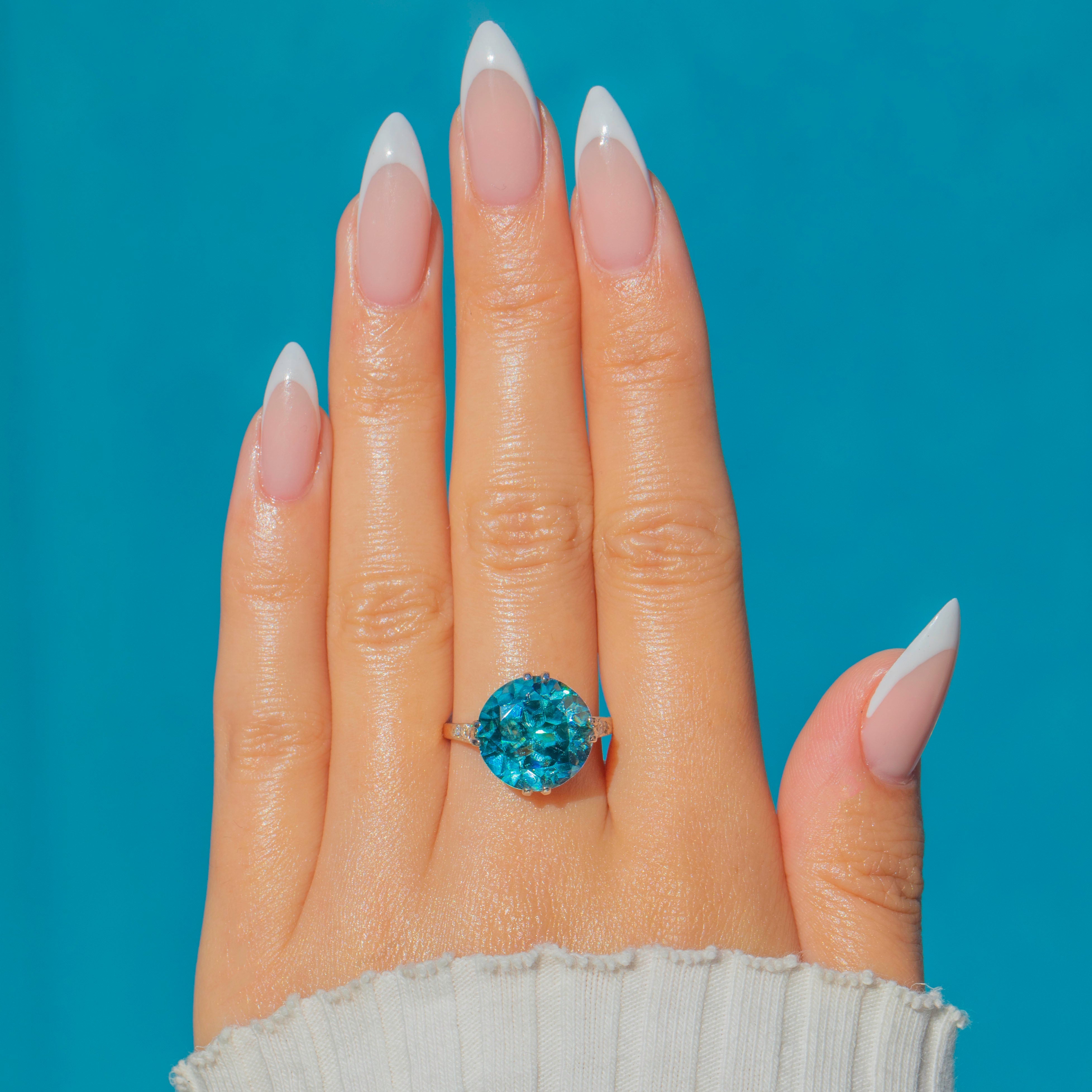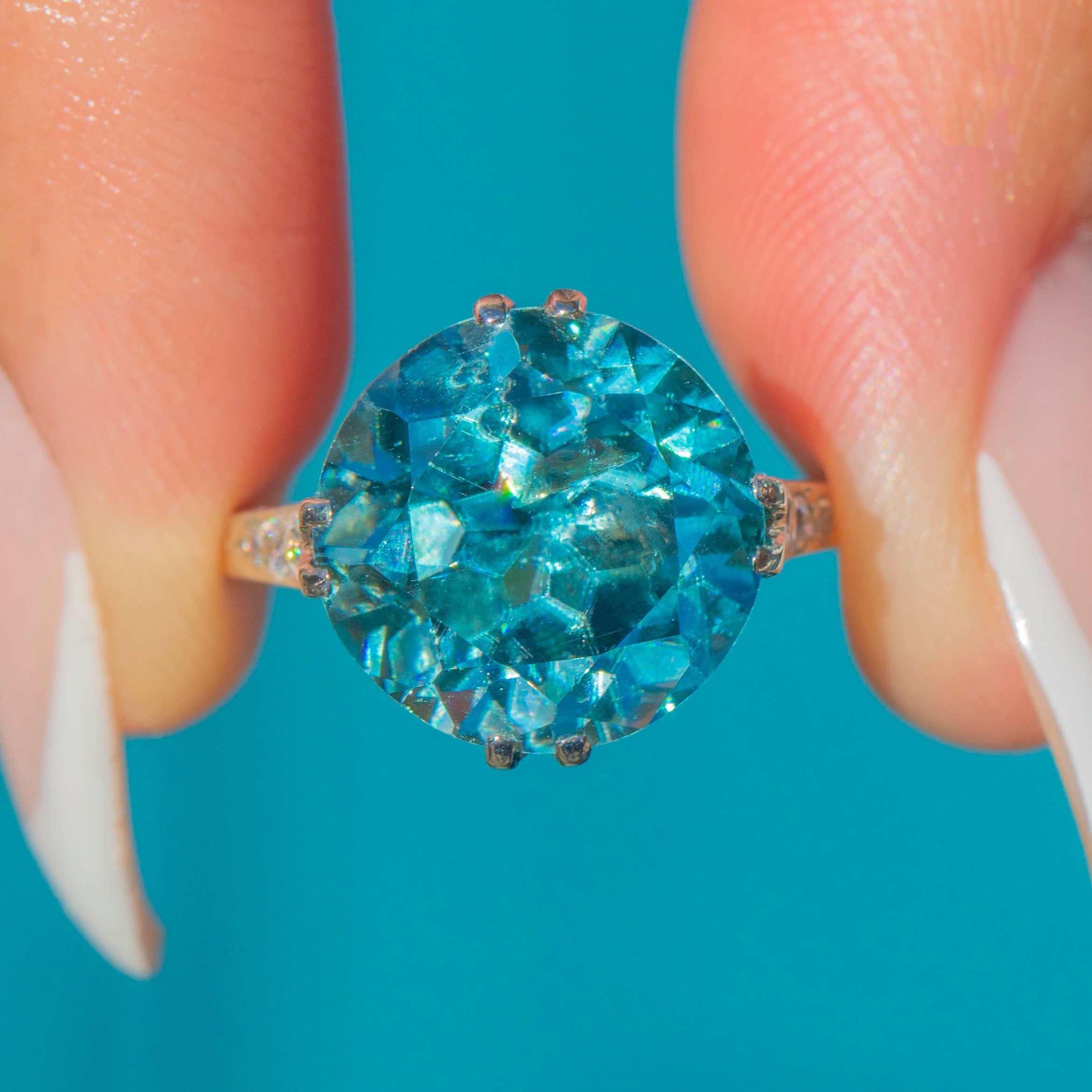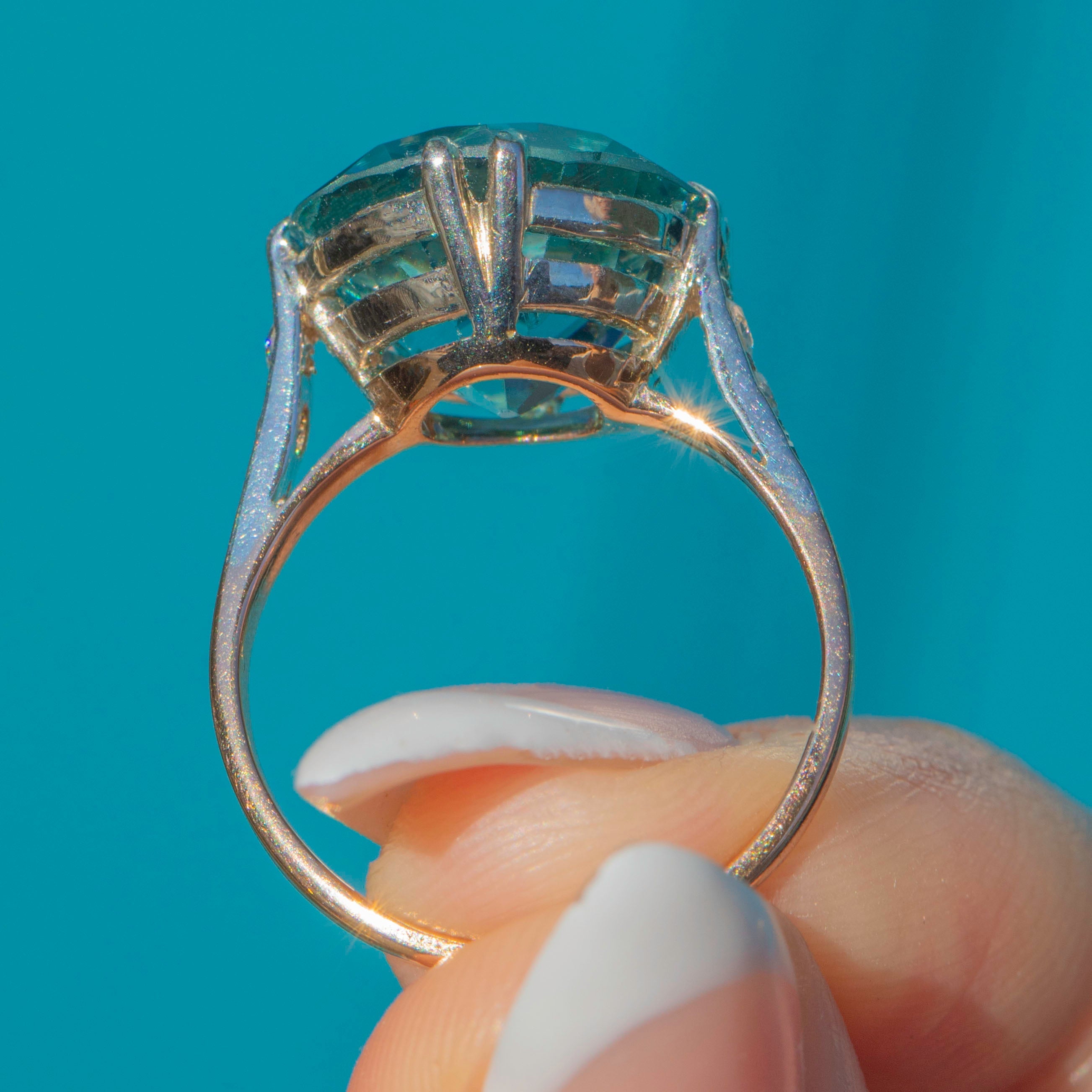 This spectacular Art Deco ring is set with a dazzling Zircon of approximately 11 carats. The Zircon’s intense teal blue hue glitters with brilliance and fire, displaying the remarkable dispersion that makes this gemstone so prized. Its impressive size and radiant sparkle make it a true statement piece.