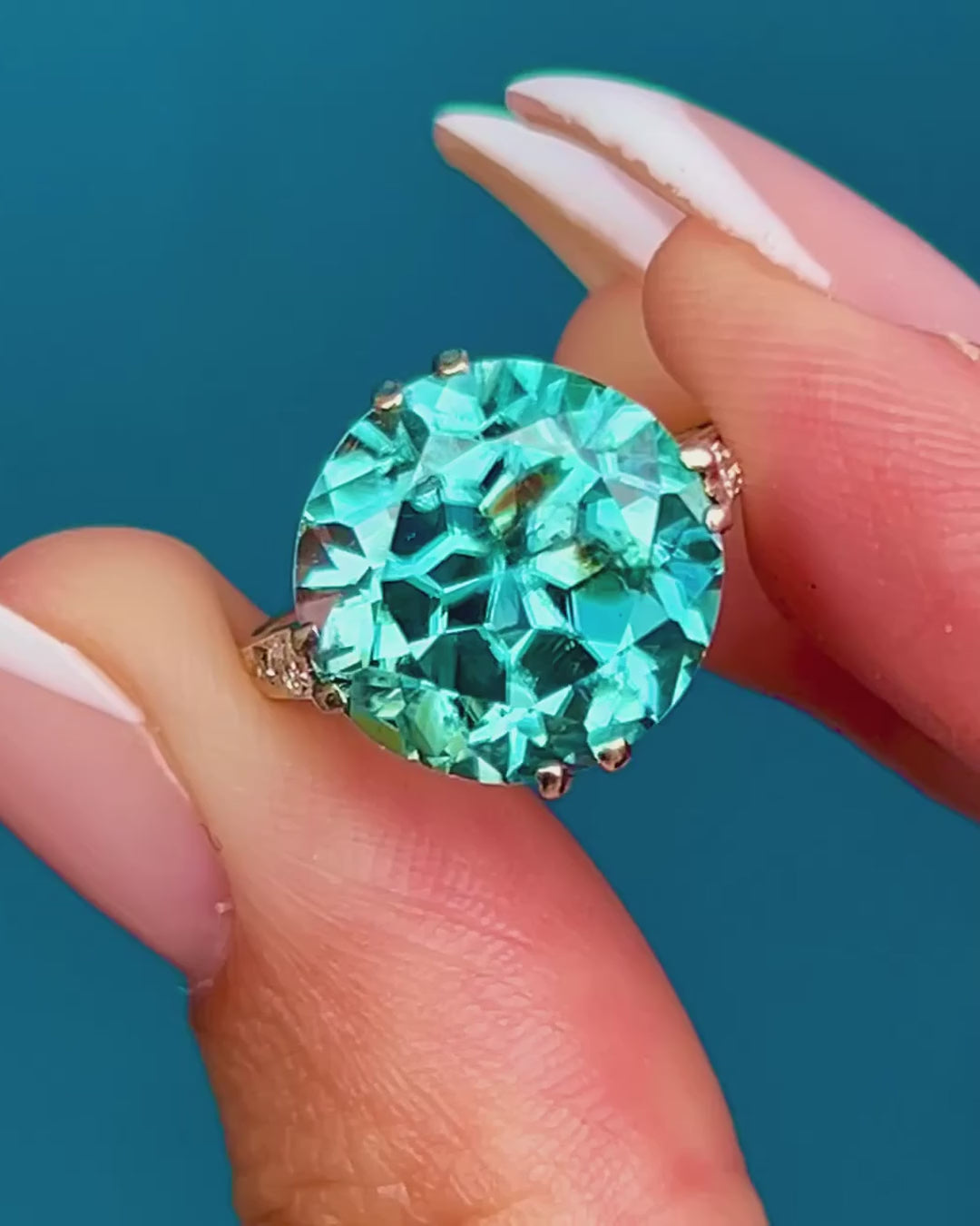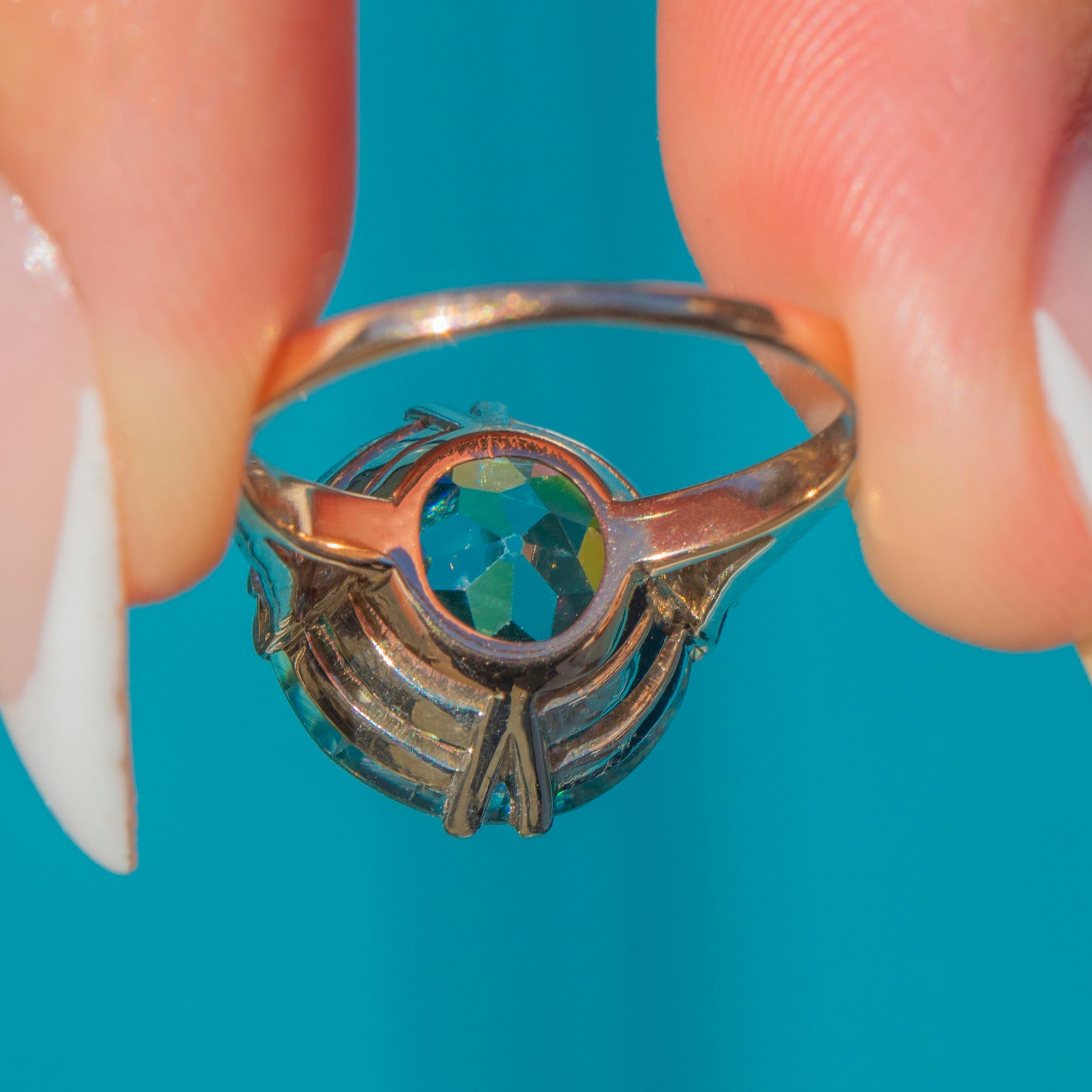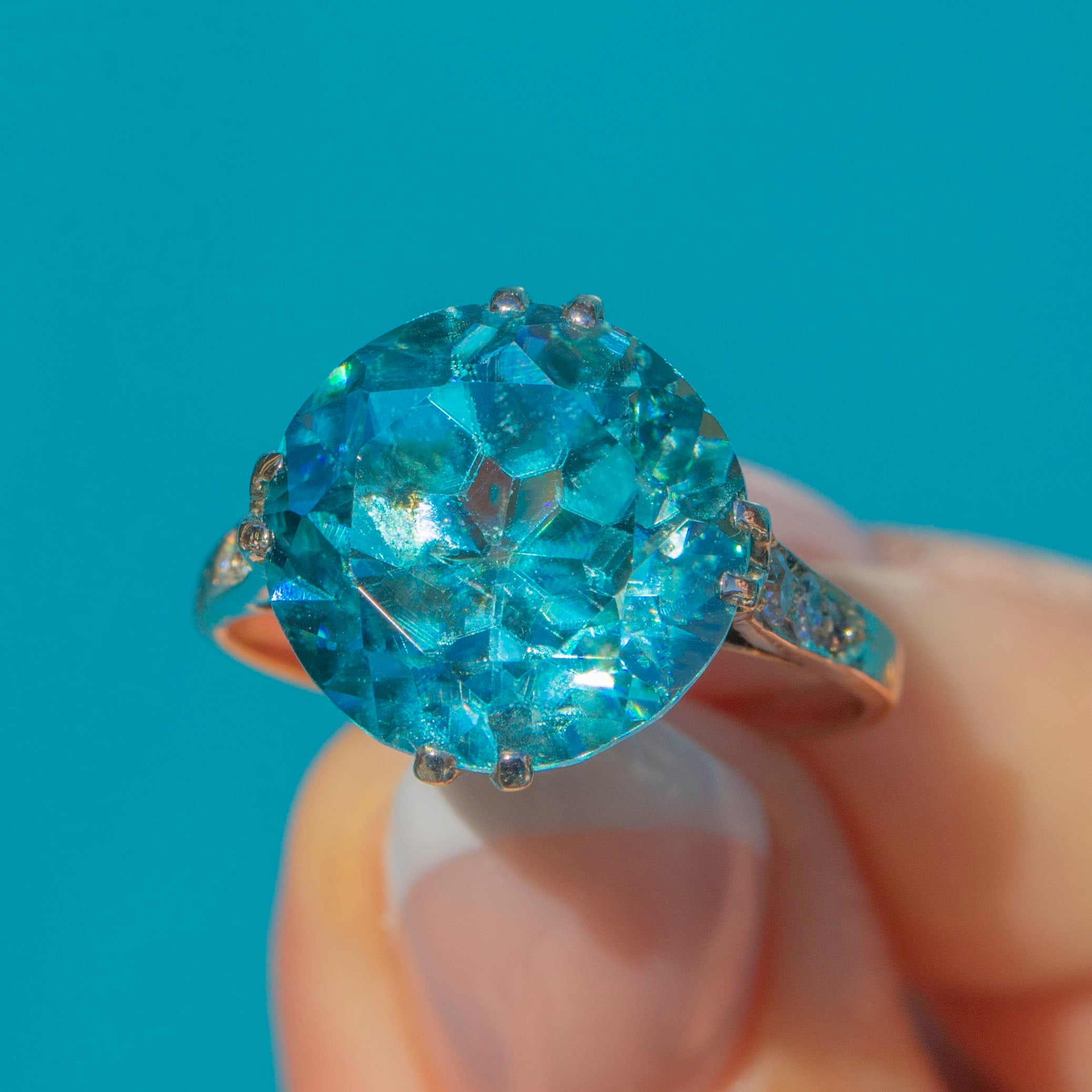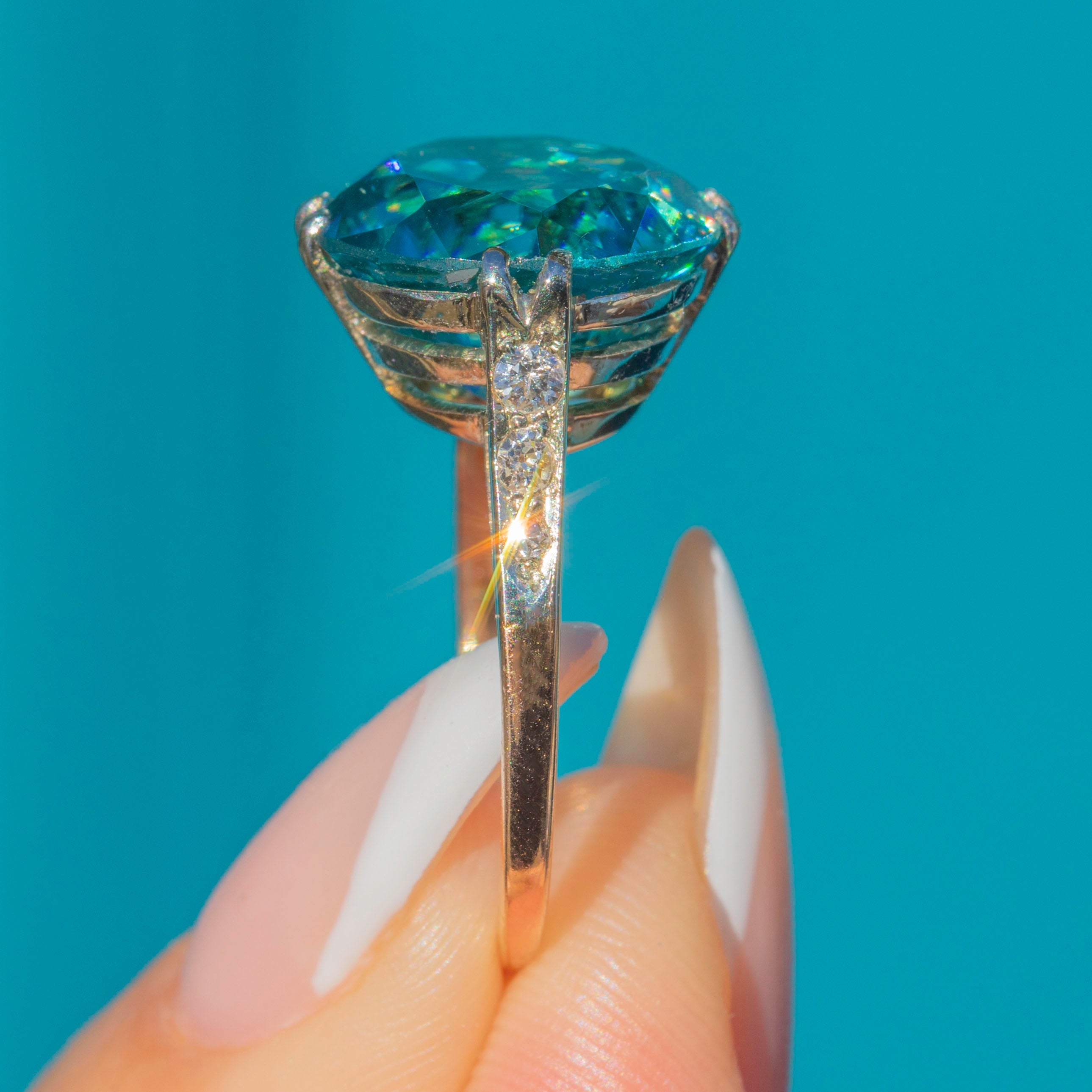This spectacular Art Deco ring is set with a dazzling Zircon of approximately 11 carats. The Zircon’s intense teal blue hue glitters with brilliance and fire, displaying the remarkable dispersion that makes this gemstone so prized. Its impressive size and radiant sparkle make it a true statement piece.
