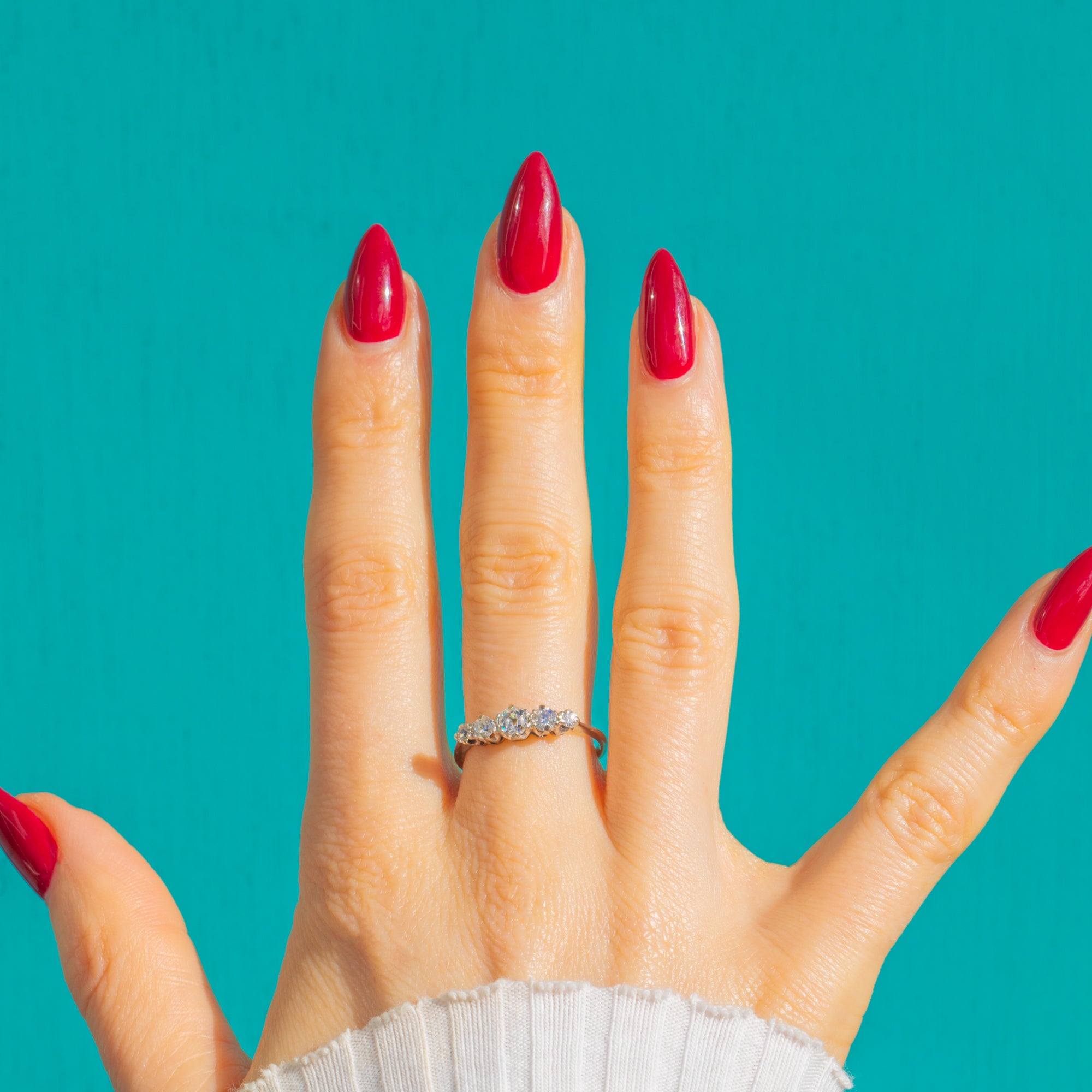 A timeless Art Deco five-stone ring, elegantly set with a graduated row of sparkling Diamonds in luxurious 18ct White Gold. The central stone takes pride of place, flanked by neatly proportioned companions that taper gracefully for a refined, balanced silhouette.