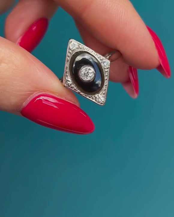 Can we take a moment to appreciate this Art Deco 18ct white Gold Onyx Diamond panel ring! Art Deco in every way, her geometric form is inlaid with a smooth Onyx cabochon studded with a 0.14ct dazzling Diamond at her centre.