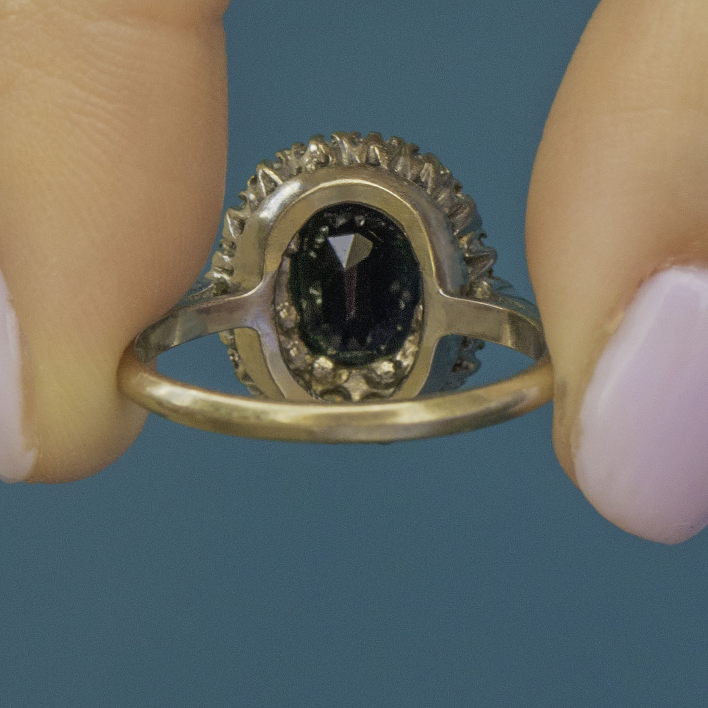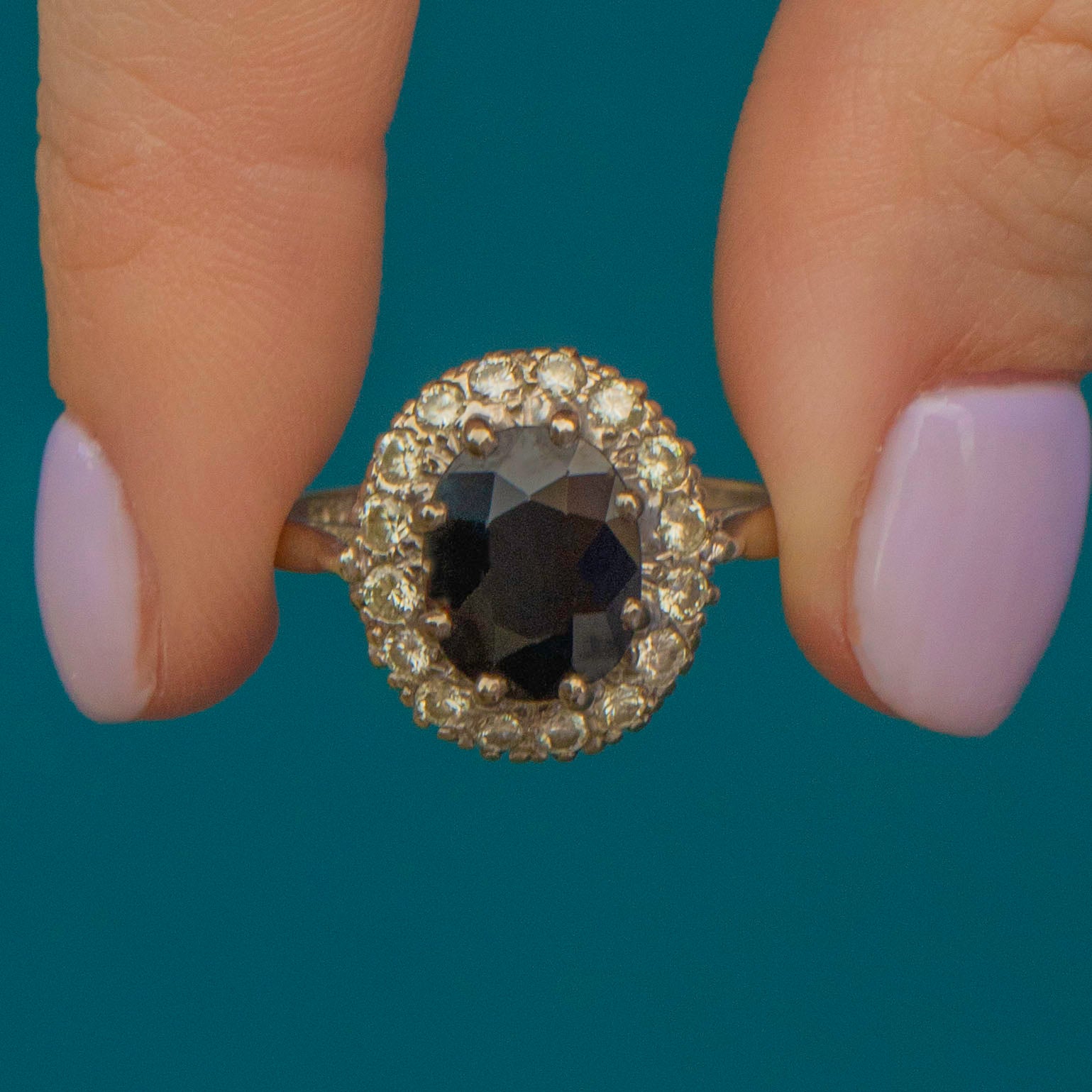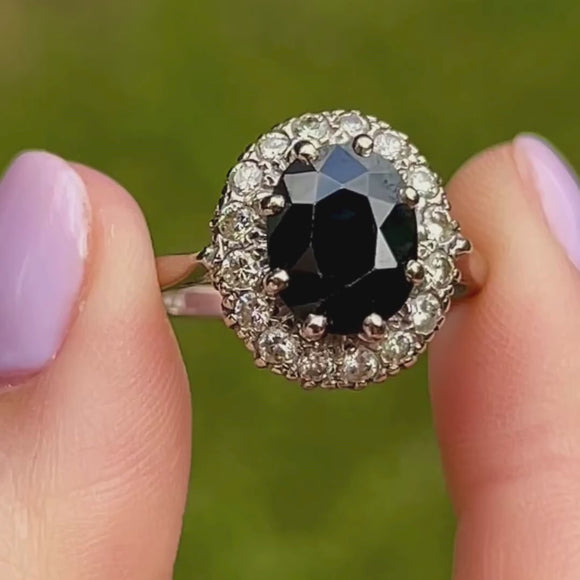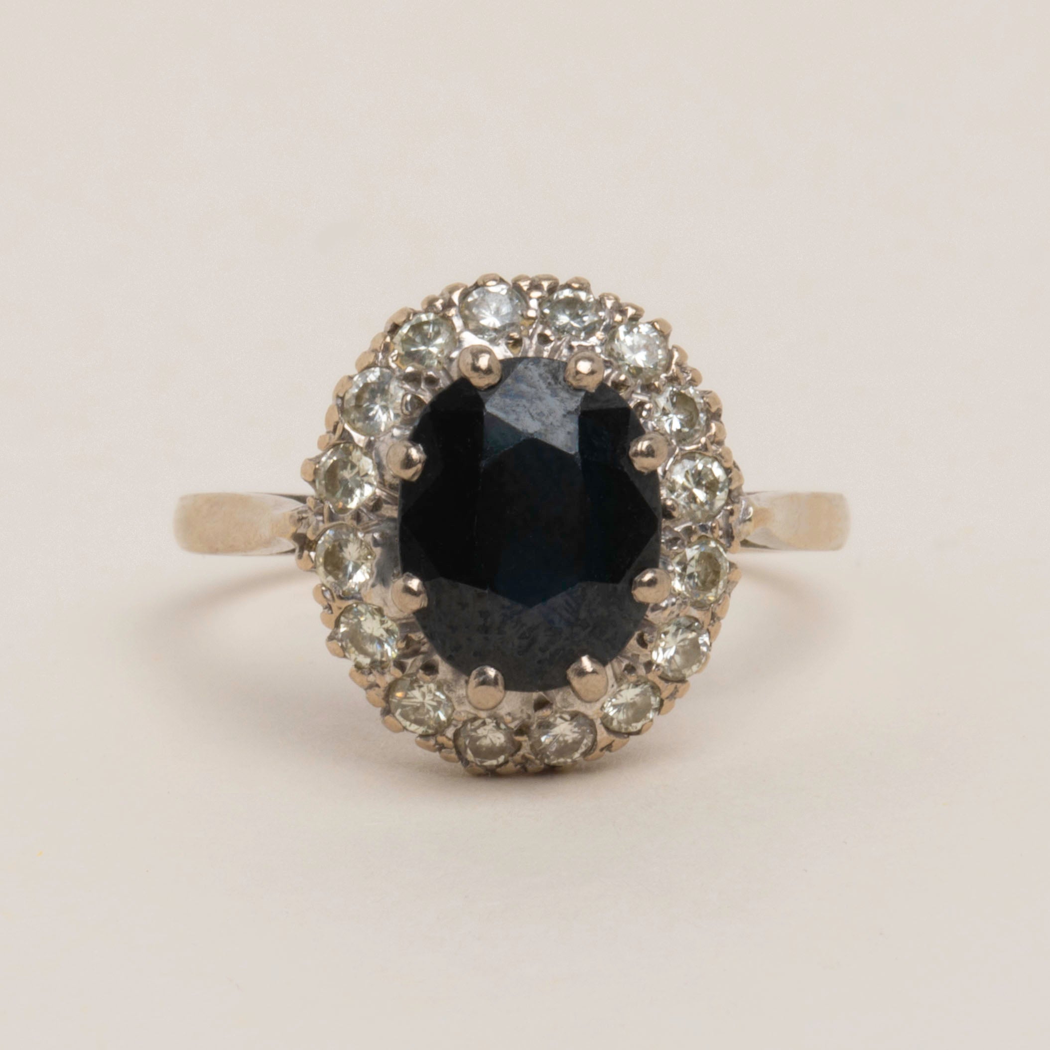For those in search of a ring akin to the engagement ring of the late Princess Diana, this Art Deco 18ct white Gold Sapphire Diamond cluster ring could be the one! A royal blue 1.30ct natural Sapphire sits poised at her centre haloed by a sea of Diamonds, providing a myriad of vivacious sparkles.