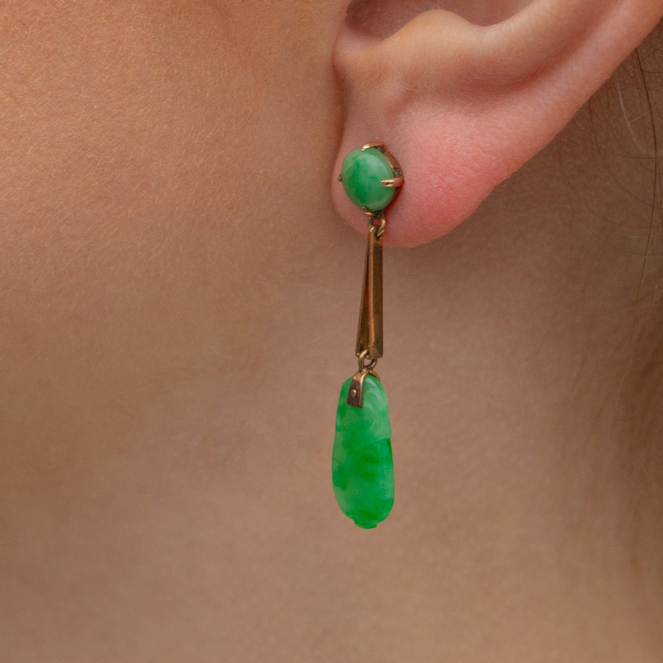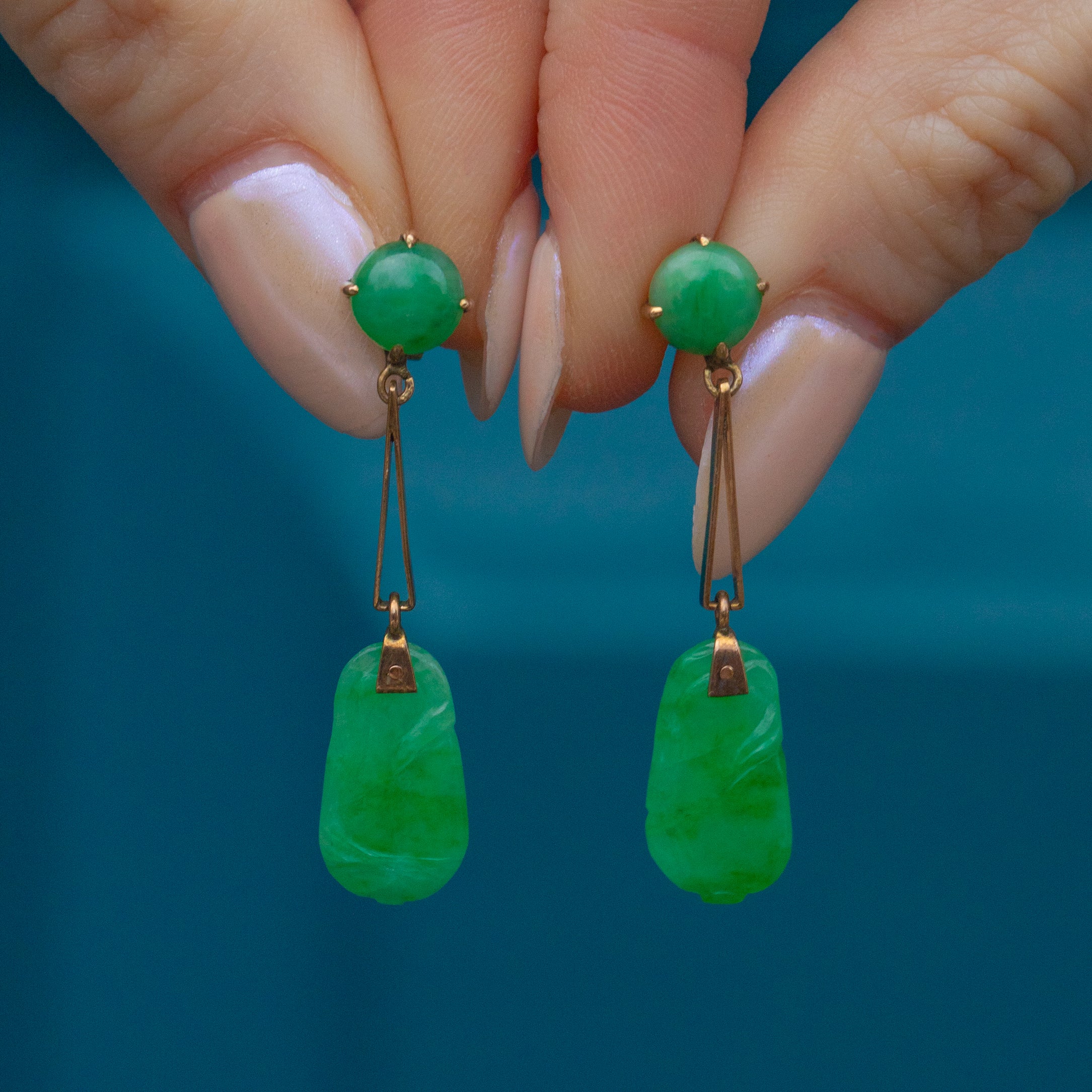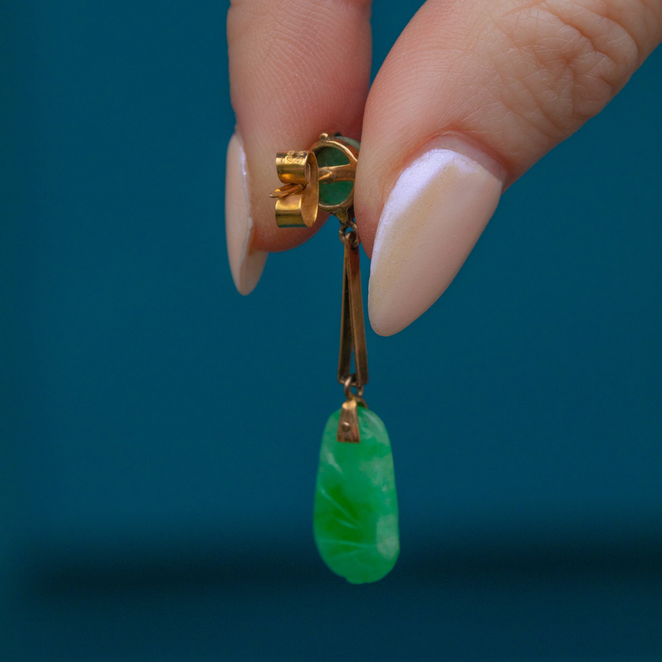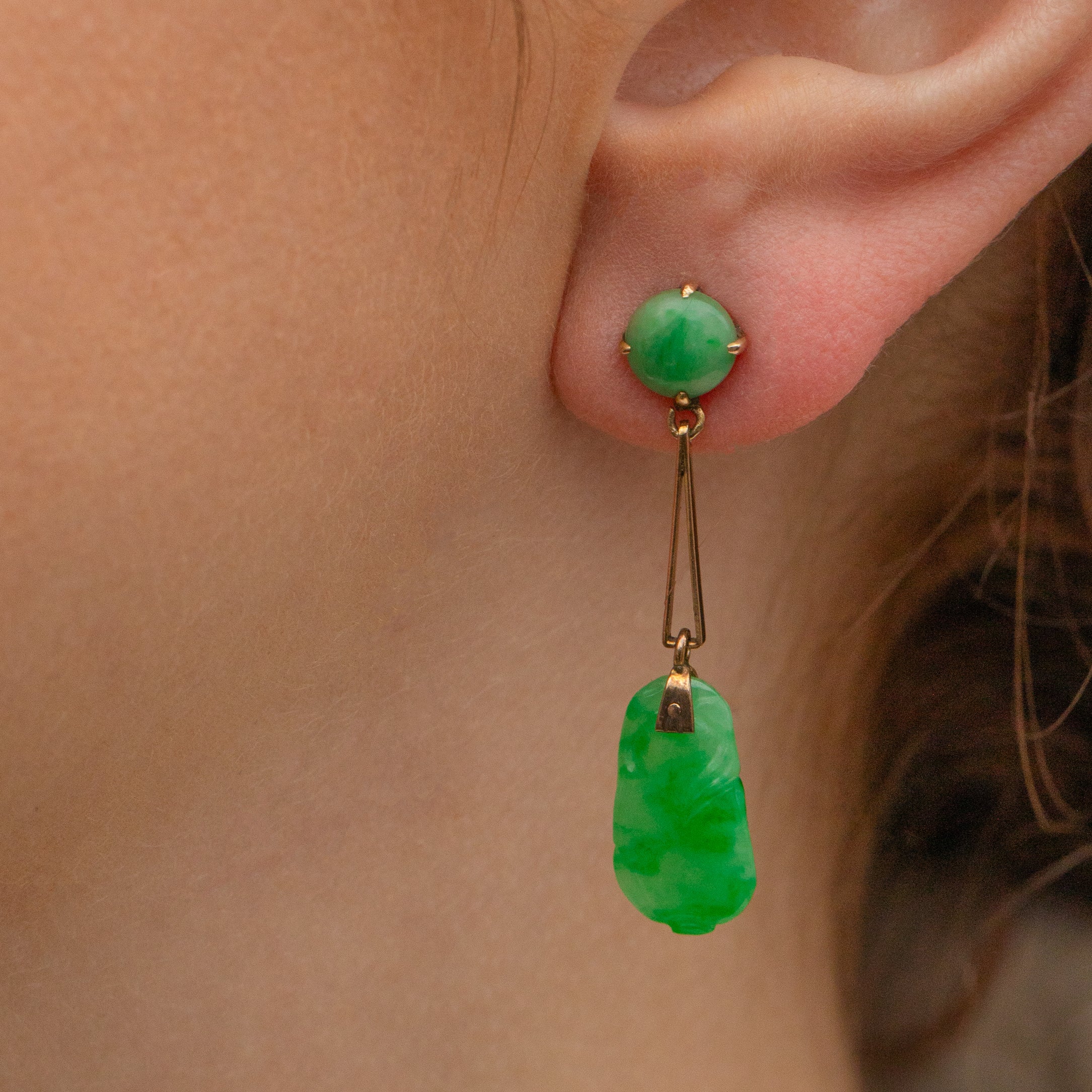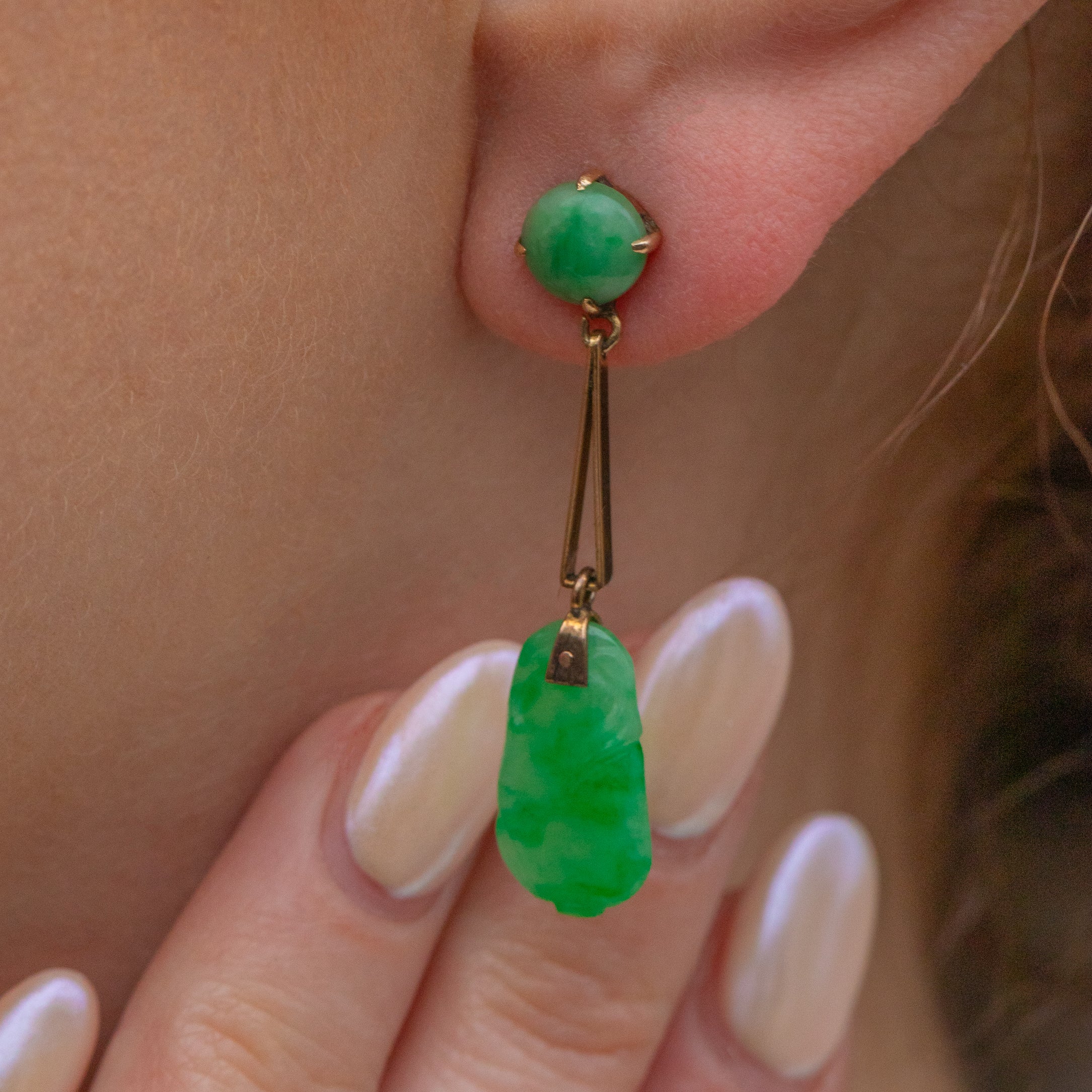 Art Deco 9ct Gold Carved Jade Drop Earrings