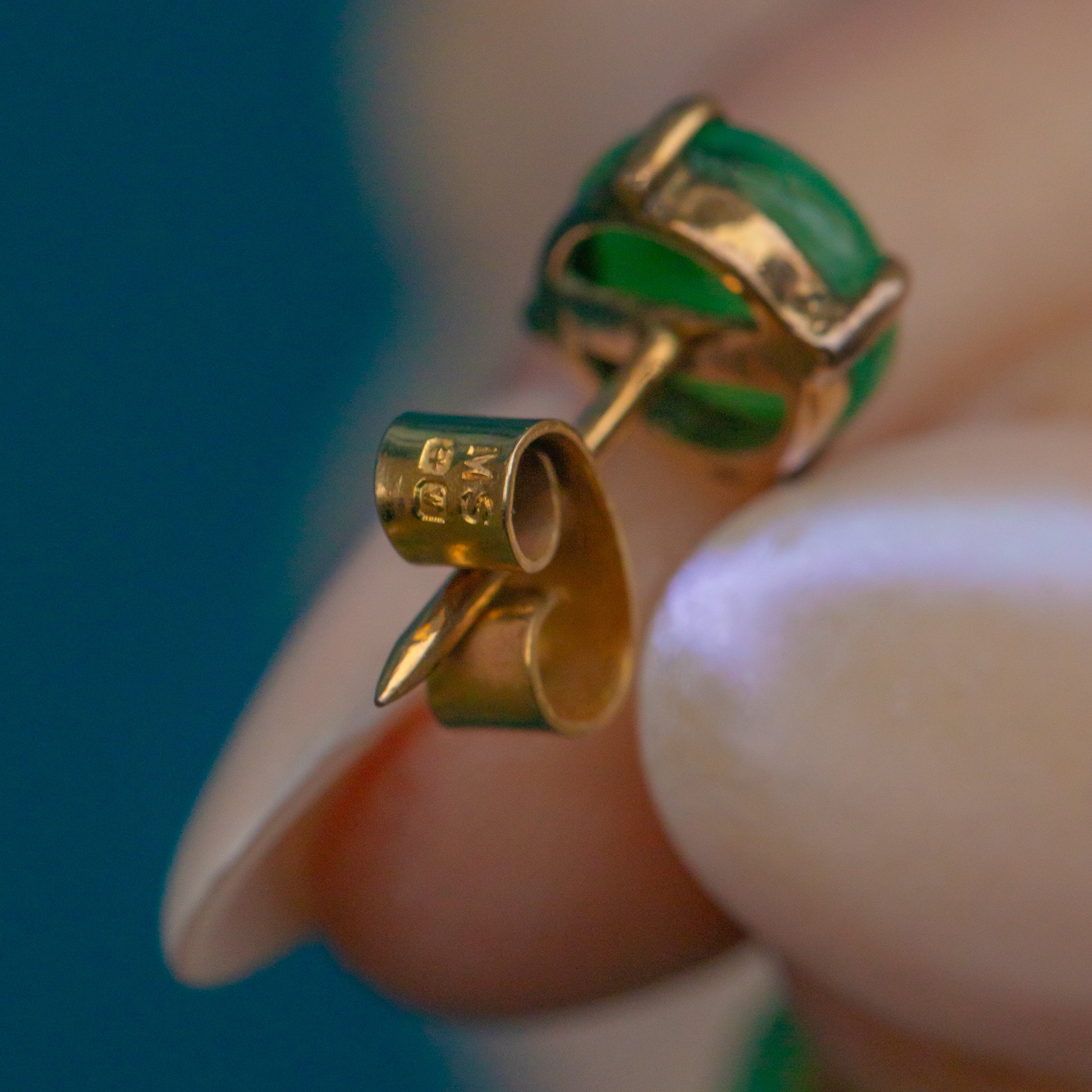 EXCELLENT. These Art Deco 9ct Gold carved Jade drop earrings are in excellent condition. The Jade stones are pristine, with no surface wear to note, and are securely held within their settings. The Gold is smooth and each component is firmly affixed, promising many more years of wear. The butterfly backs slot in securely and snugly, allowing you to enjoy these antique Jade earrings with confidence!