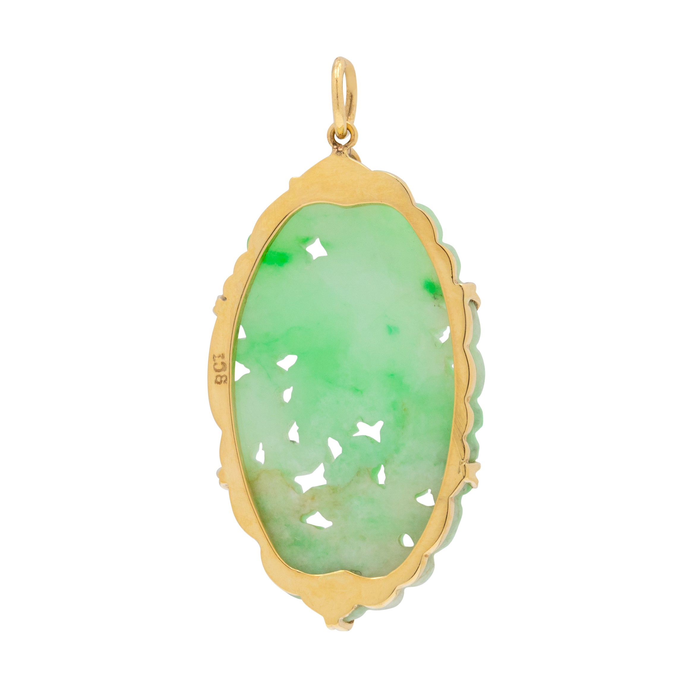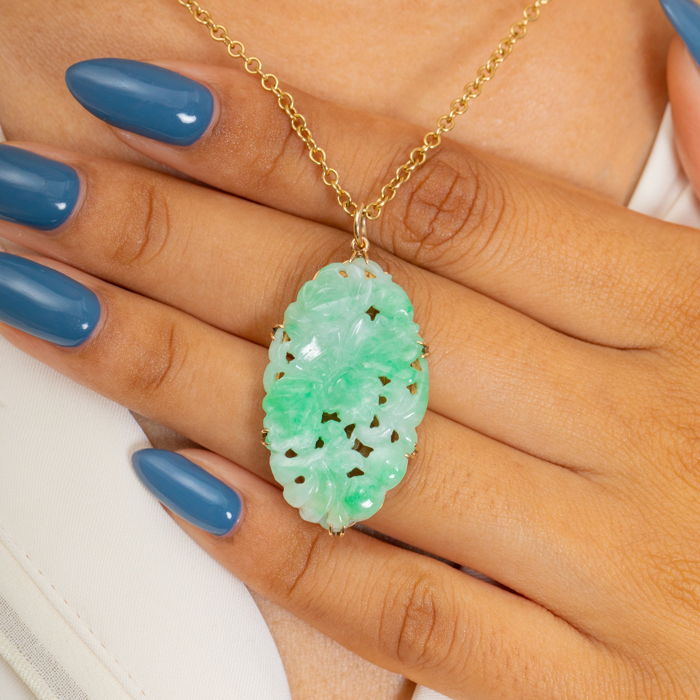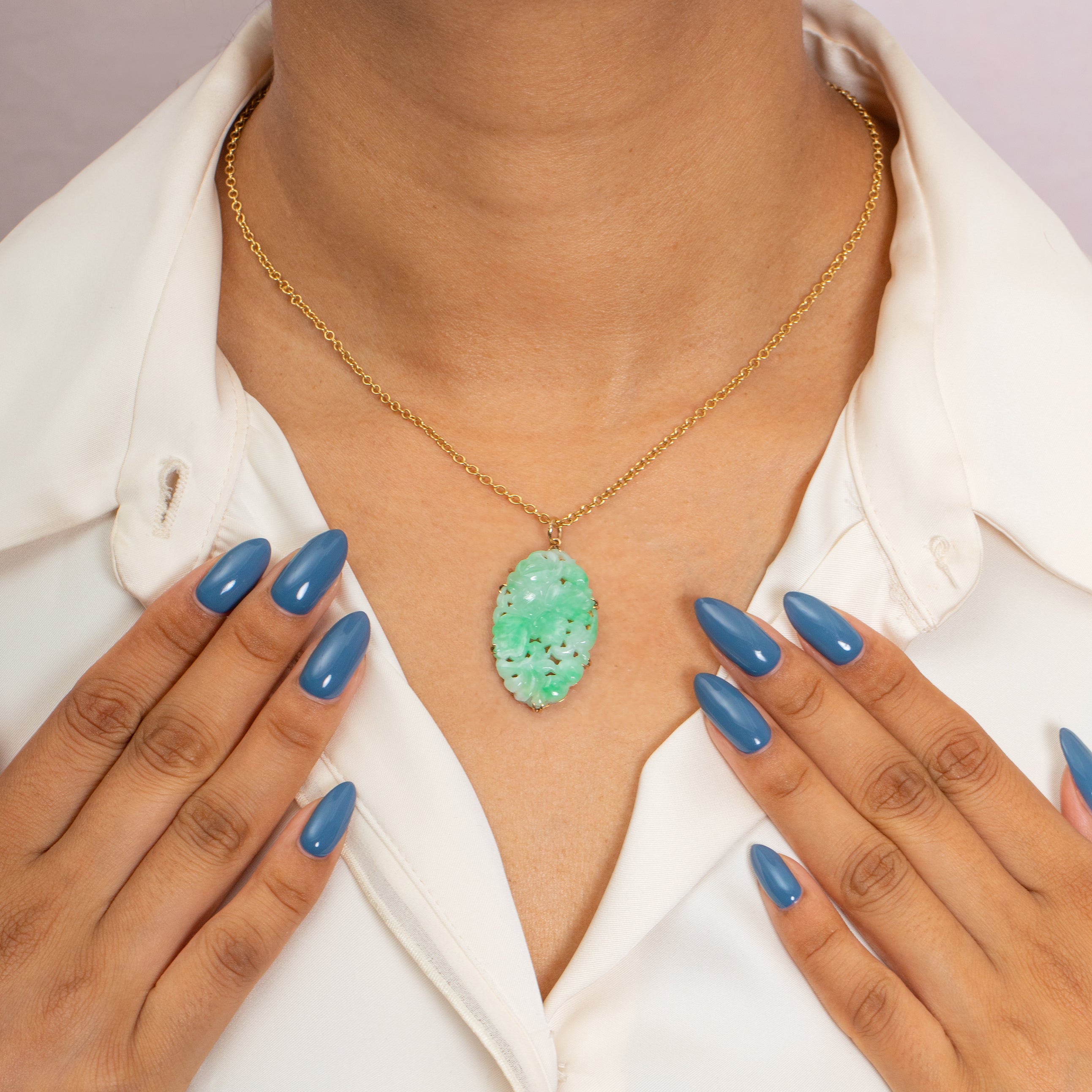 Floral and feminine, this pretty Art Deco 9ct Gold carved Jade pendant is everything you need! The green Jade gemstone is dabbled with seafoam and minty greens, carved to feature foliate motifs.