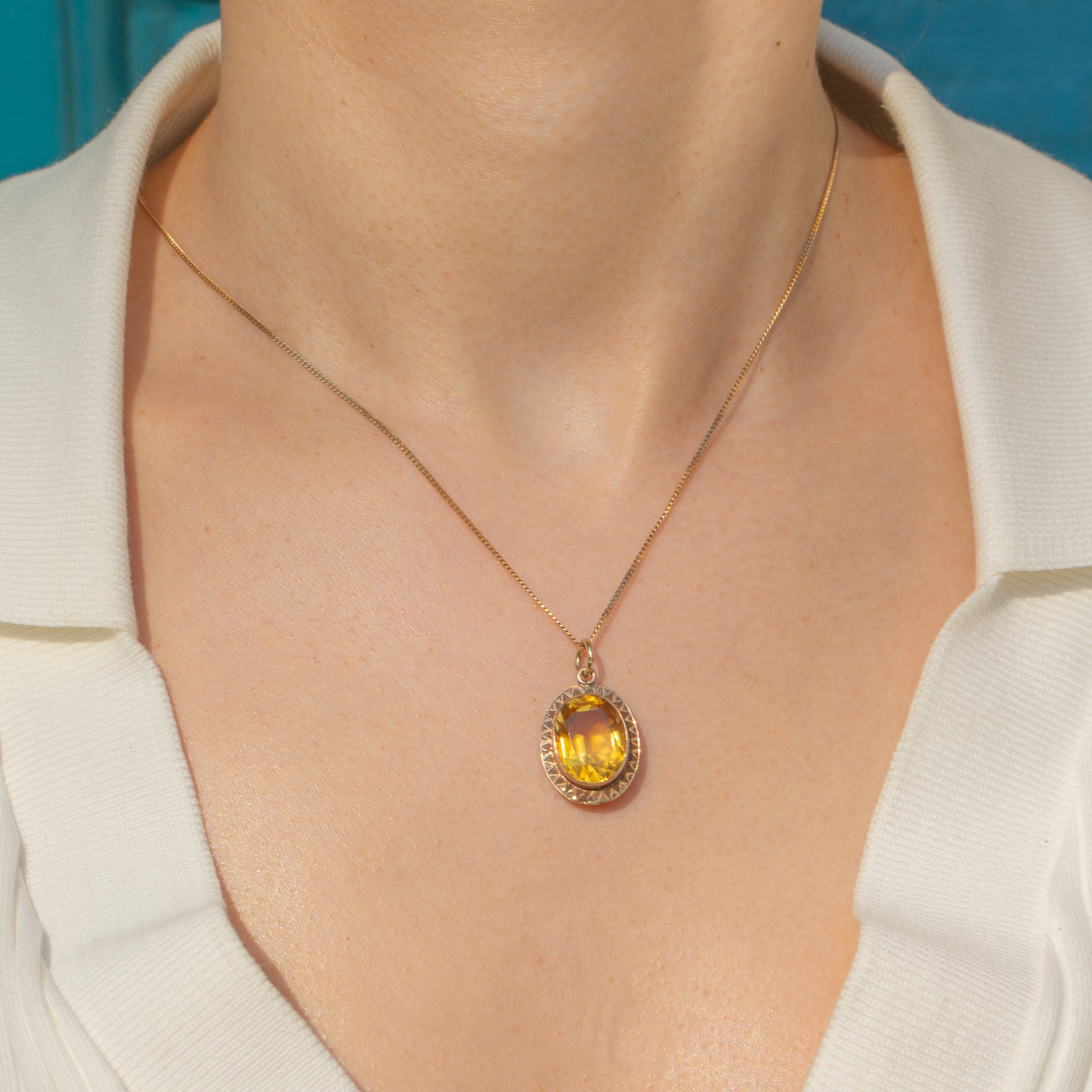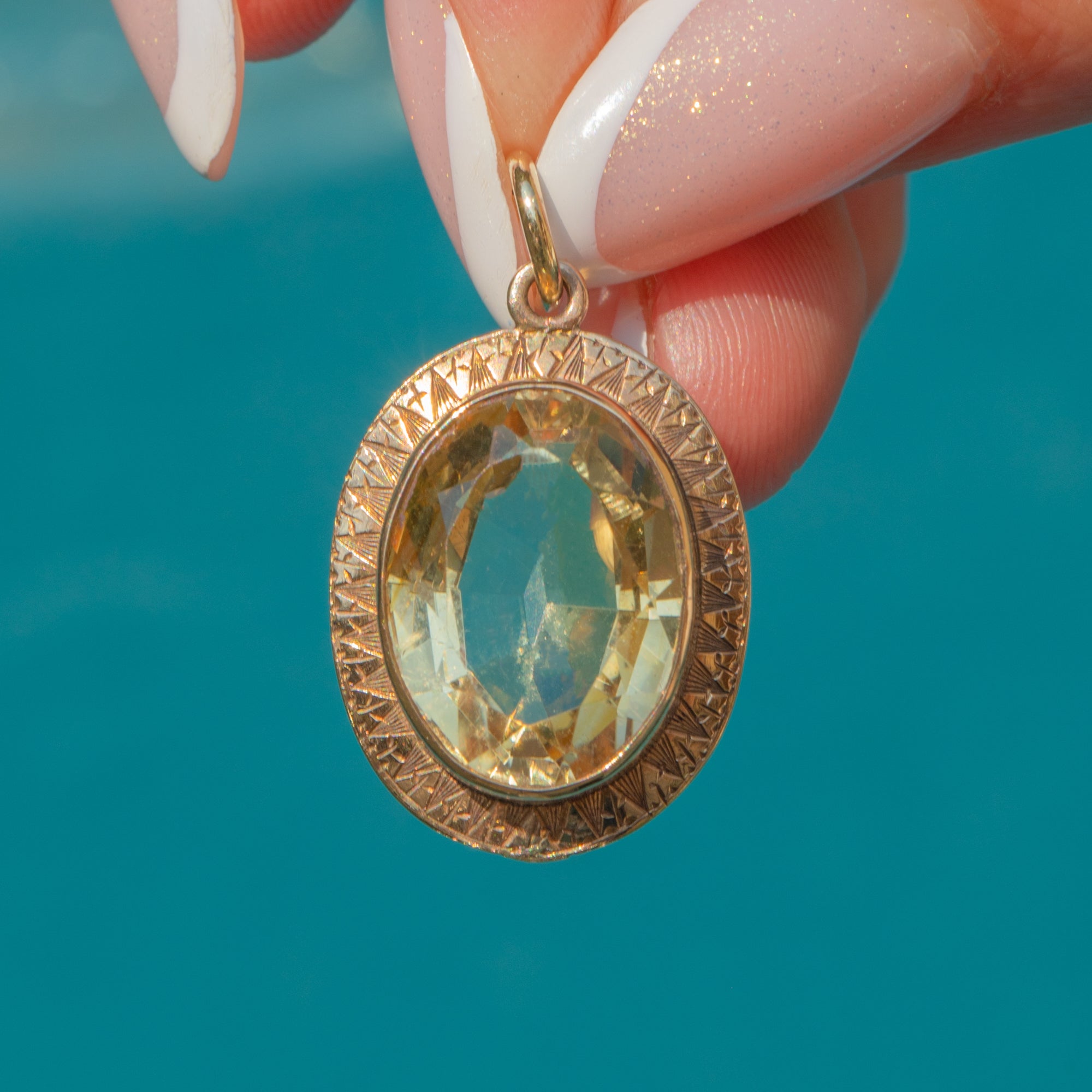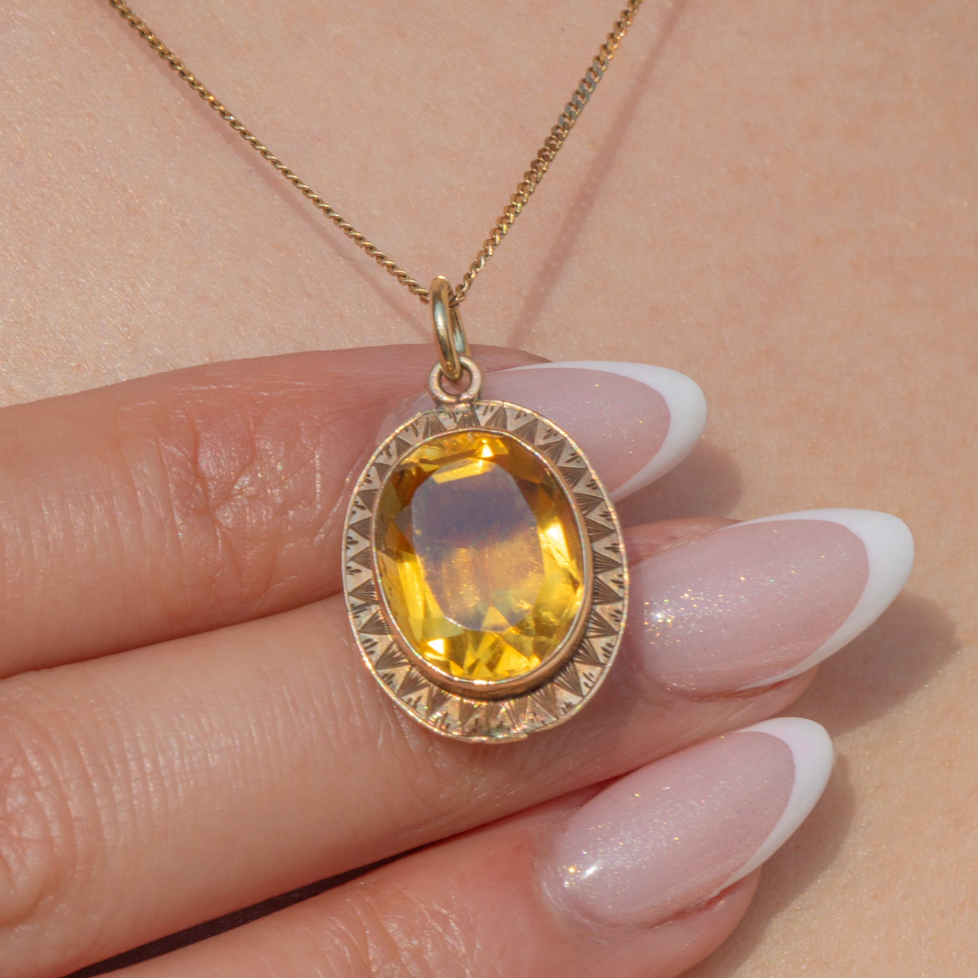 Expertly cut, the 6.00ct Citrine sparkles beautifully whenever it catches the light. The setting boasts elegant, geometric detailing that reflects the bold design aesthetic of the Art Deco period. With her rich, honey-hue, this Art Deco pendant will instantly elevate your outfit!