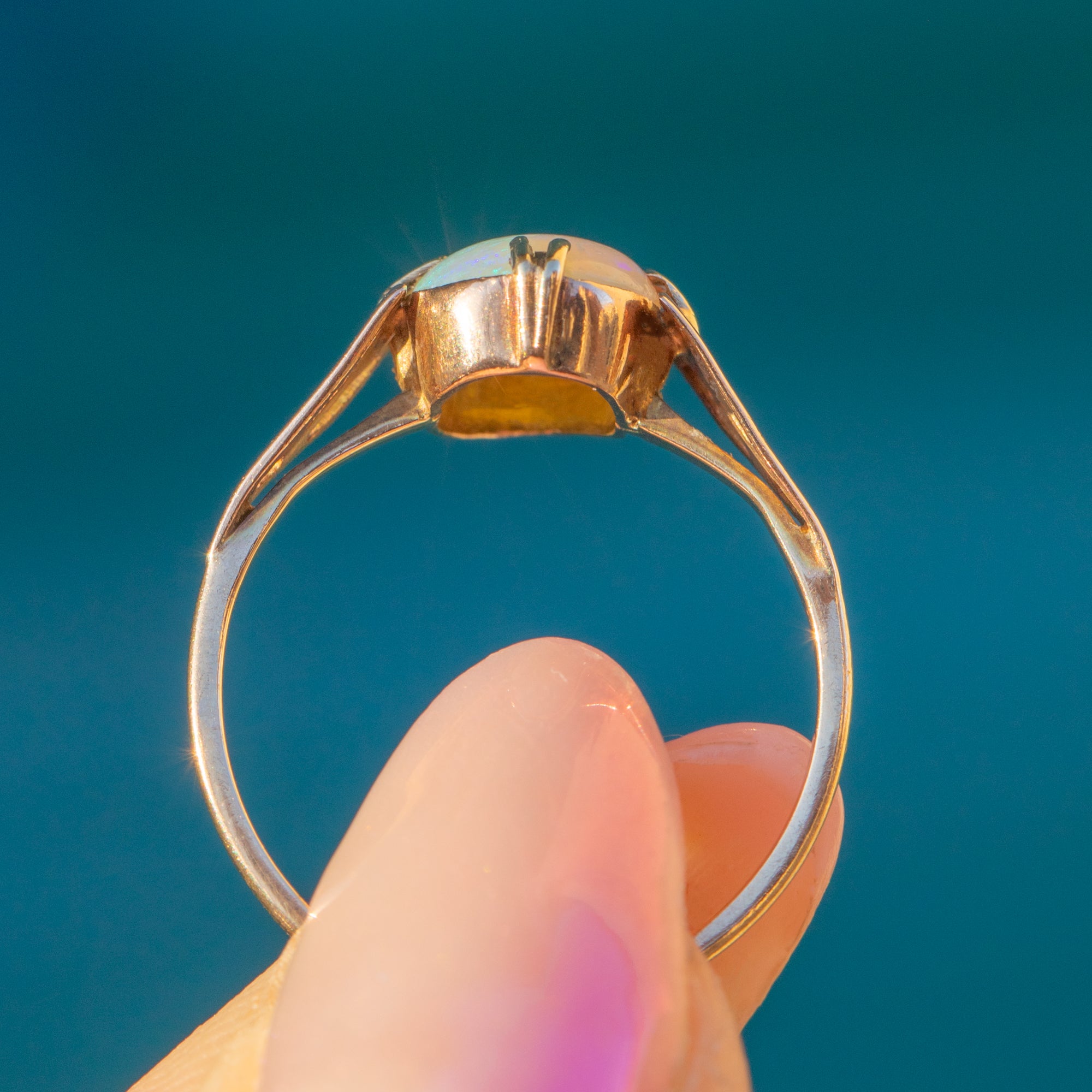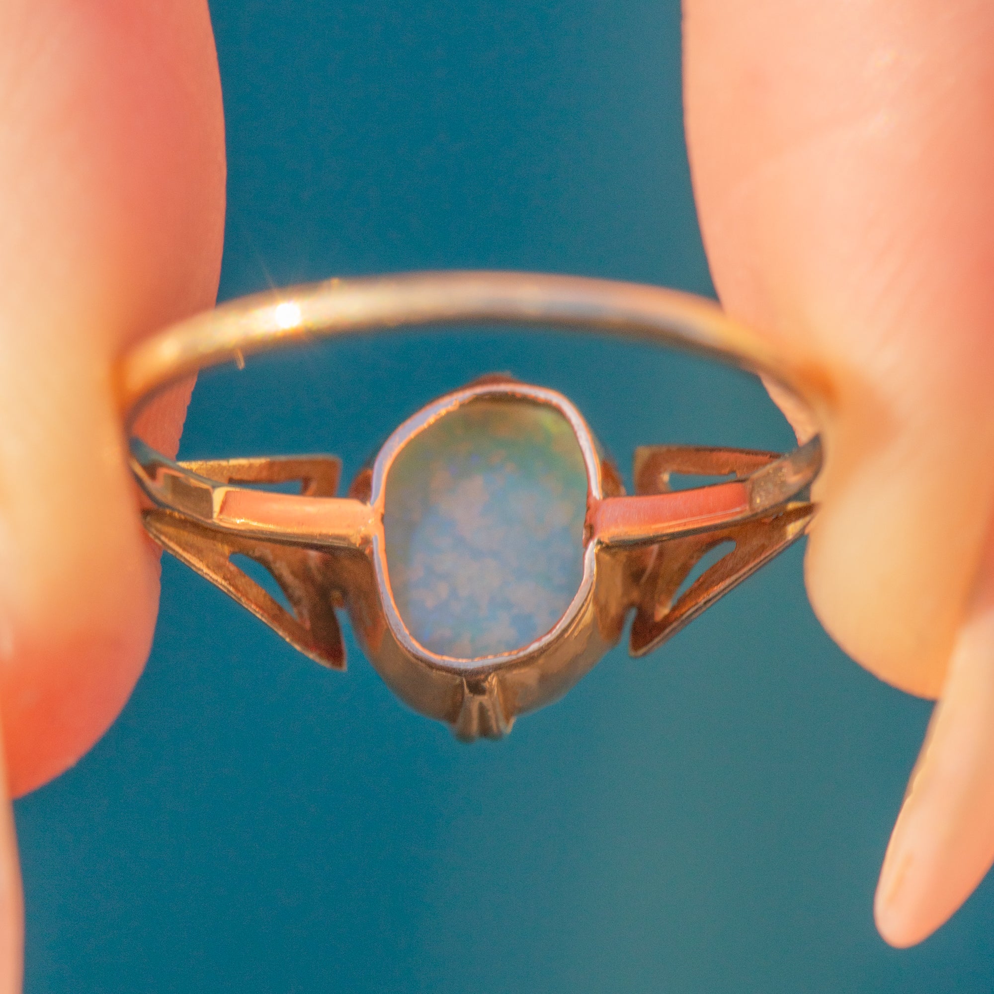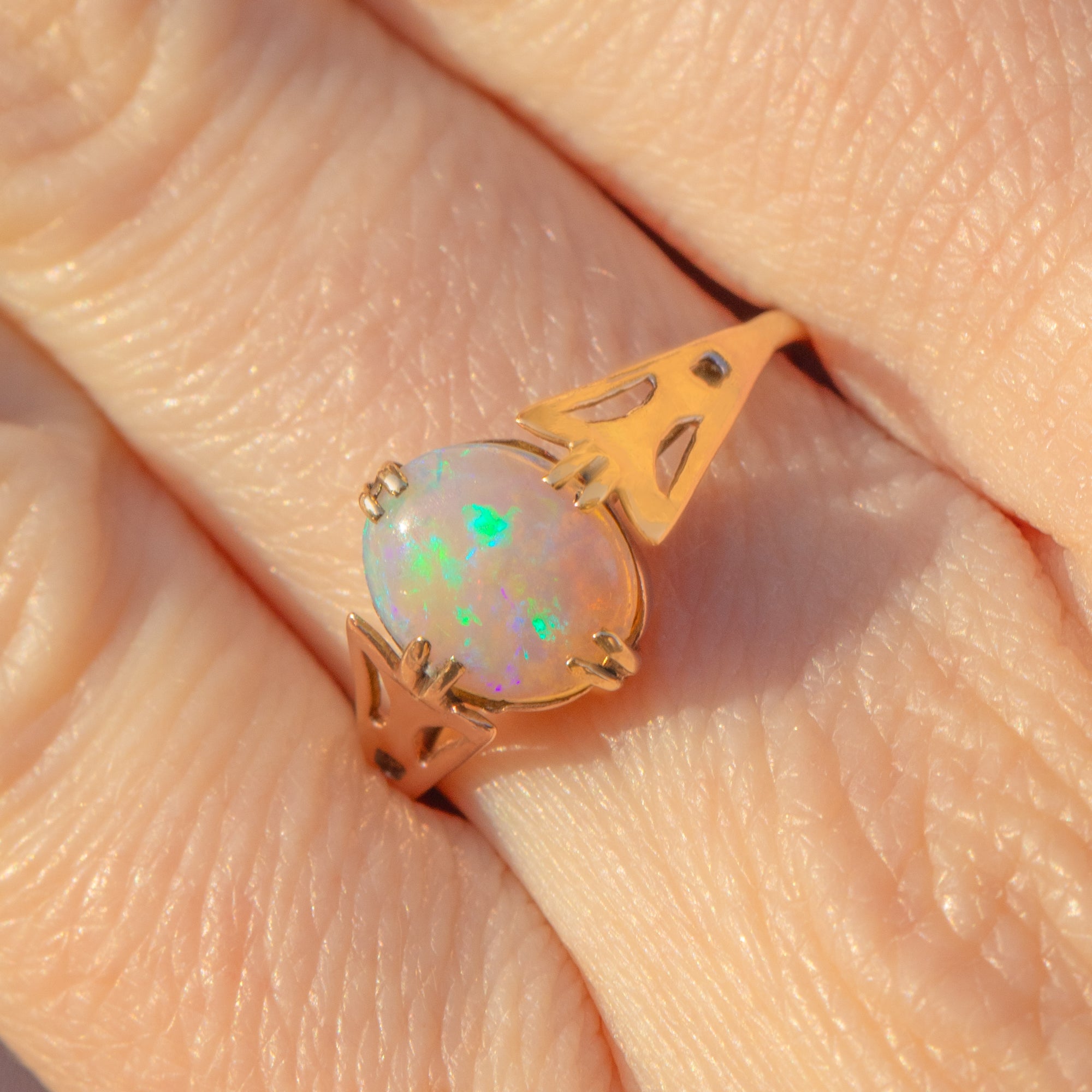 Crafted from warm 9ct Gold, this ring features a stunning natural 0.40ct crystal Opal in her centre that radiates a kaleidoscope of soft blues and vibrant greens - with the occasional flashes of pink and orange too.