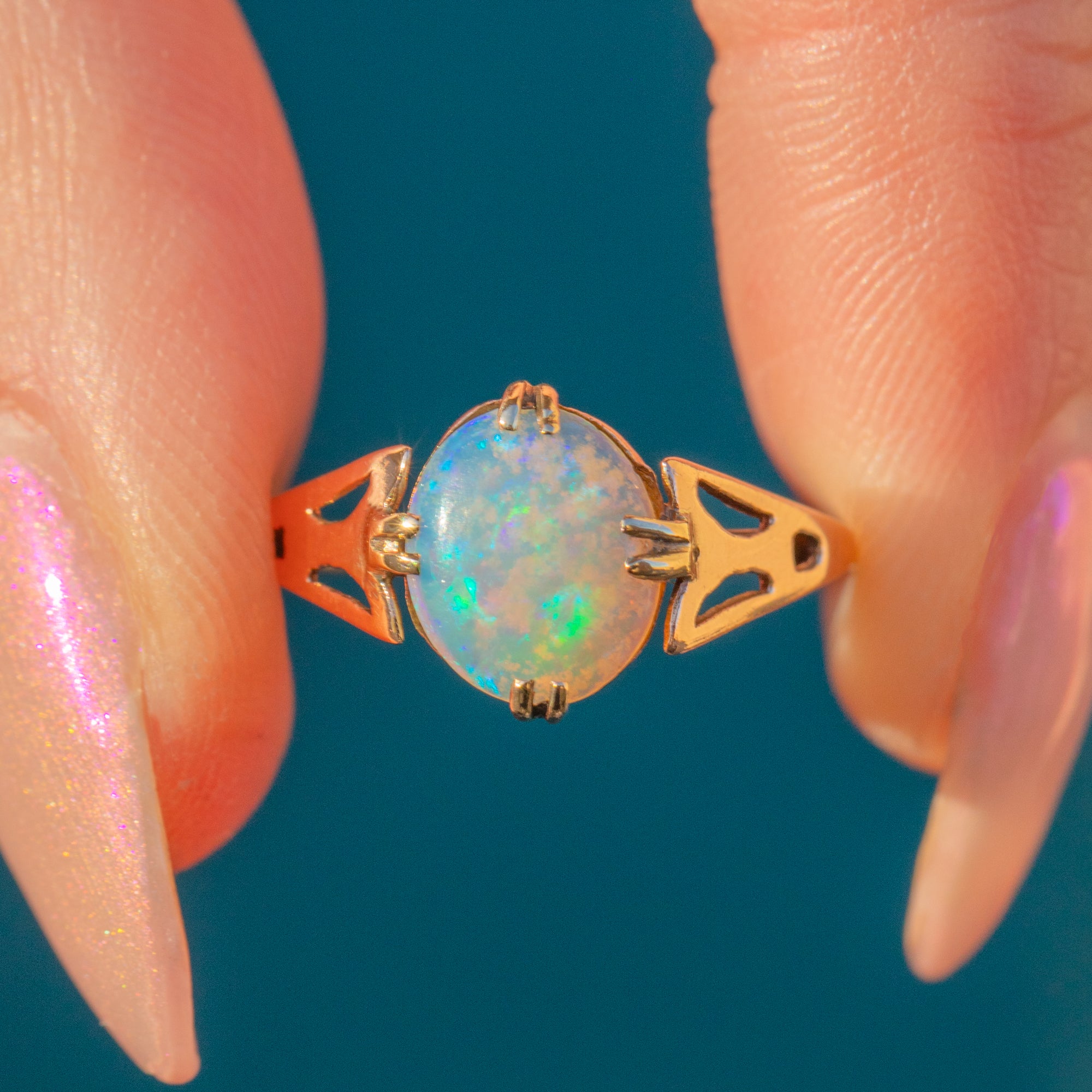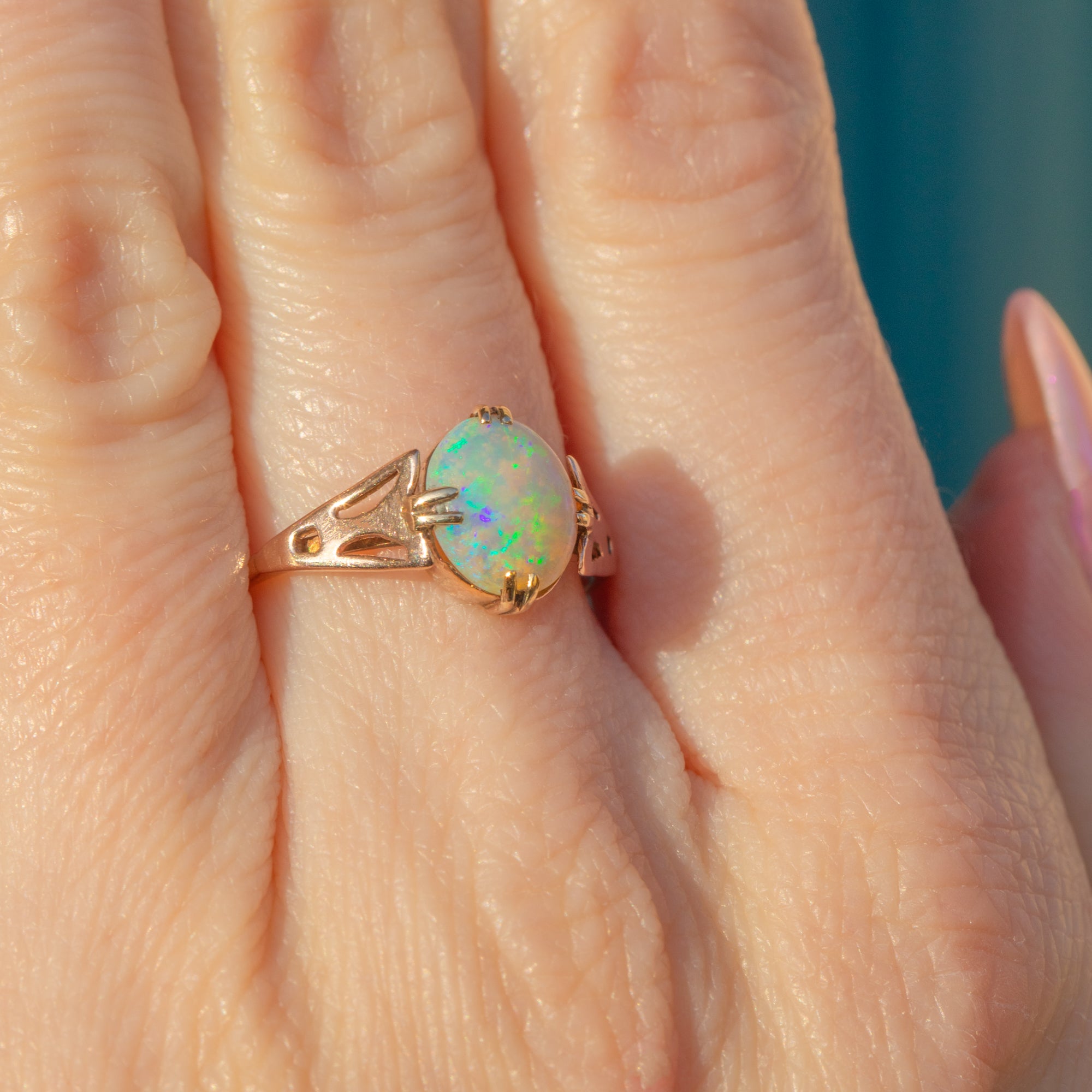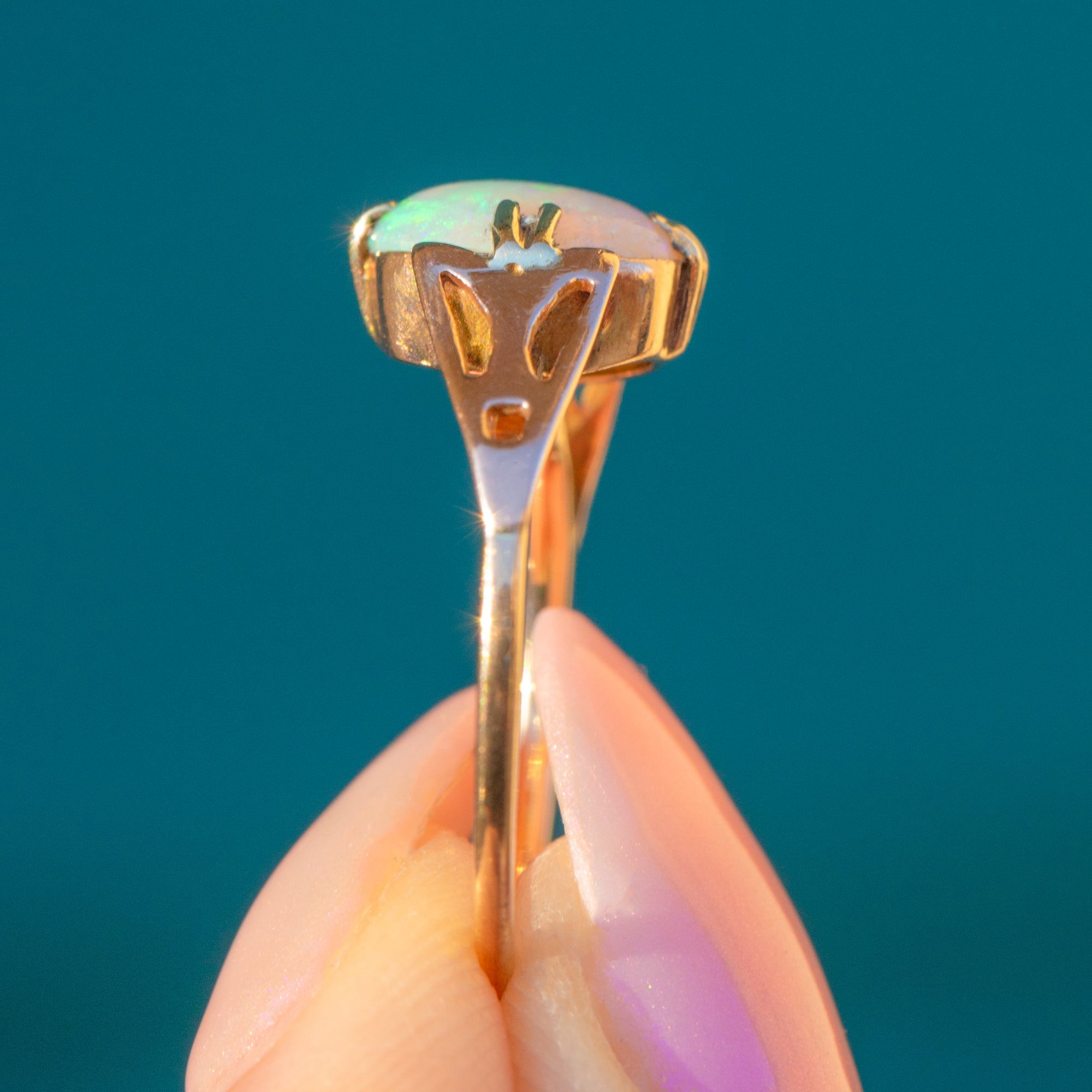 Crafted from warm 9ct Gold, this ring features a stunning natural 0.40ct crystal Opal in her centre that radiates a kaleidoscope of soft blues and vibrant greens - with the occasional flashes of pink and orange too.