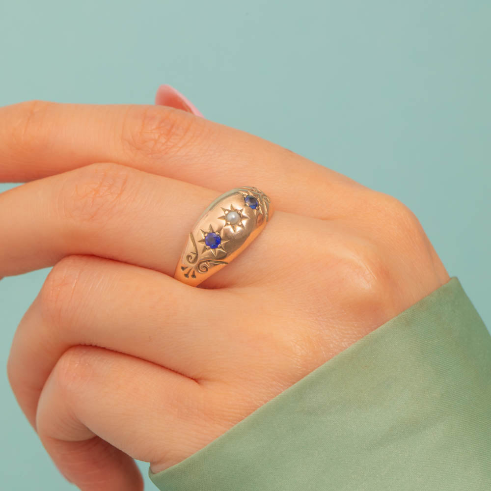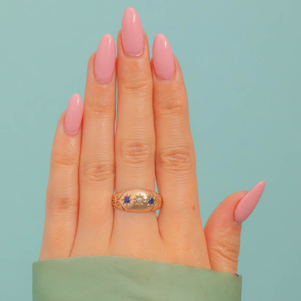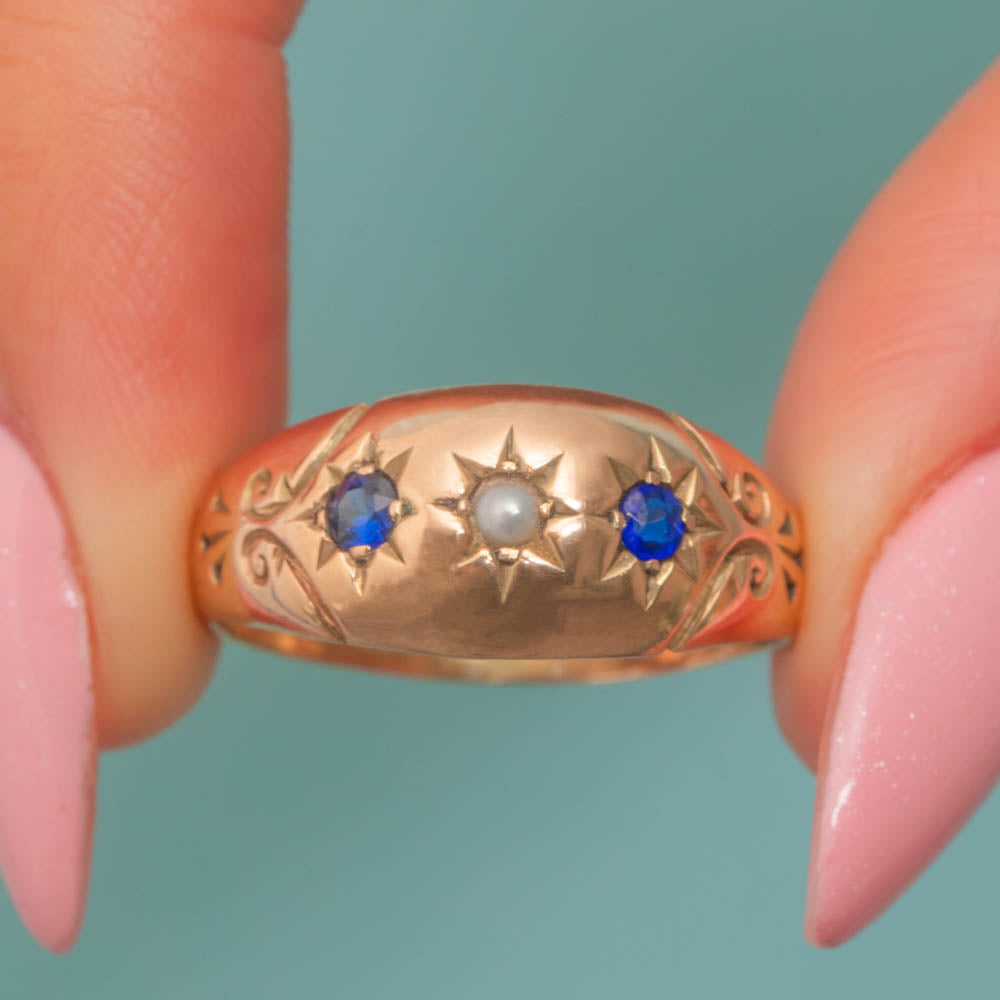 A trio of lustrous gemstones spread across her centre, with the two royal blue natural Sapphires and iridescent Pearl each displayed within star settings in quintessential gypsy ring style.