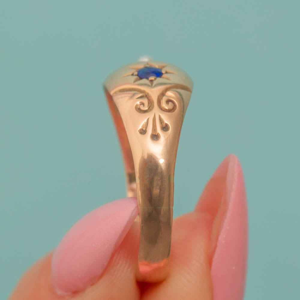 This Art Deco 9ct Gold Sapphire and Pearl gypsy ring, dated 1922, radiates celestial charm!