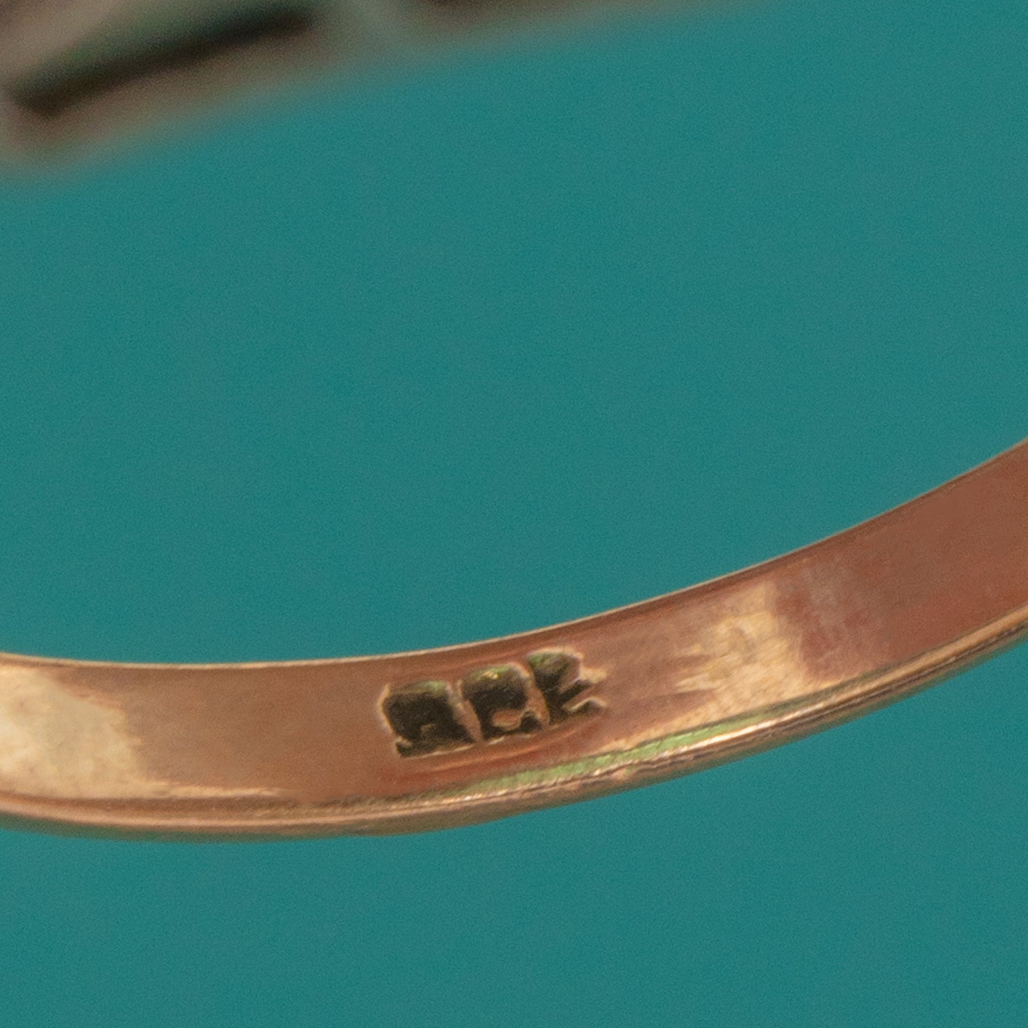 The contrast of Silver to the 9ct Gold shank amplifies the piece’s bold, architectural feel, while green and white Paste accents at the shoulders nod to classic Deco symmetry. Elegant, graphic and glowing with colour, it’s a fabulous cocktail ring that makes an effortless statement.