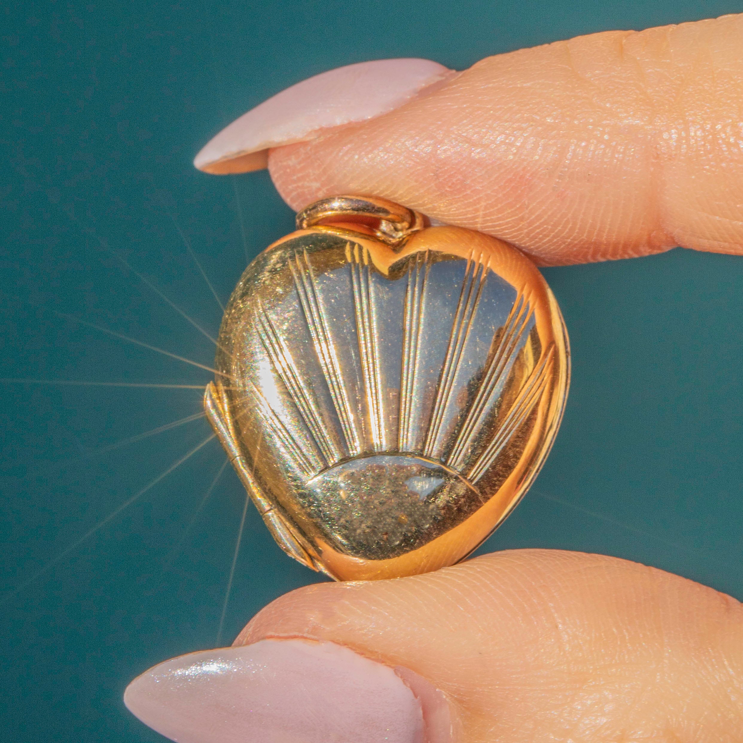 This striking Art Deco 9ct Gold Sunburst heart locket is a stunning representation of the bold, geometric style of the Art Deco period! Crafted from a richly saturated 9ct yellow Gold, the locket features a rising sun design radiating from her centre with beaming rays engraved into her glossy surface.