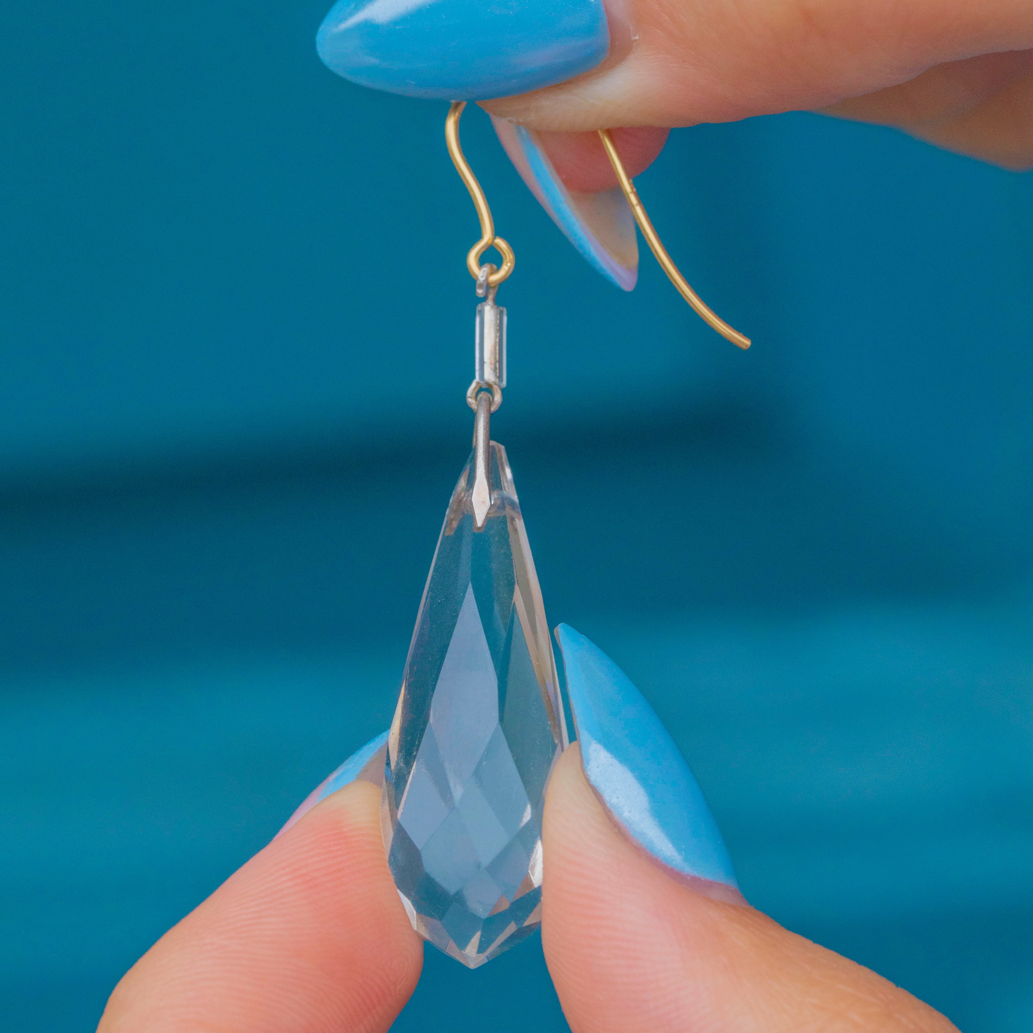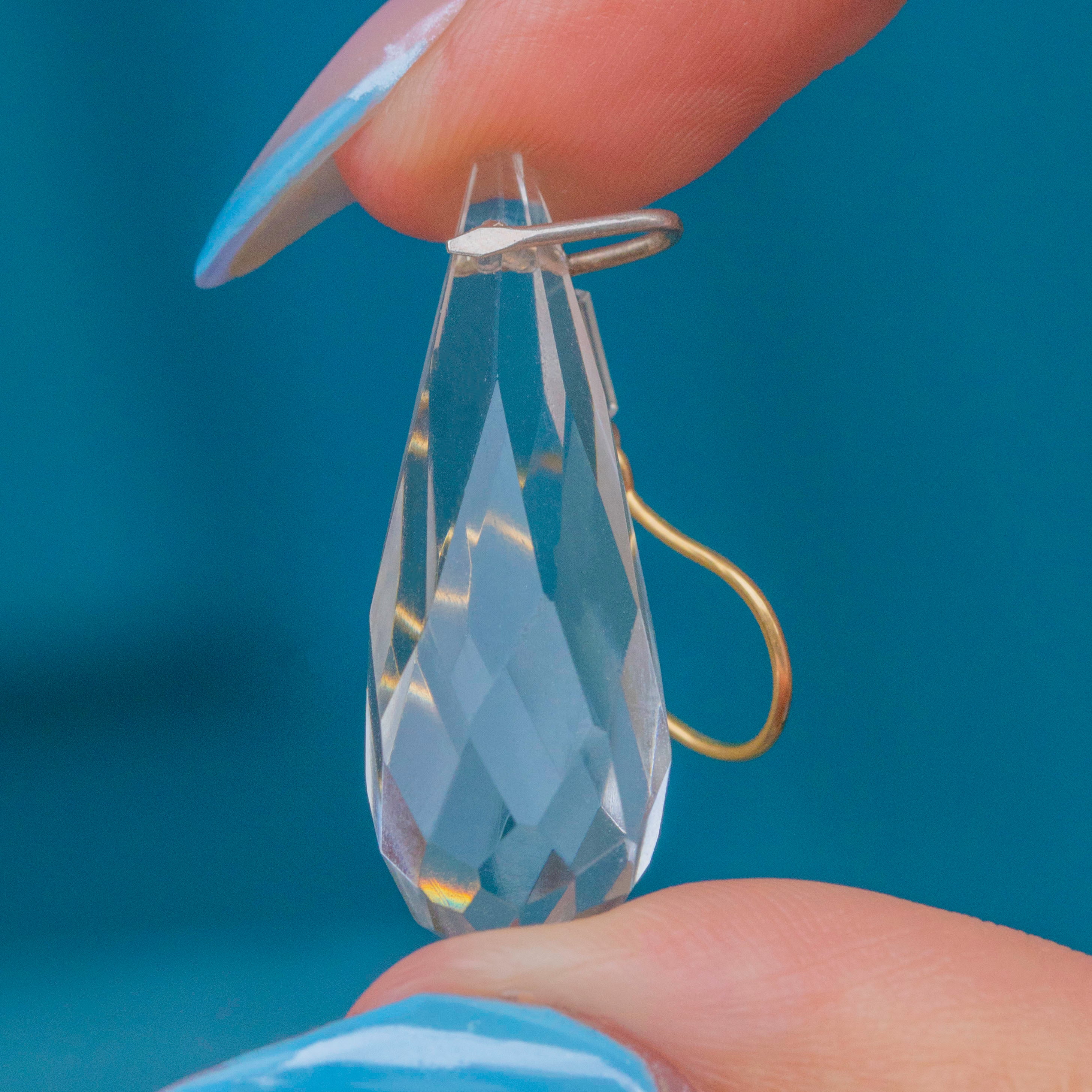 These antique drop earrings each feature a wonderfully faceted transparent Briolette-cut Paste stone which radiates soft rainbow hues as it catches the light.