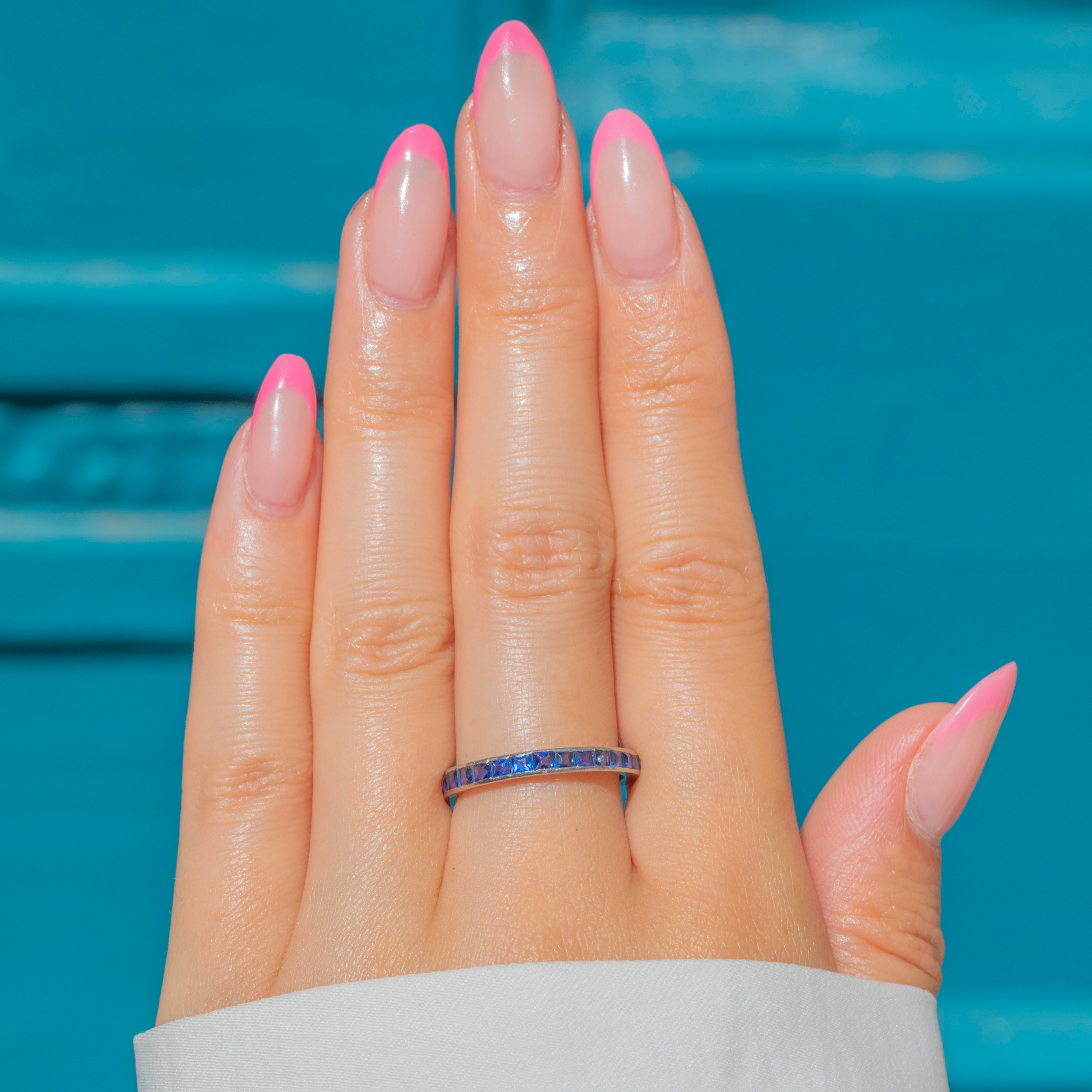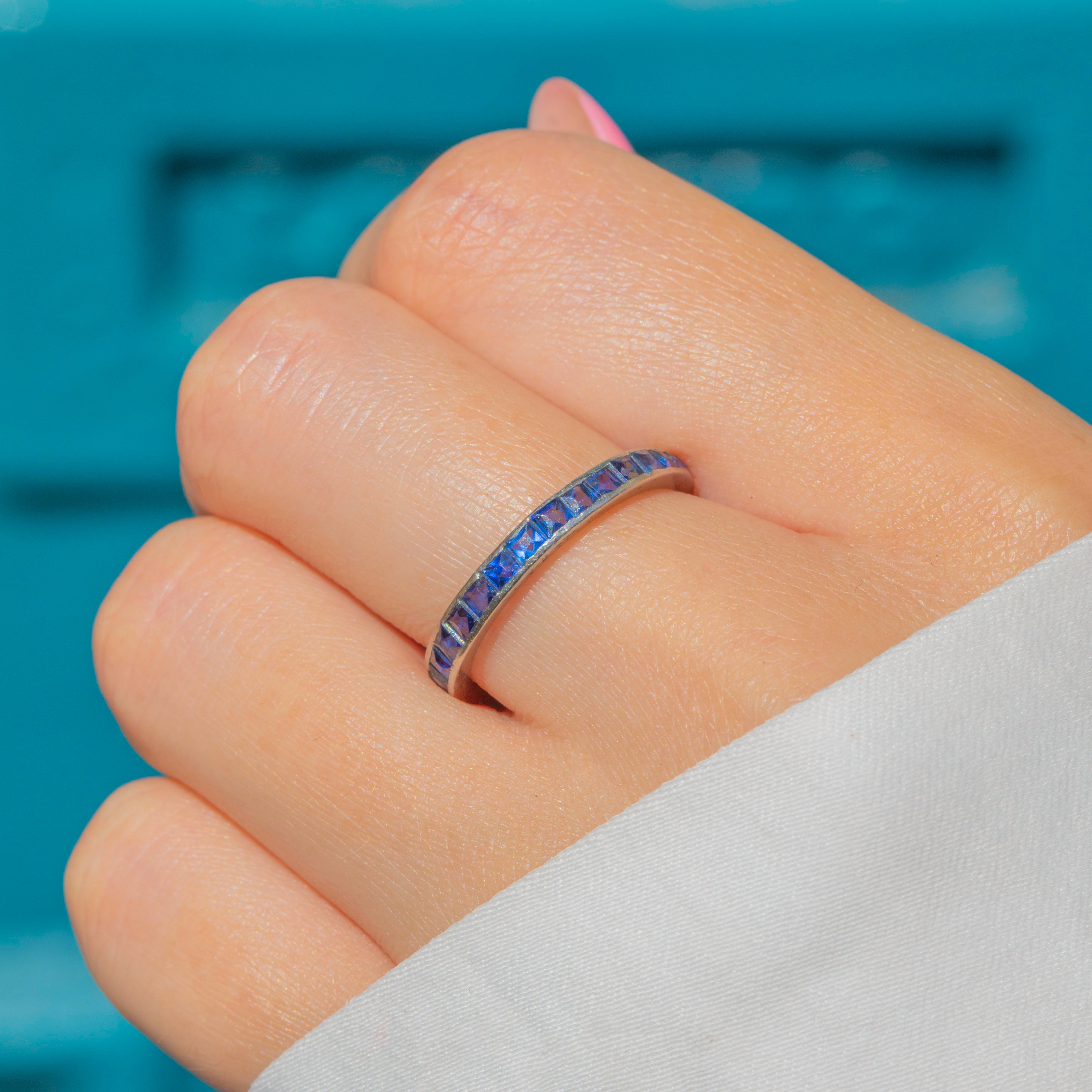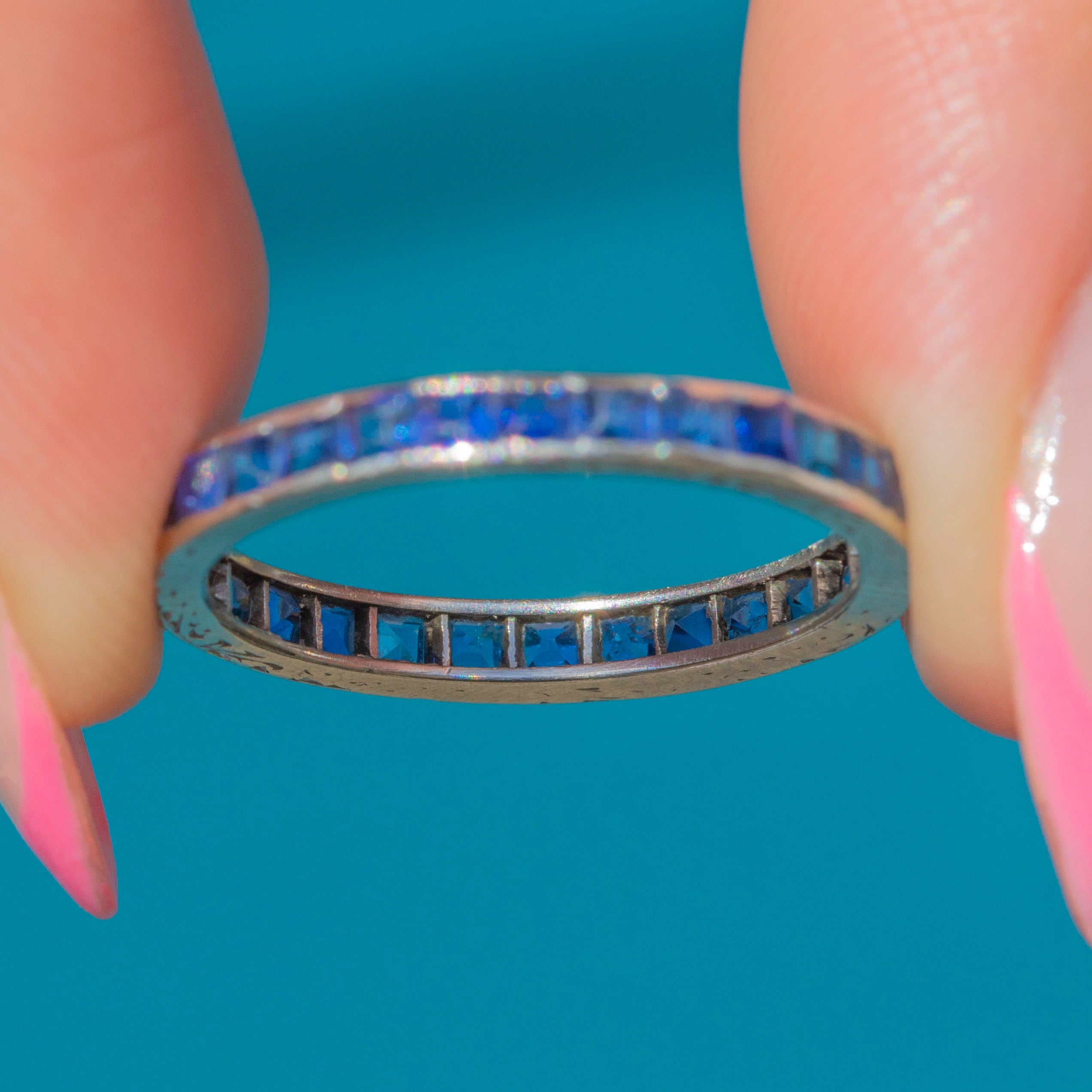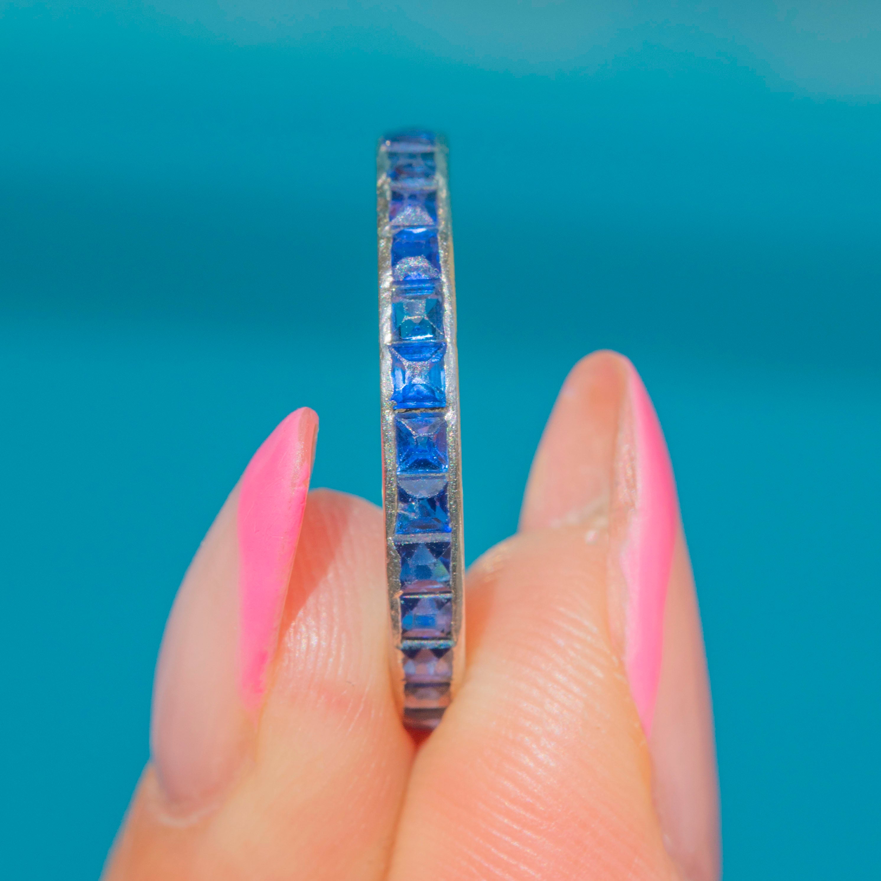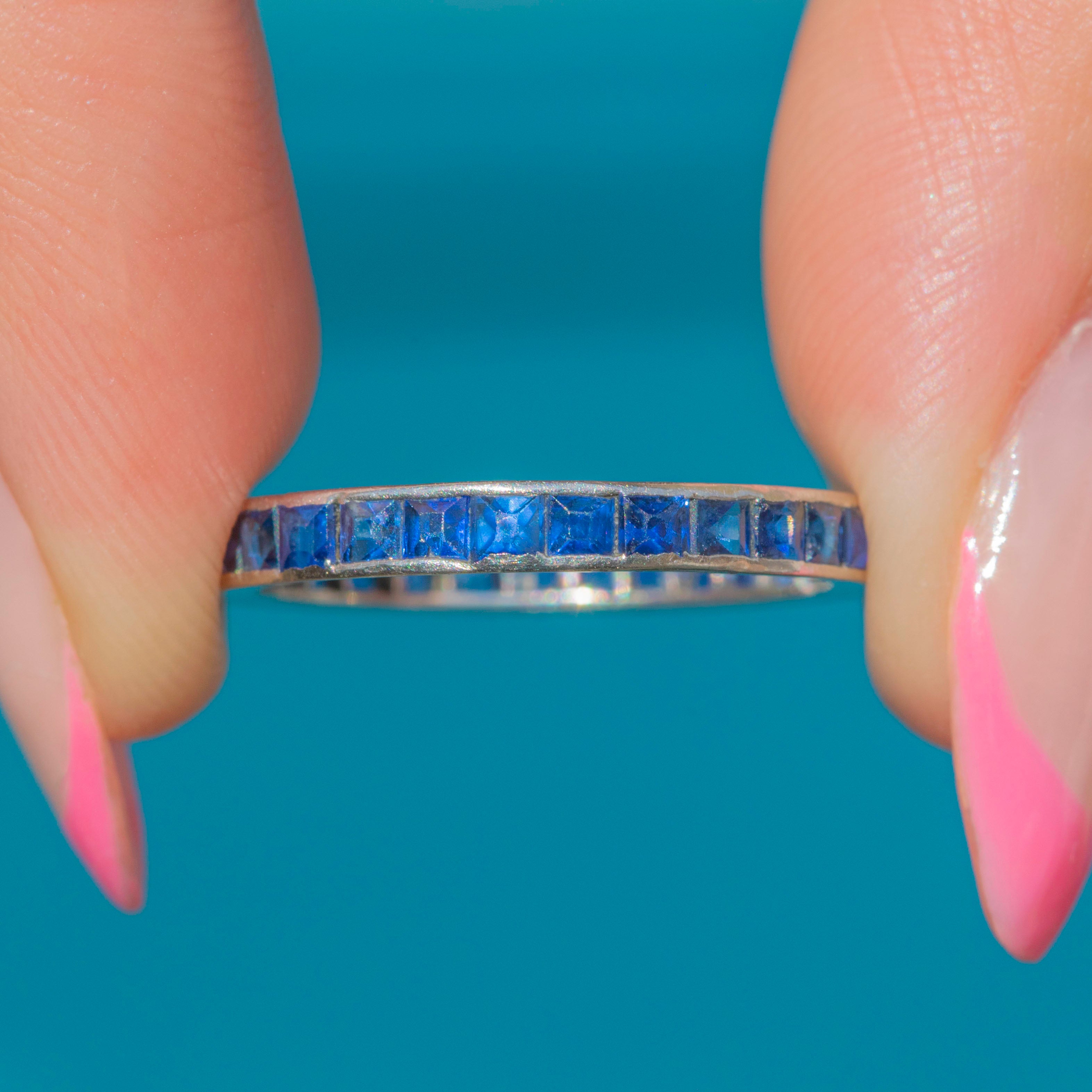 VERY GOOD: The Sapphires are securely set and sparkle beautifully from all angles. The Platinum band, while there were originally some engravings that have almost completely faded over time, she certainly hasn't lost any of her splendour over the course of her life! The band feels super comfortable to wear and she glides onto the finger with ease. There is very little wear to the piece overall, so you can wear her confidently for decades more. As she is an eternity ring, she is not available to resize.