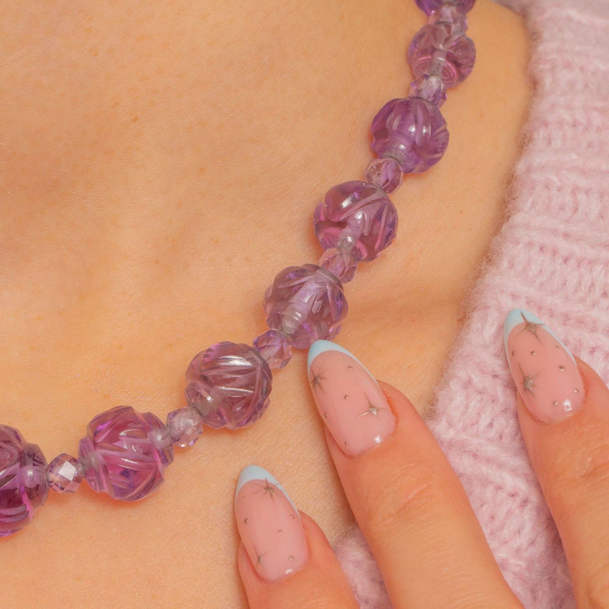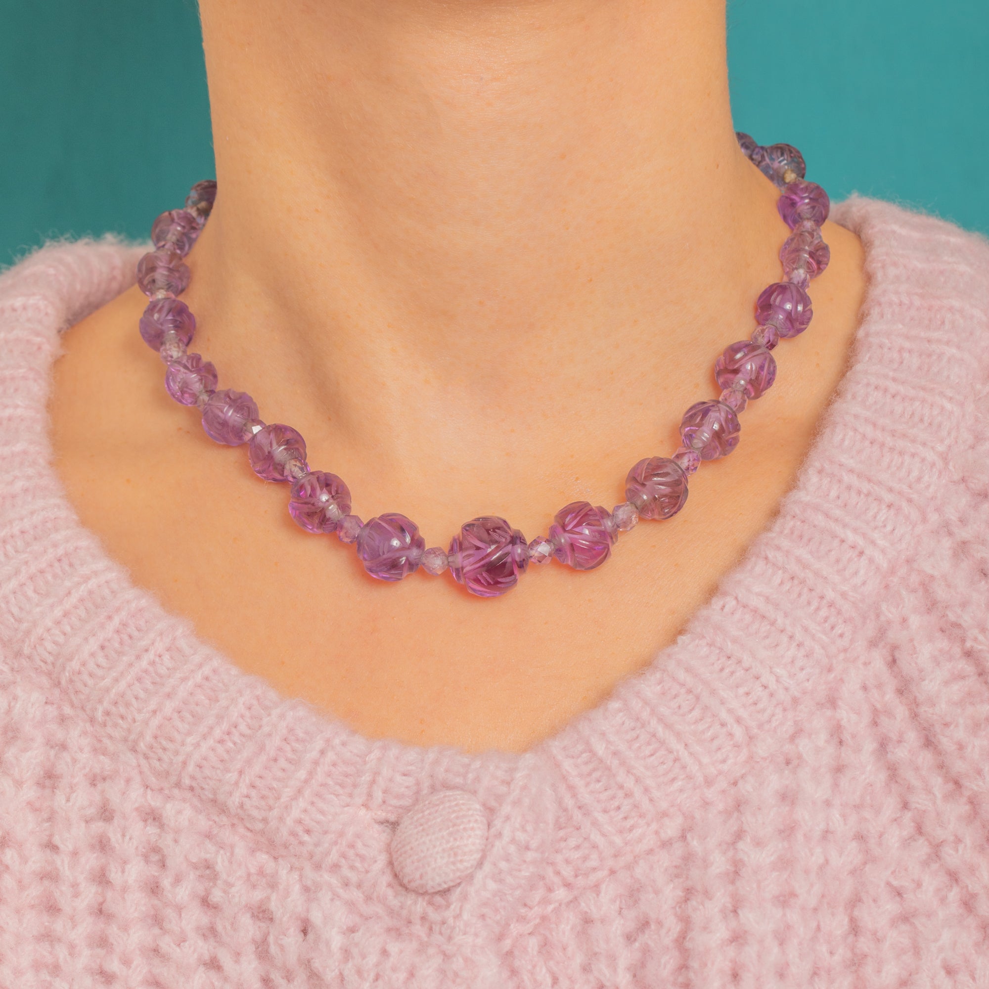 A sculptural Art Deco necklace composed of hand-carved Amethyst “melon” beads, gracefully graduated and punctuated by smaller faceted Amethyst spacers. The fluted carving reveals beautiful translucency and natural internal inclusions, and the alternating faceted beads lend a subtle sparkle that dances between each carved sphere.