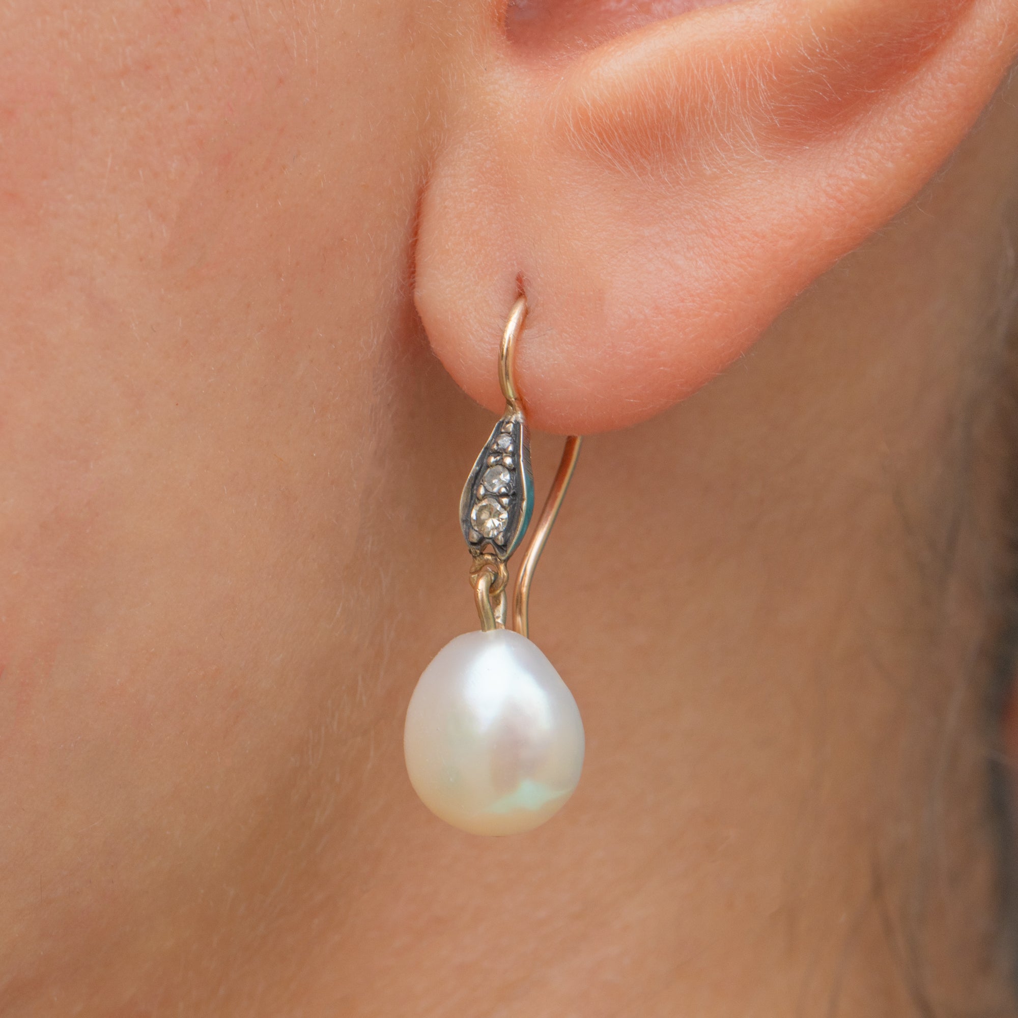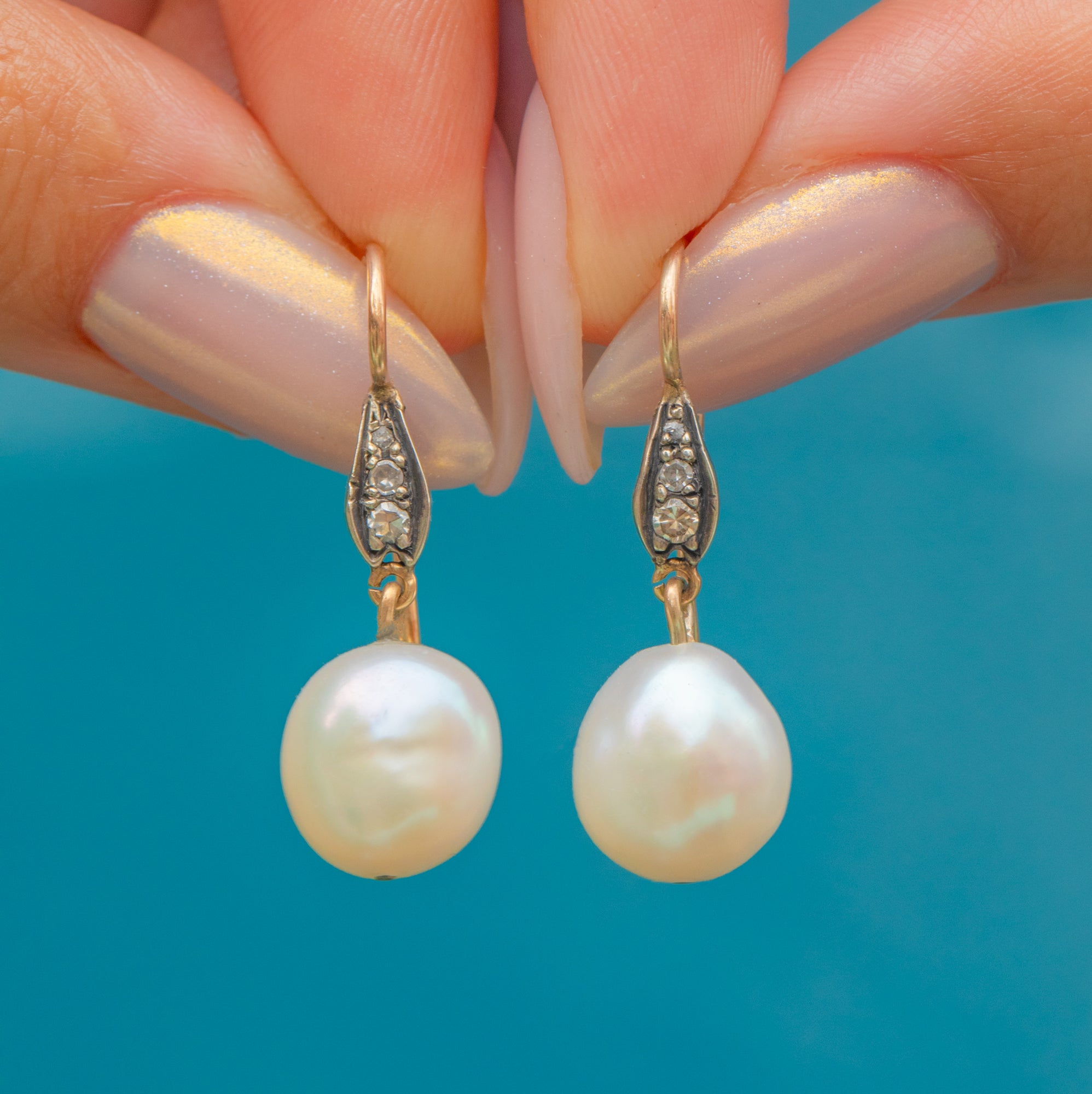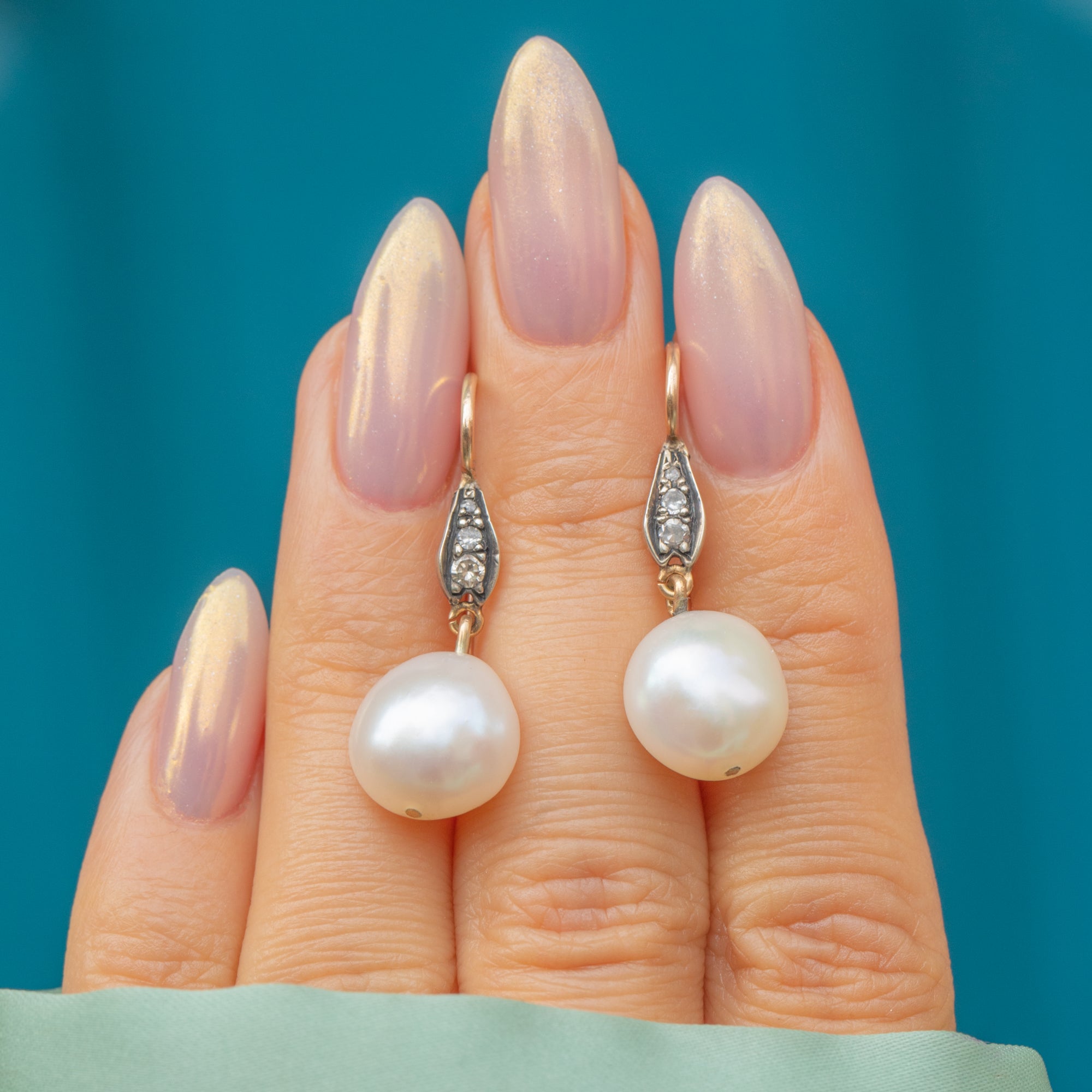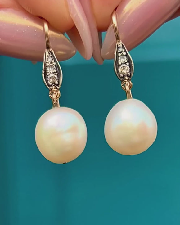 EXCELLENT: The Pearls are smooth and lustrous with no visible chips or damage, and the Diamonds remain bright and securely set. The Gold settings and hooks are in excellent condition with minimal wear, and the earrings retain their original Art Deco charm.