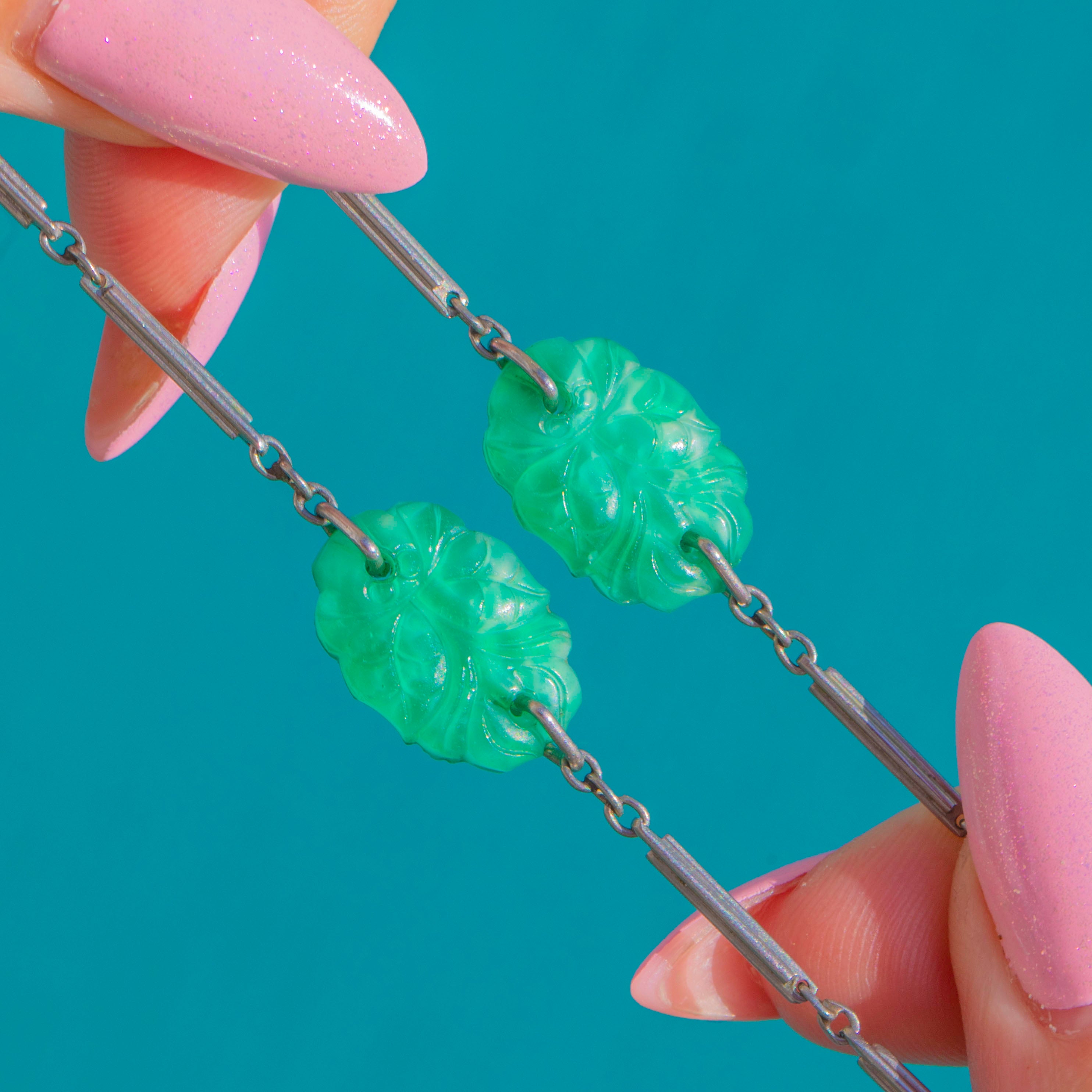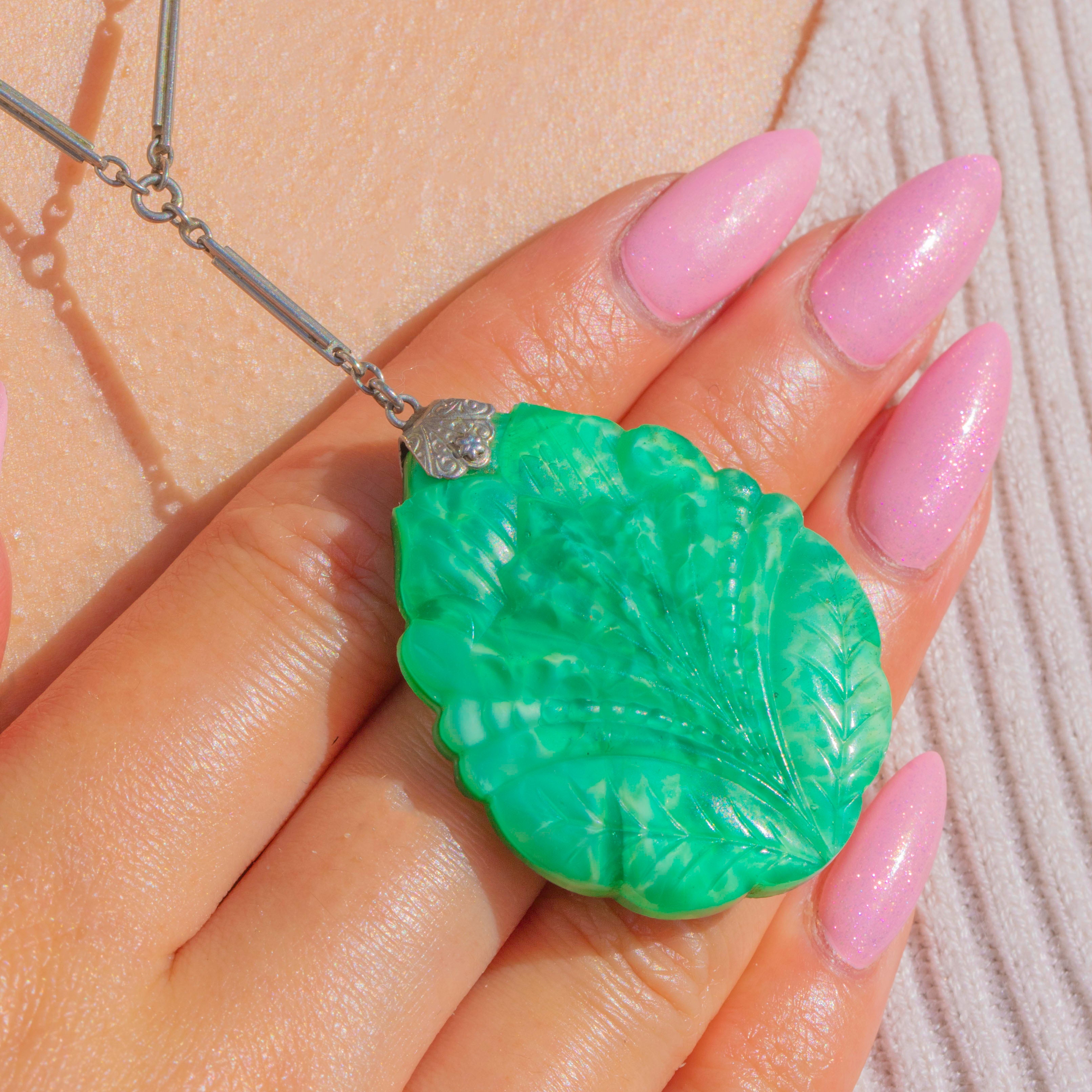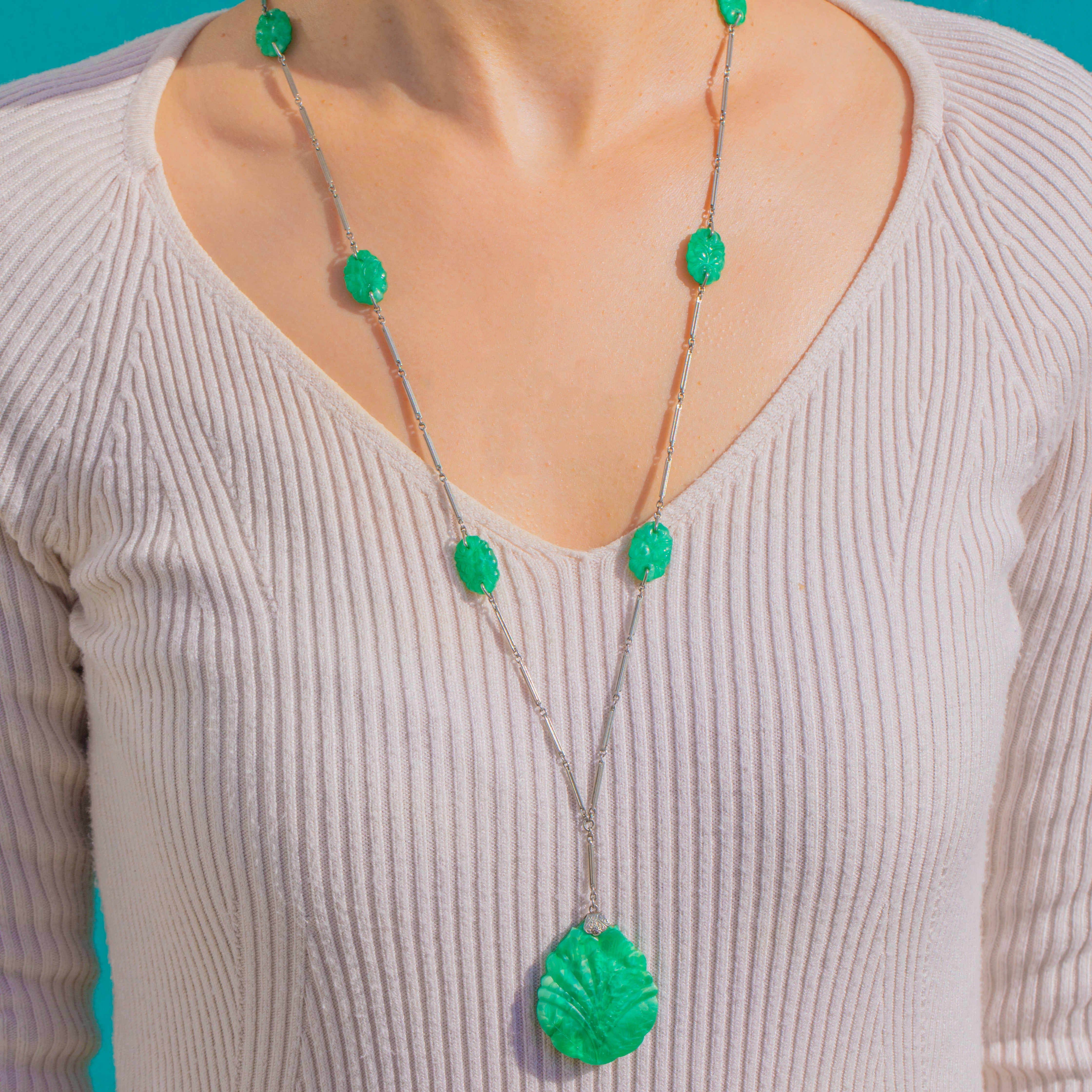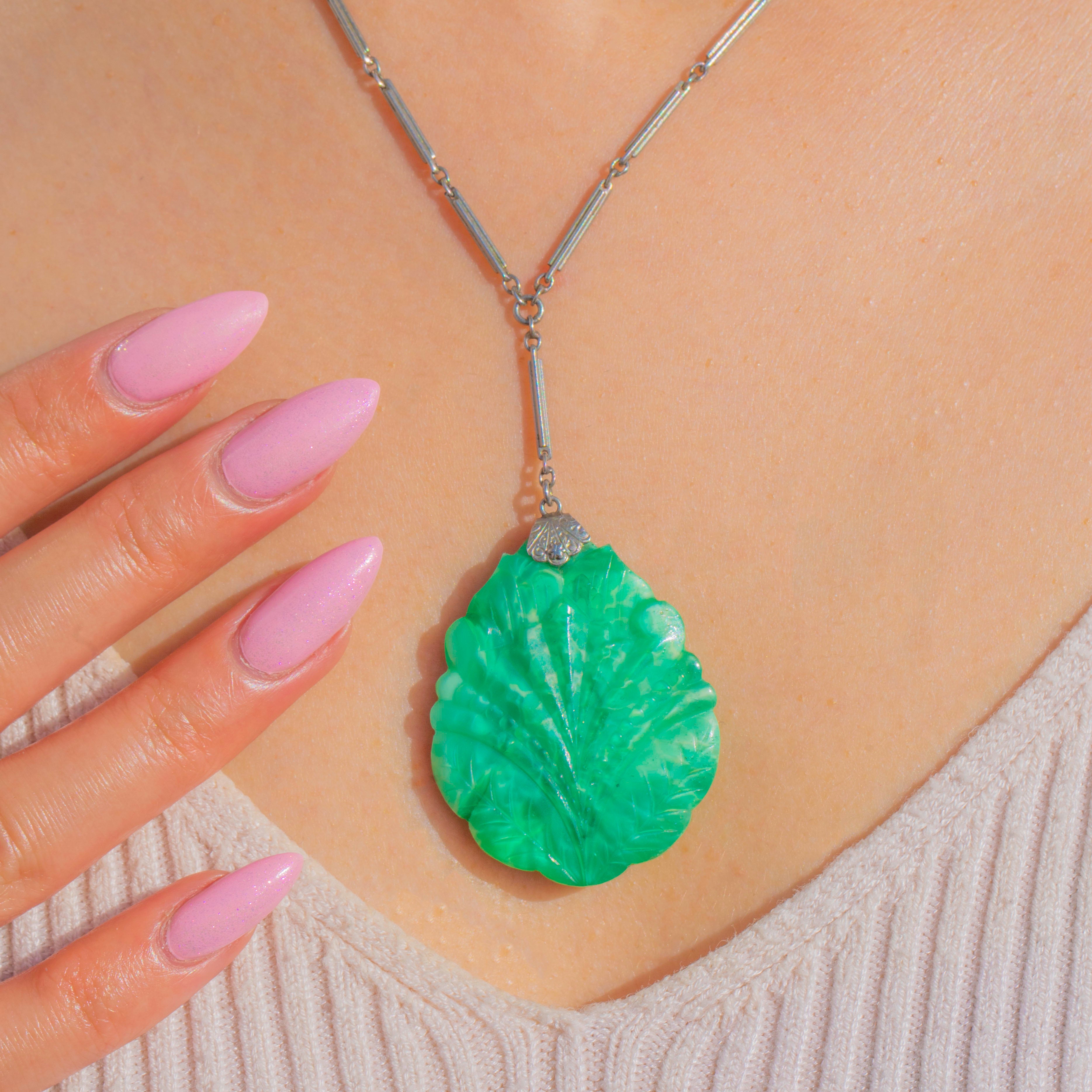 A rare Art Deco flapper necklace in vivid carved green Glass Jade, elegantly strung on a sleek Platinon bar-link chain. The bright, sculptural drops dance along the neckline and gather into a graceful foliate pendant, creating a fluid, elongated Y-line that epitomises Jazz Age glamour.