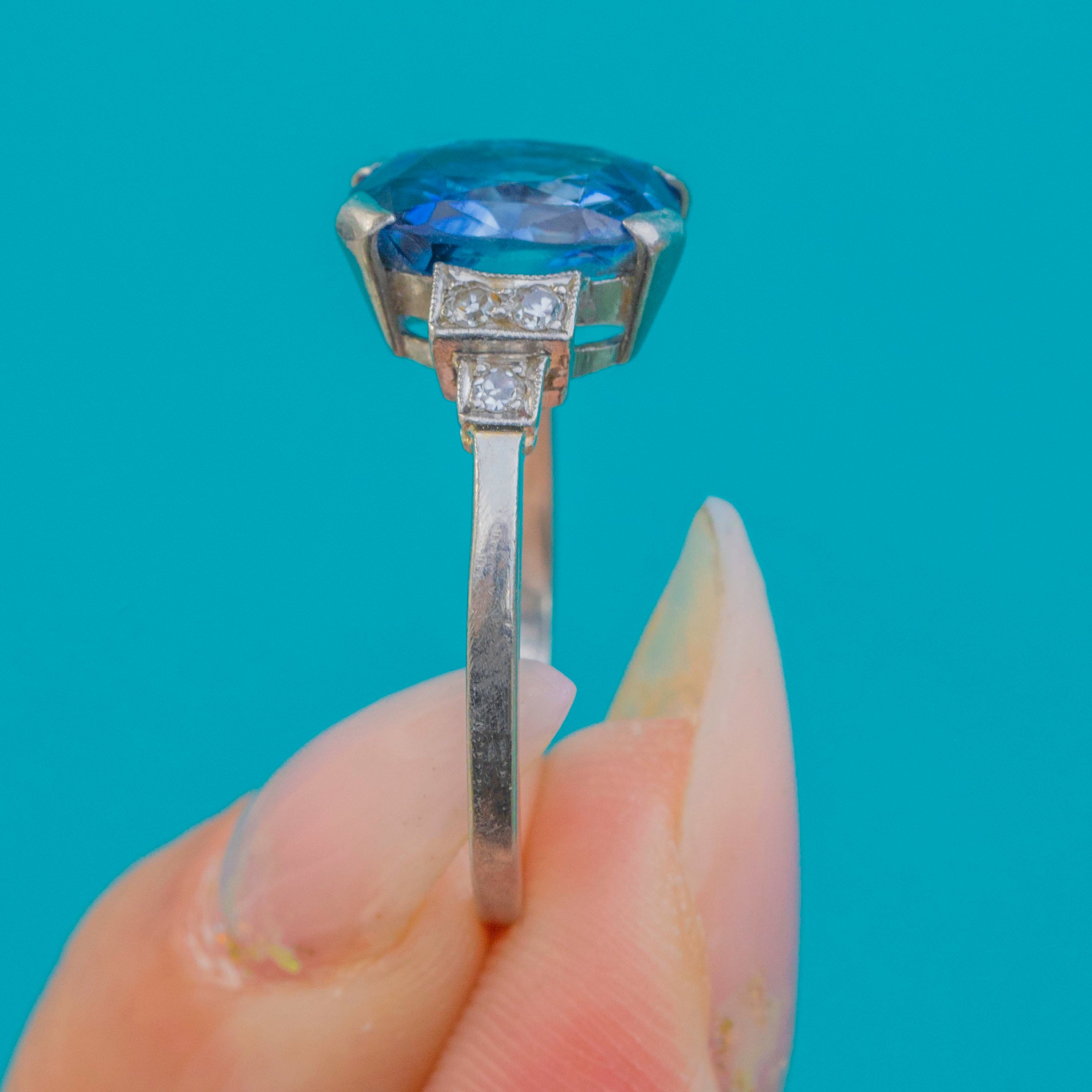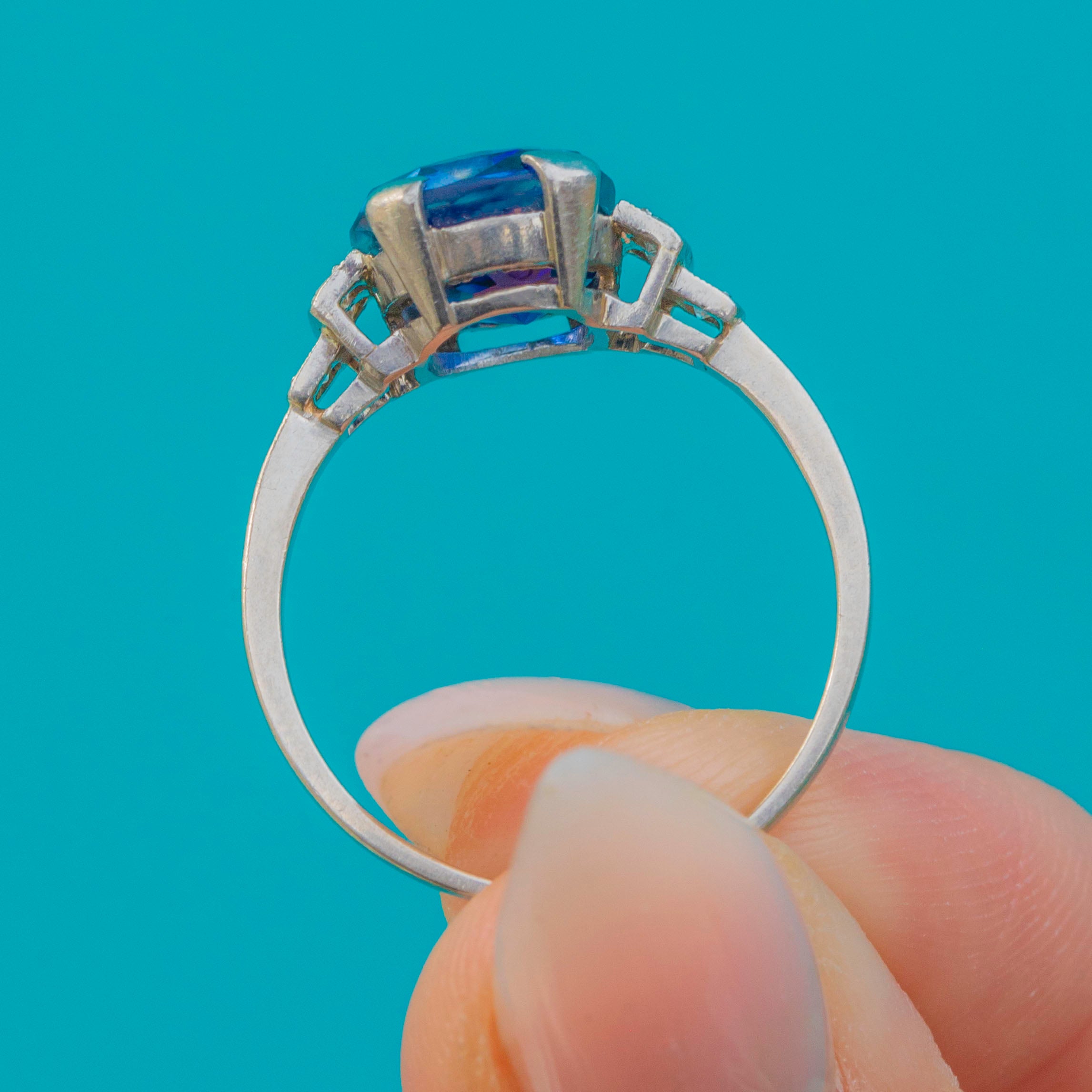 A striking Art Deco ring set in luxurious Platinum, starring a vivid blue natural Sapphire with beautiful, prominent colour zoning—so characteristic of fine natural stones. Framed by sparkling Diamond accents and elegant geometric shoulders, it’s a classic 1920s silhouette with wonderful presence on the hand.
