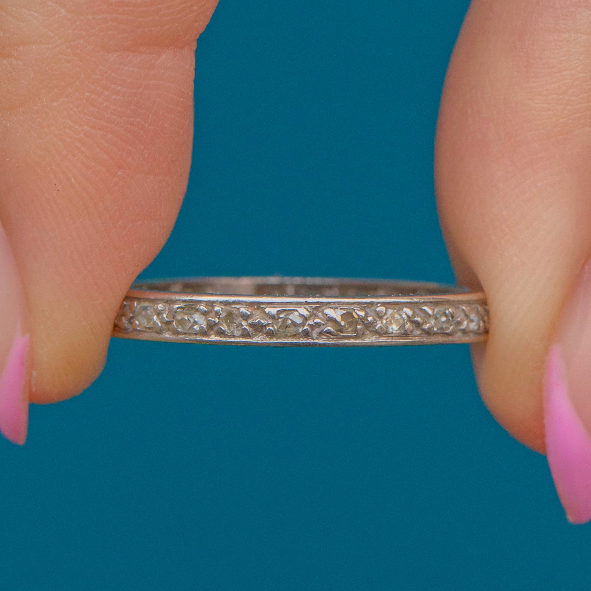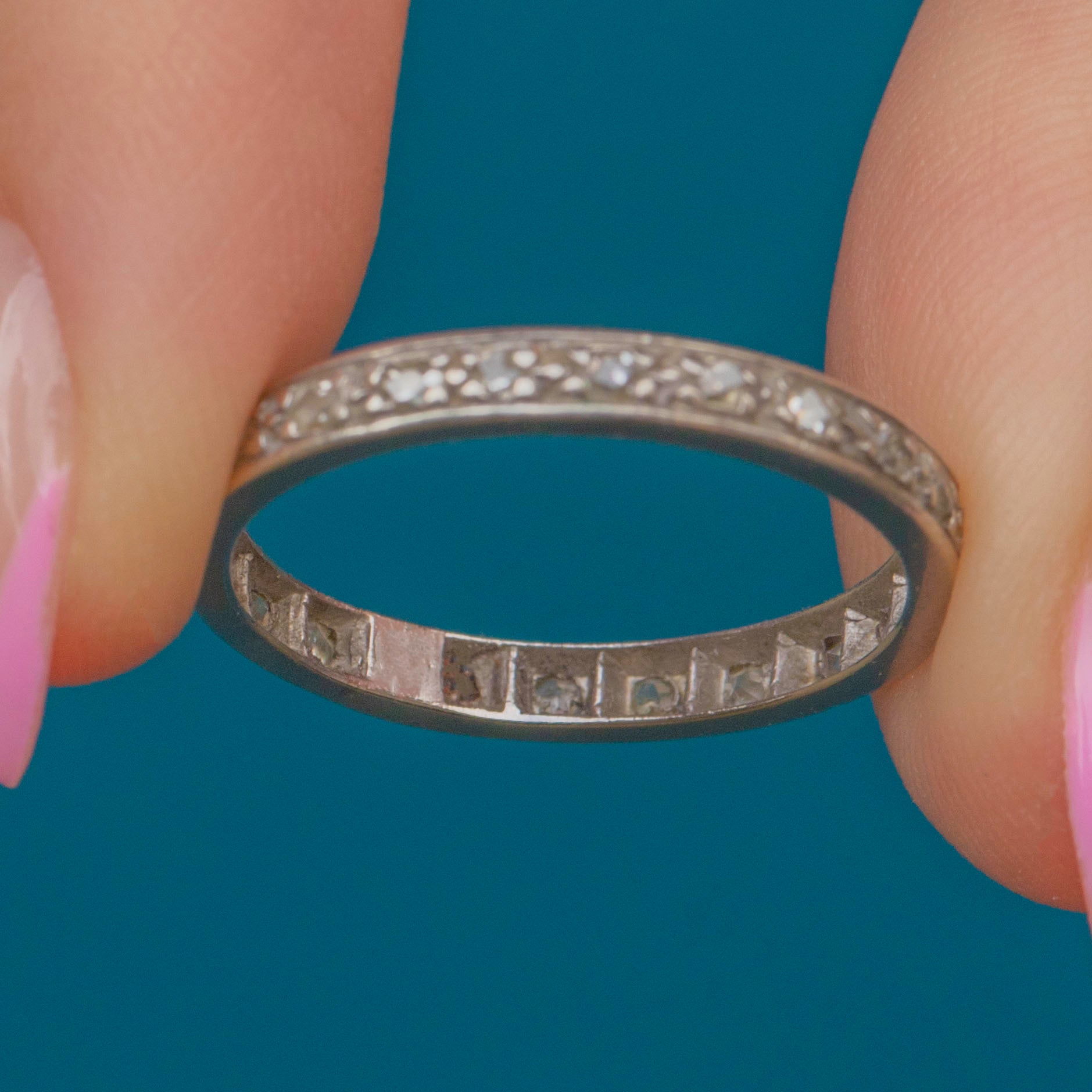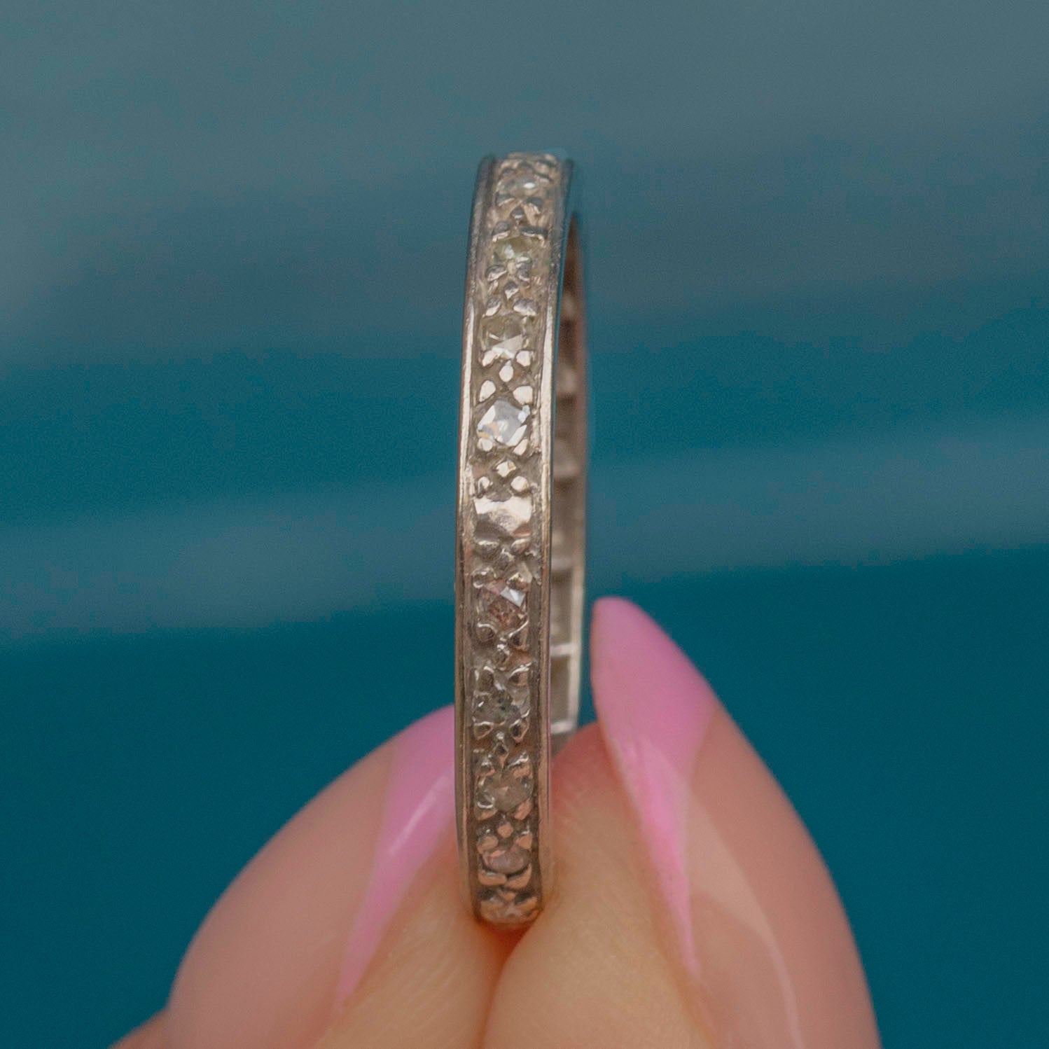This is a stunning Art Deco Platinum Diamond eternity ring! This antique ring features dainty Diamonds around its entirety, each with its own vivacious sparkle.