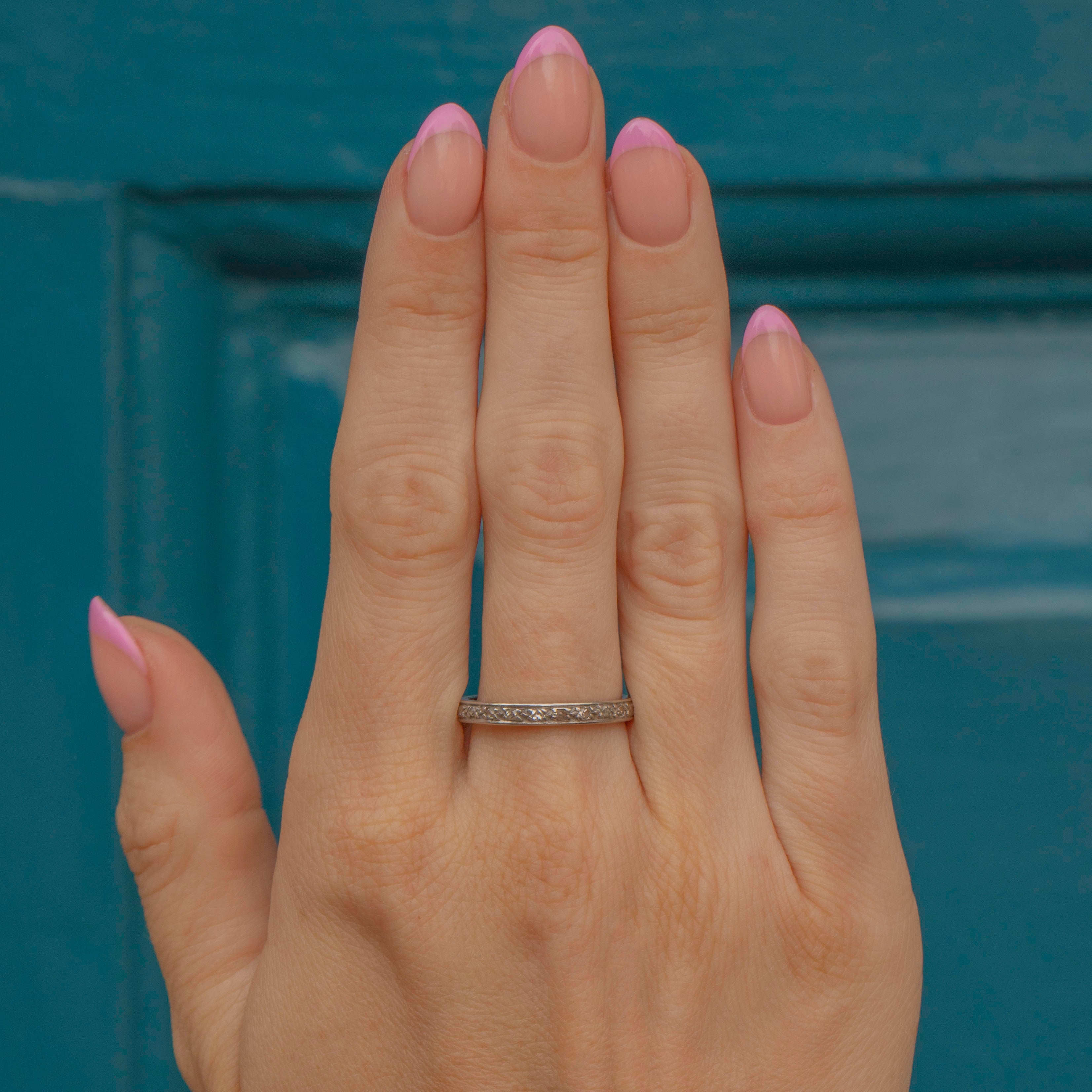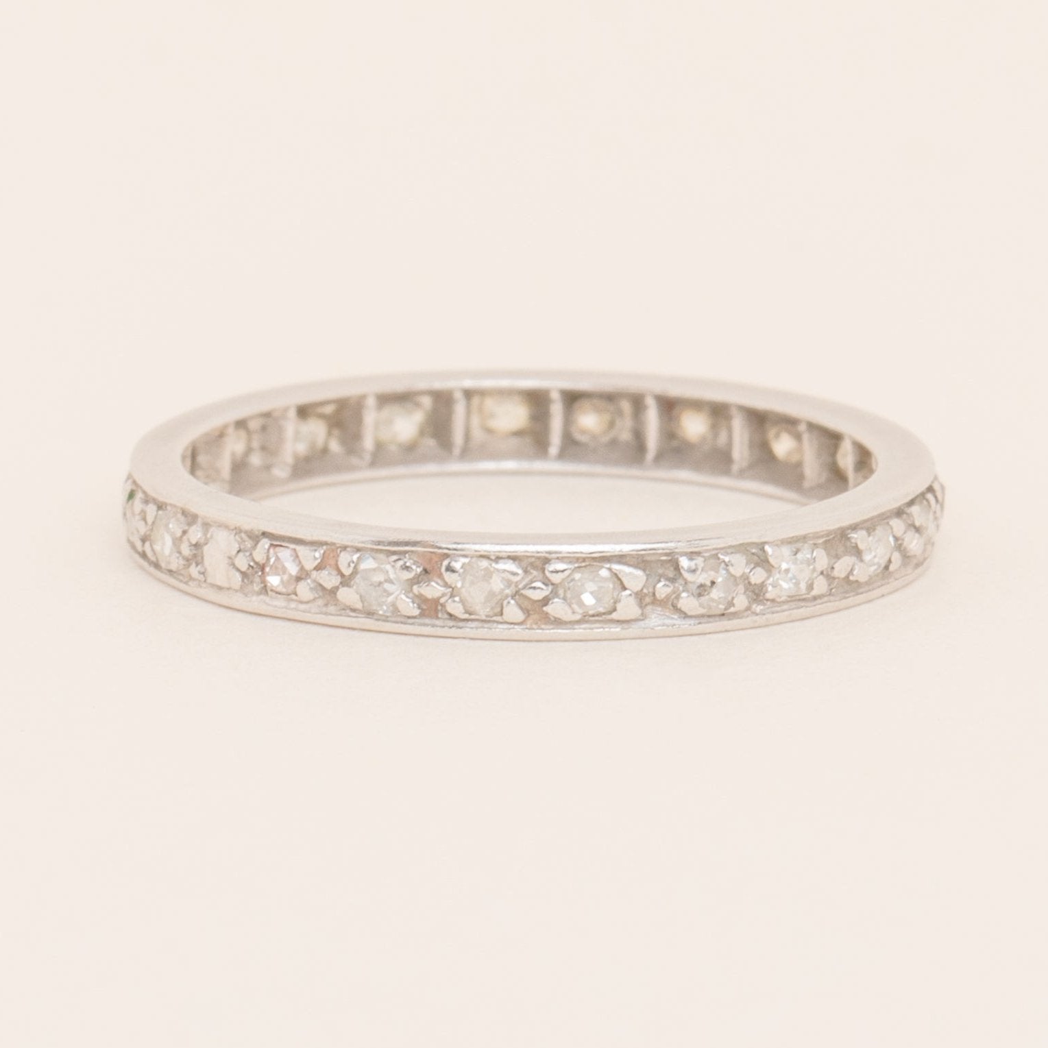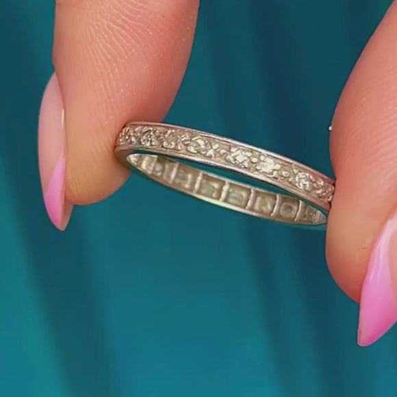 This is a stunning Art Deco Platinum Diamond eternity ring! This antique ring features dainty Diamonds around its entirety, each with its own vivacious sparkle.