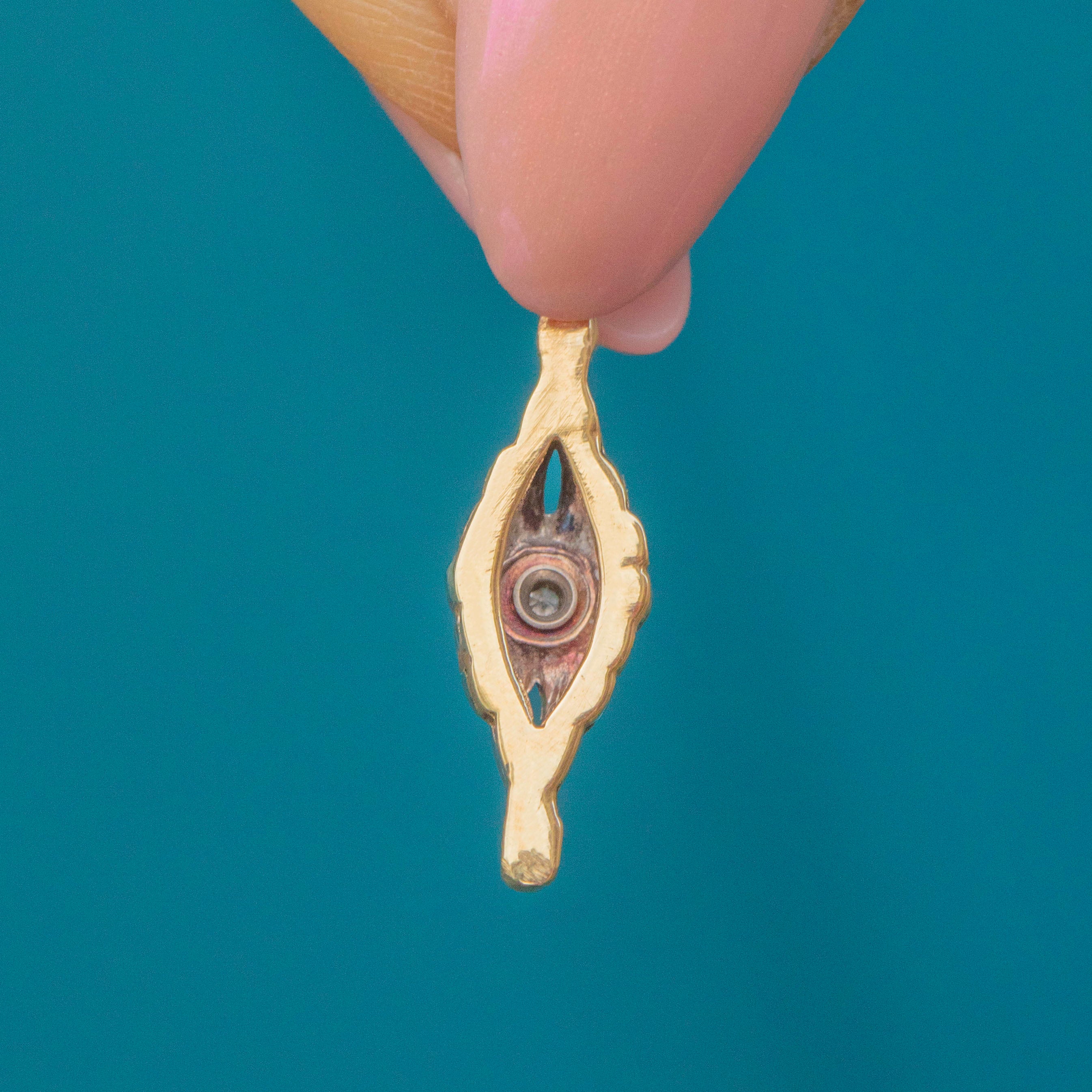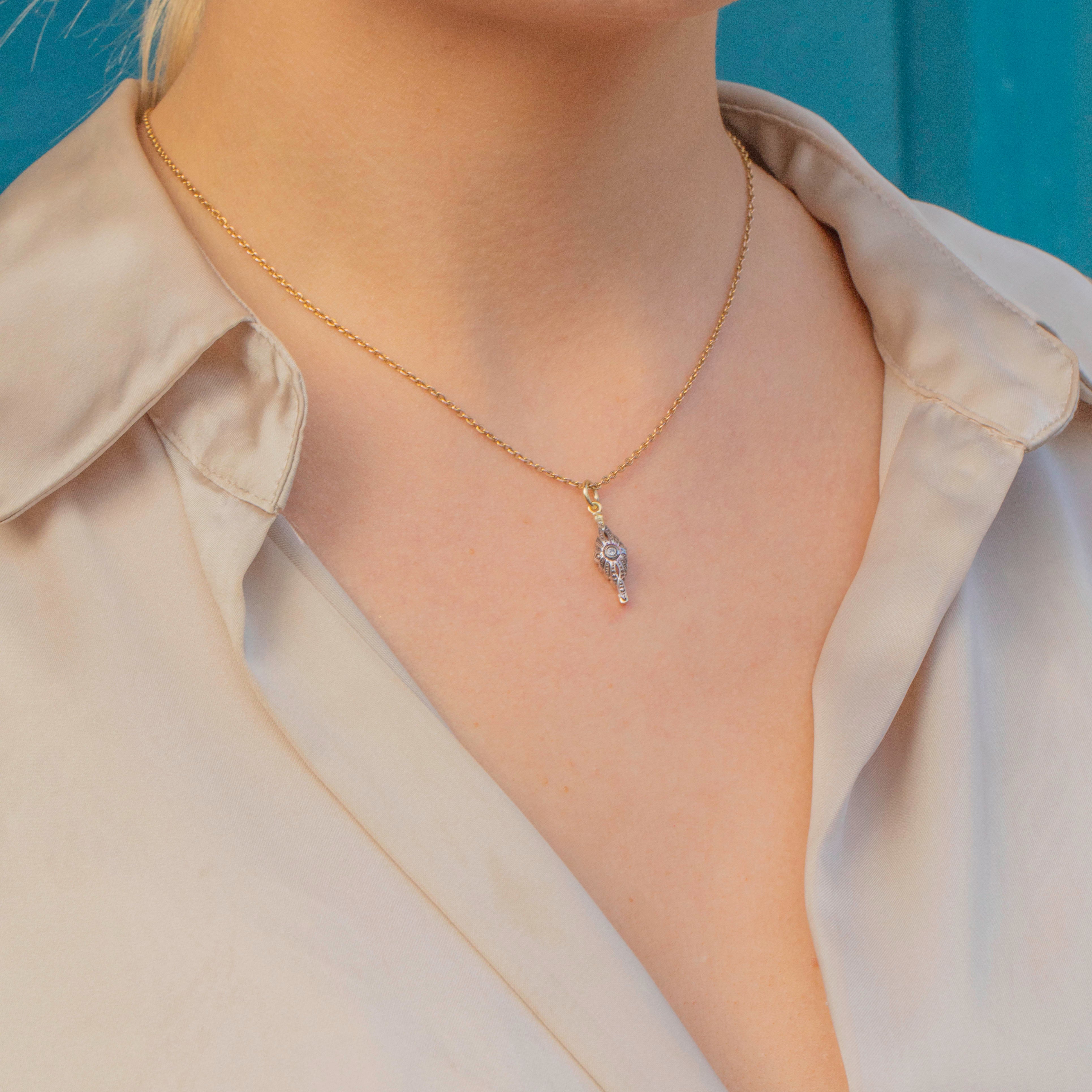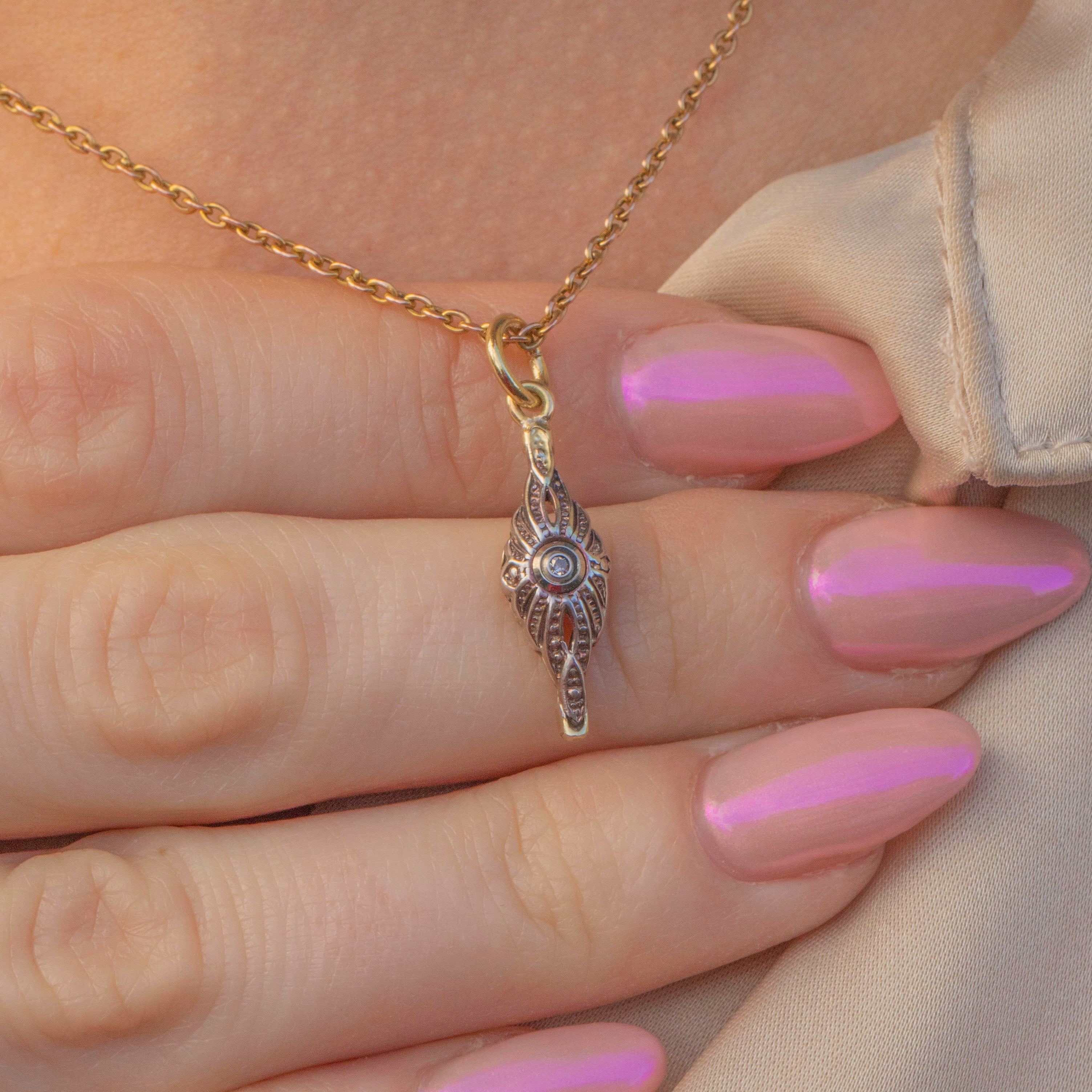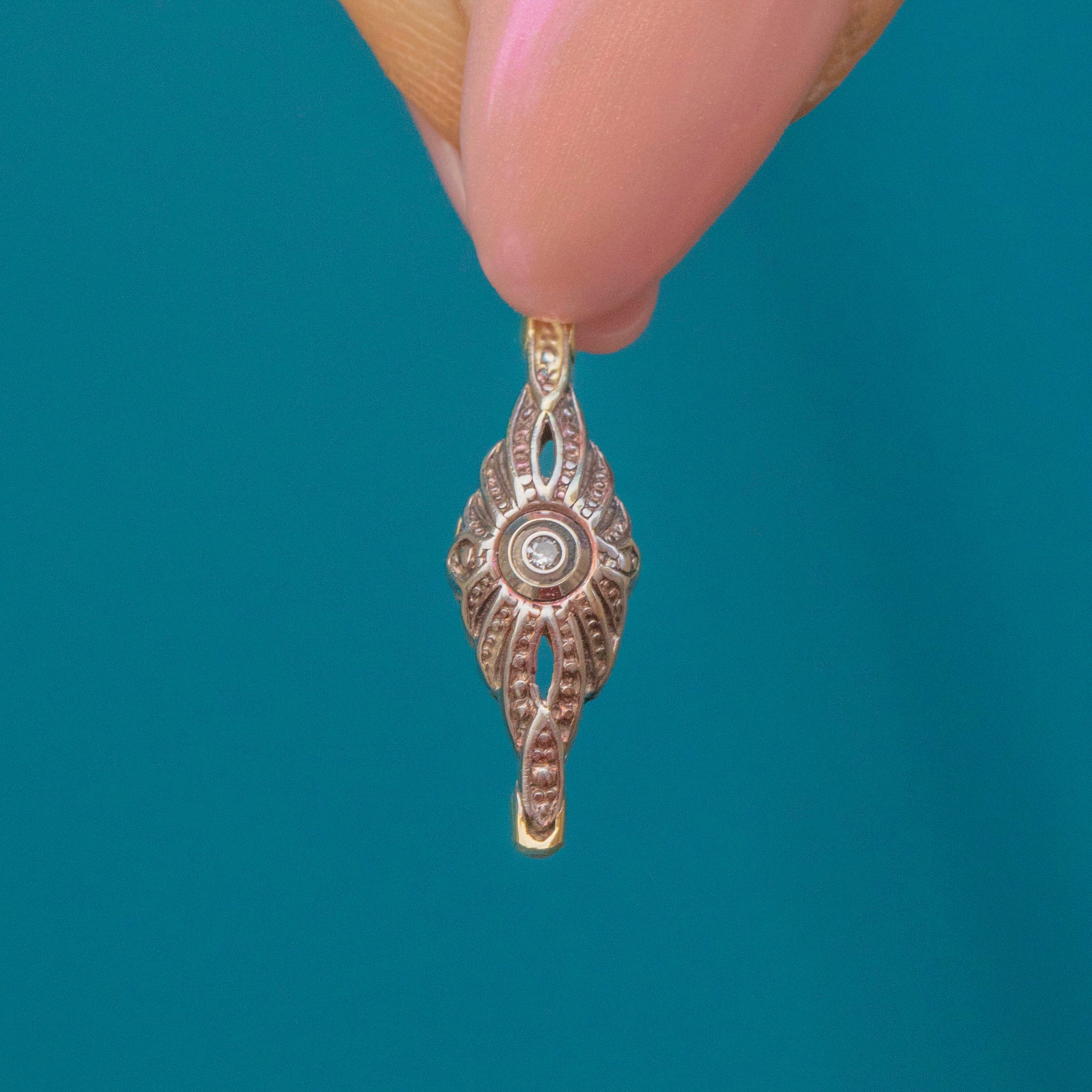 A dainty delight, this Art Deco charm will suspend prettily from a fine Gold chain, its lozenge form bringing elegance to your décolletage!